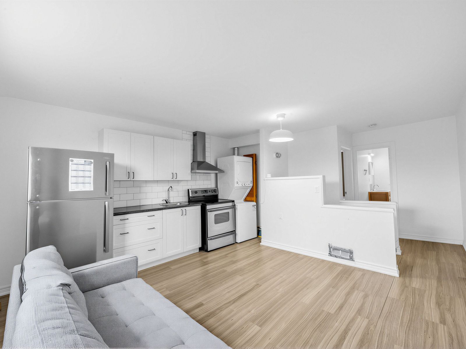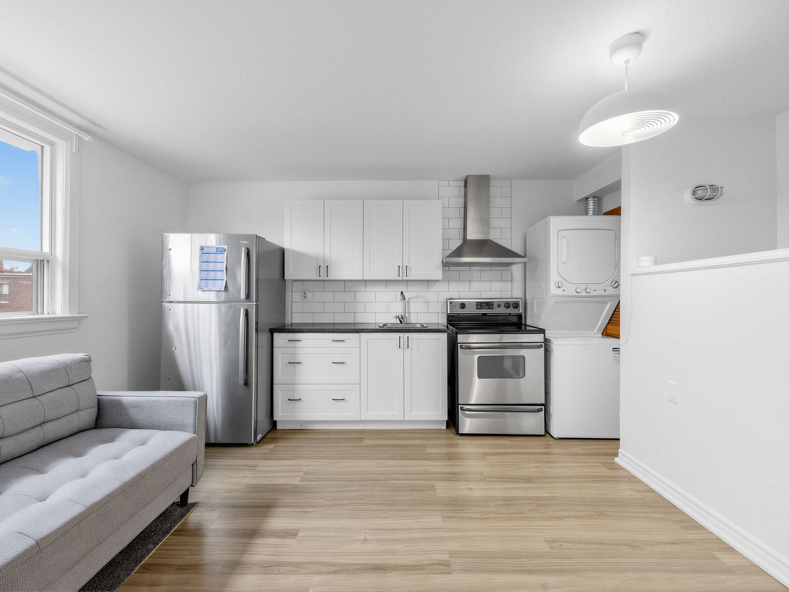 • Clean white kitchen with plenty of cabinetry and in-suite laundry.