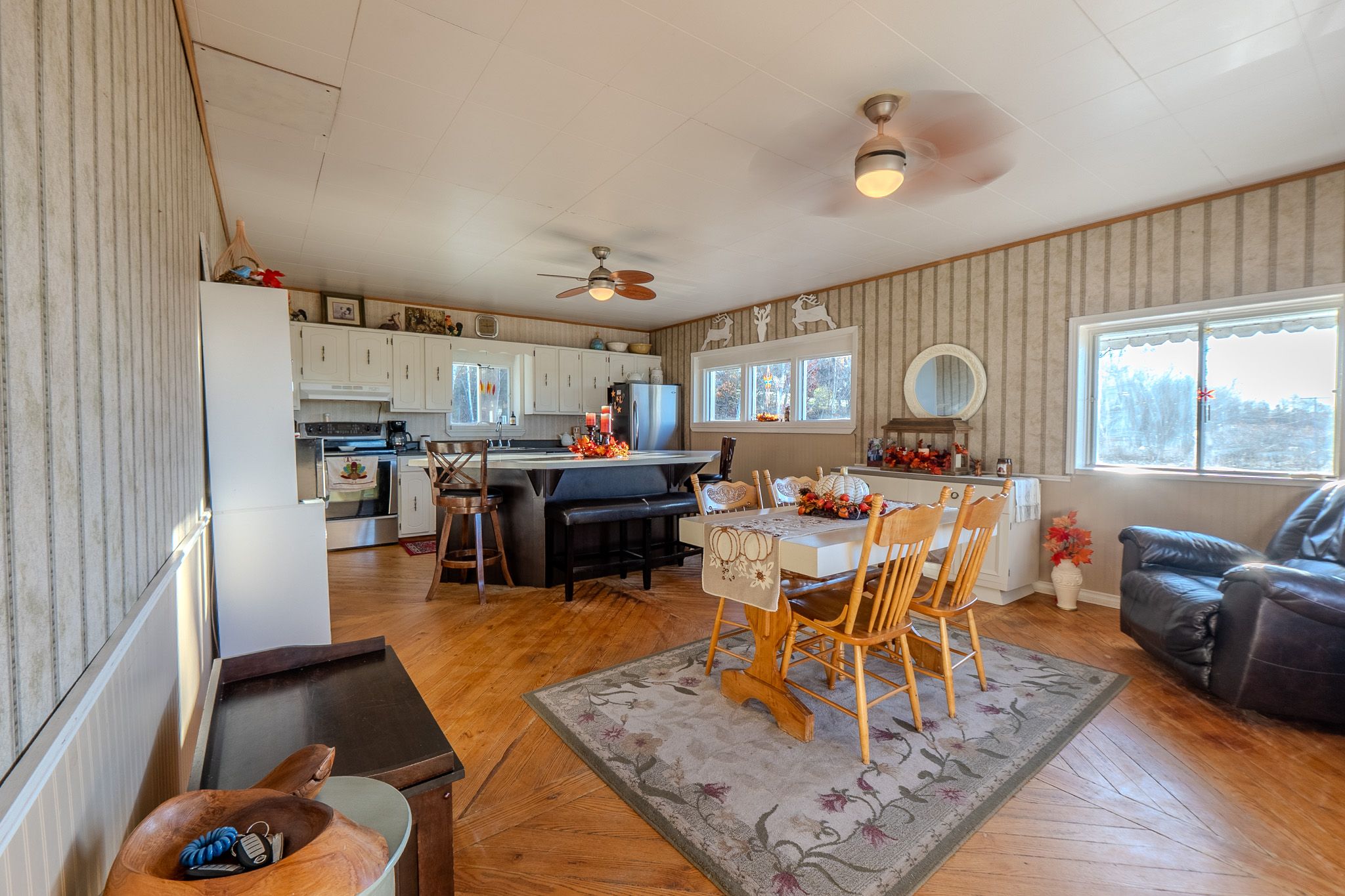 • Open kitchen, dining, and sitting area with large lake-view window.