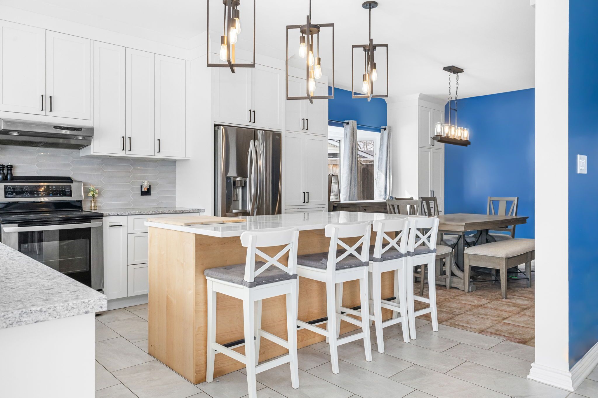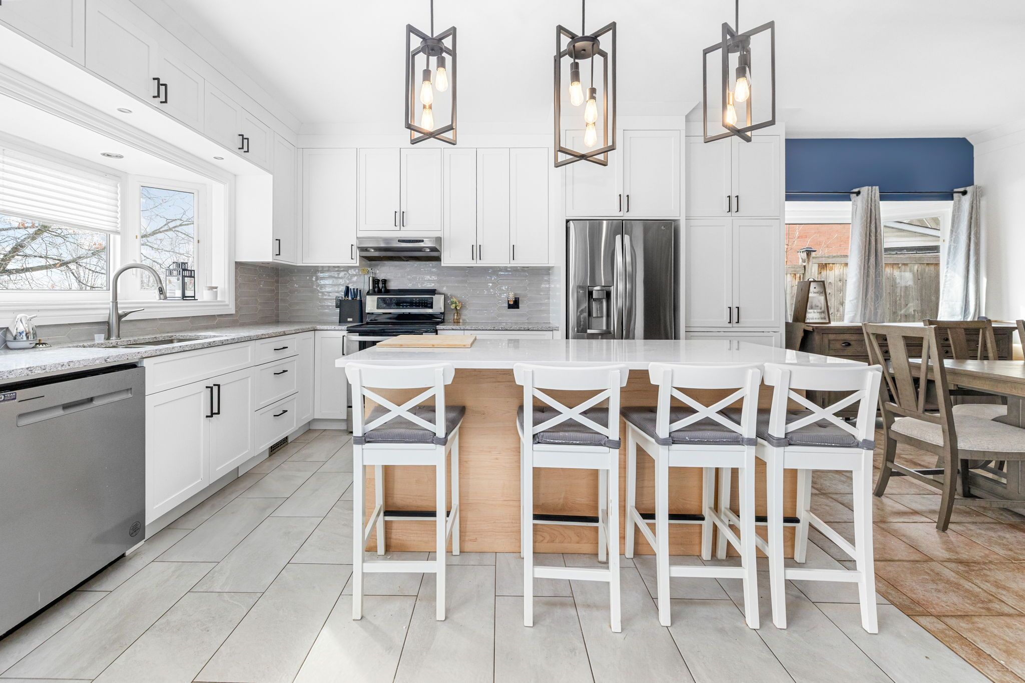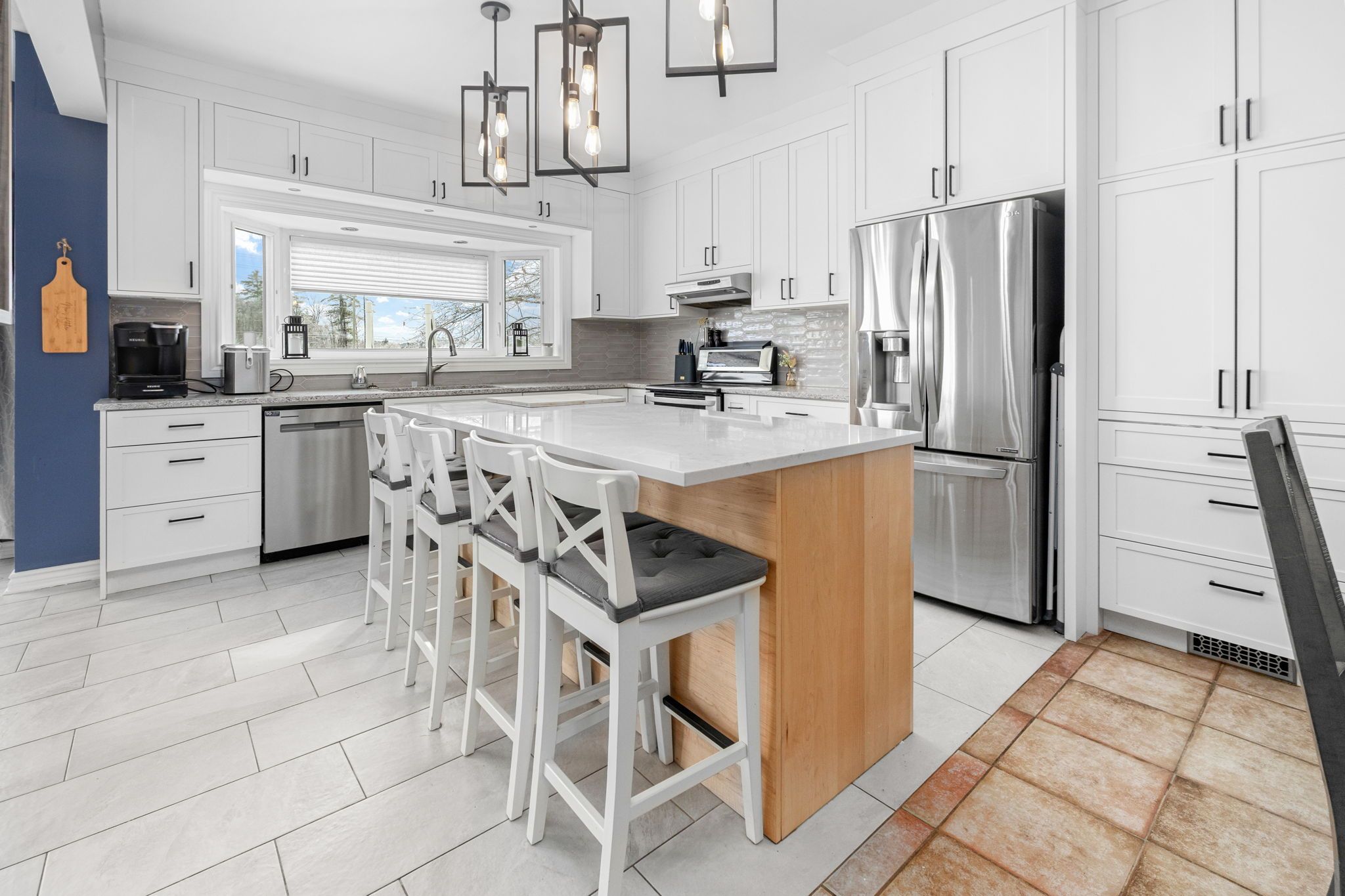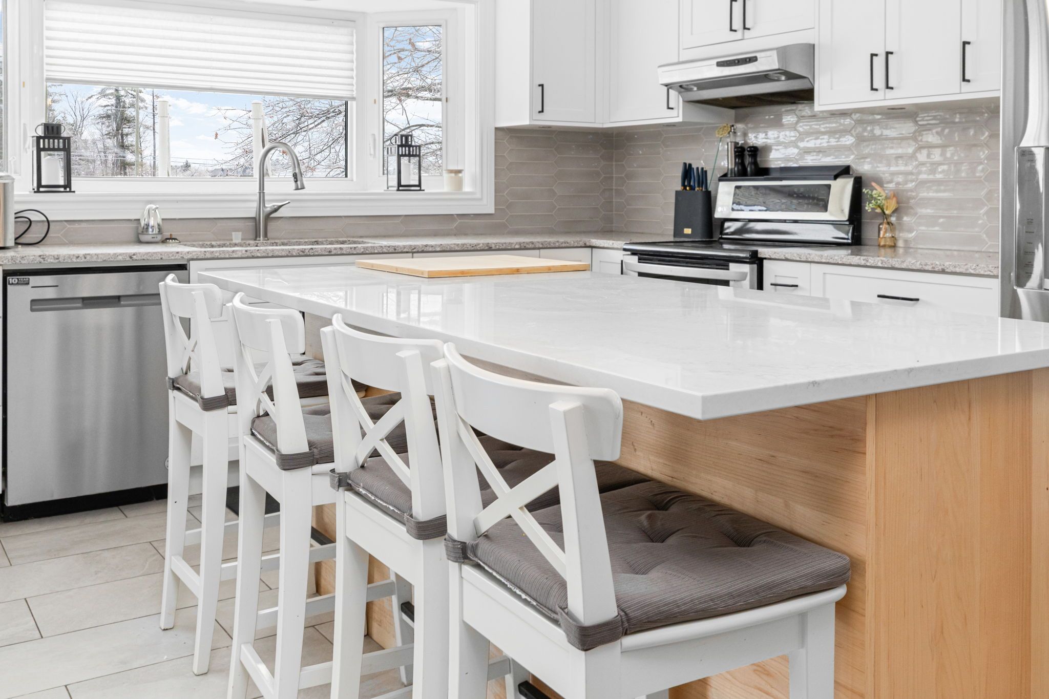 • Designer chef's kitchen features custom cabinets and modern quartz countertops.