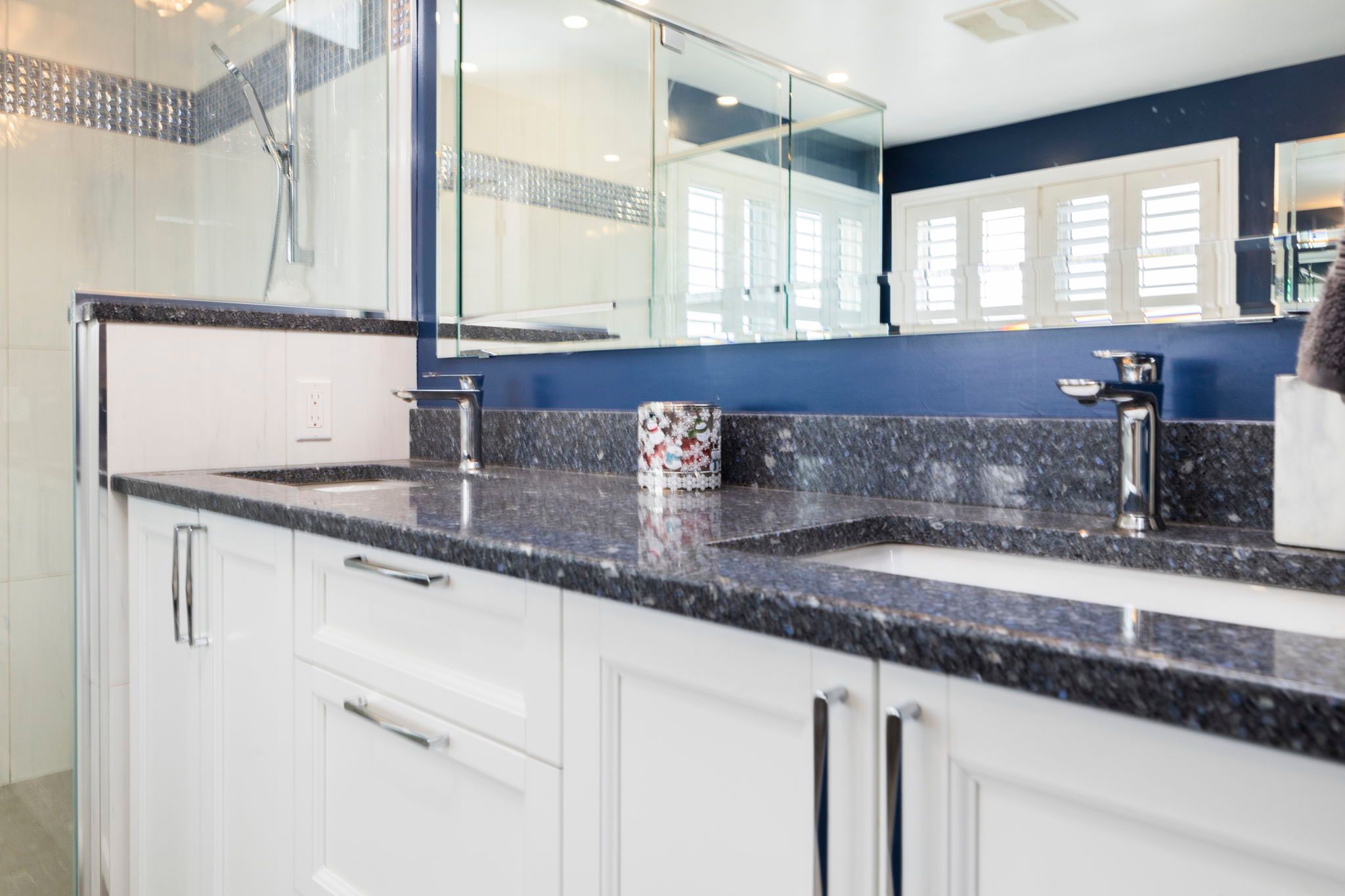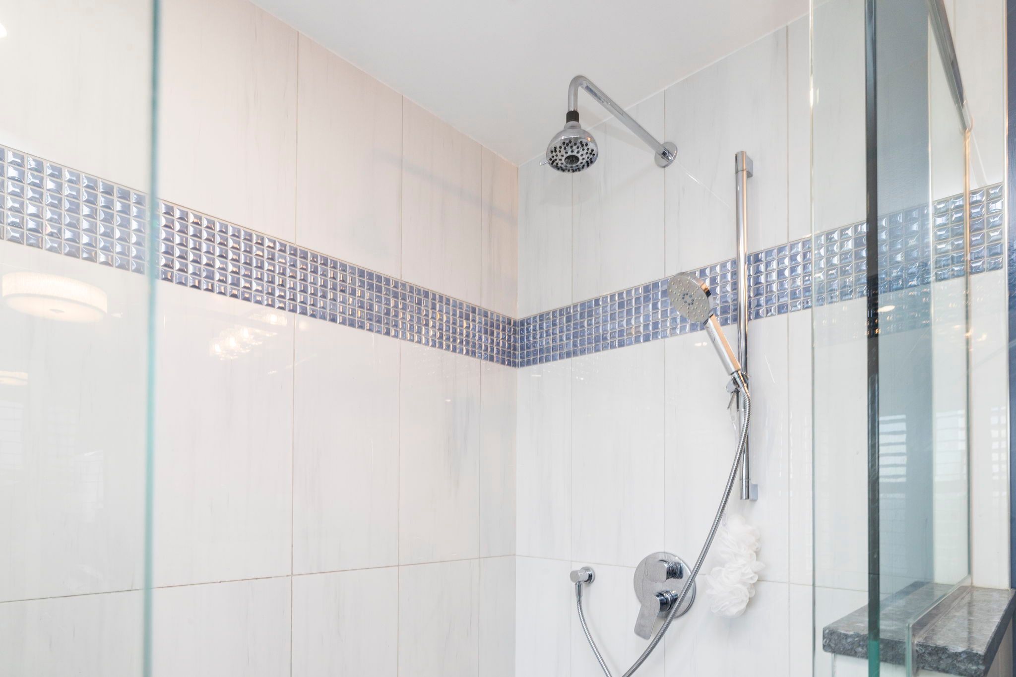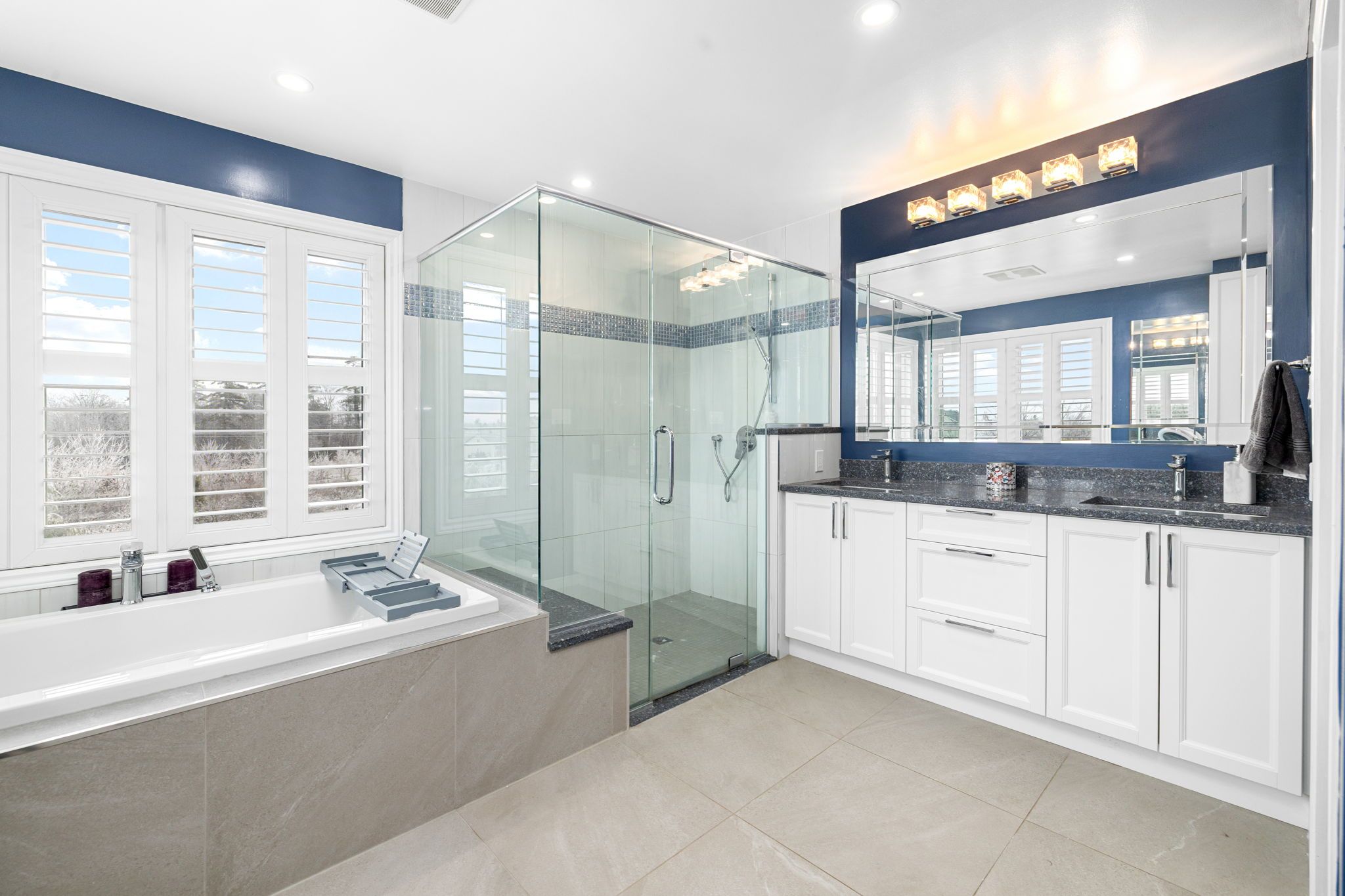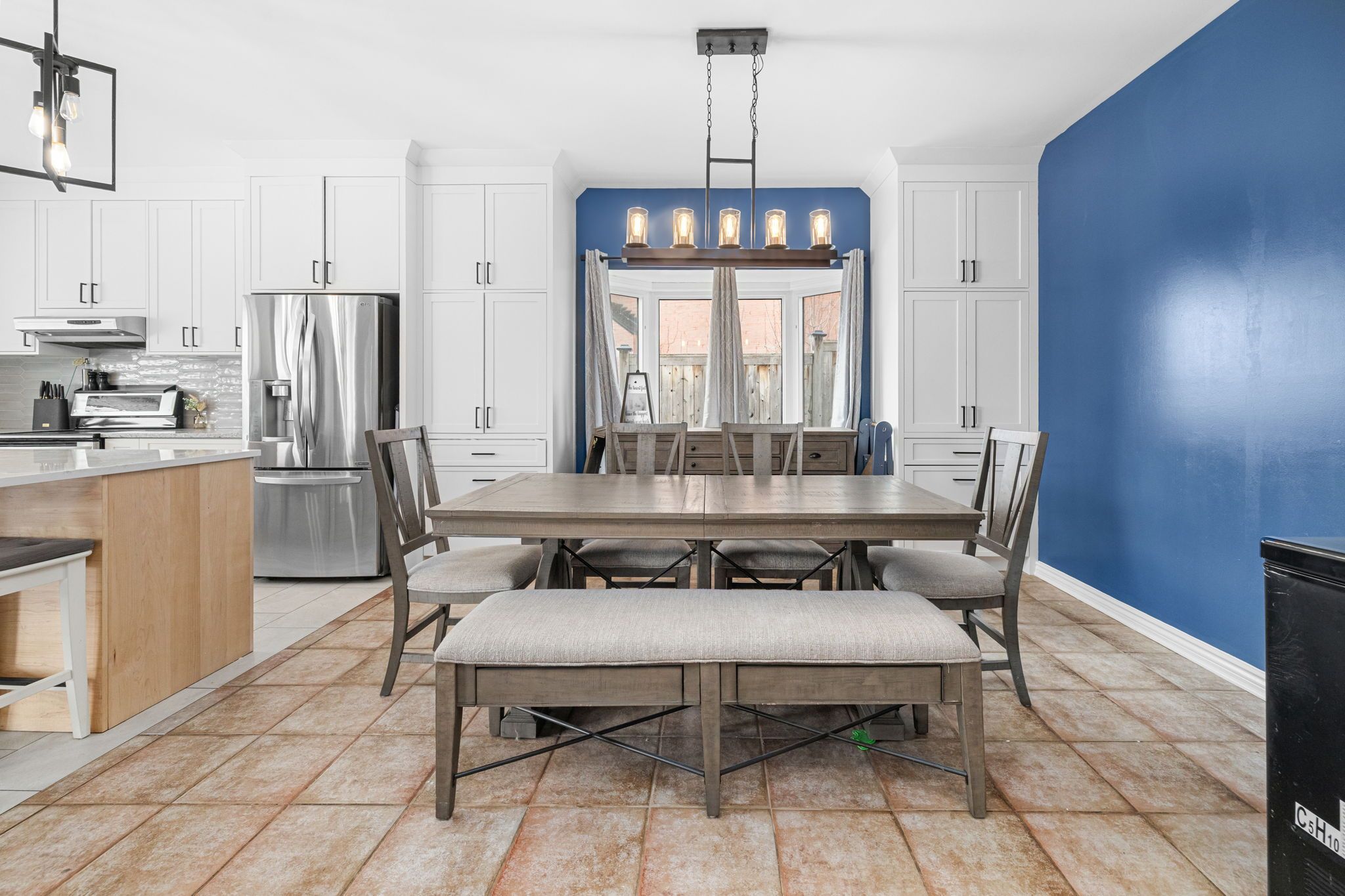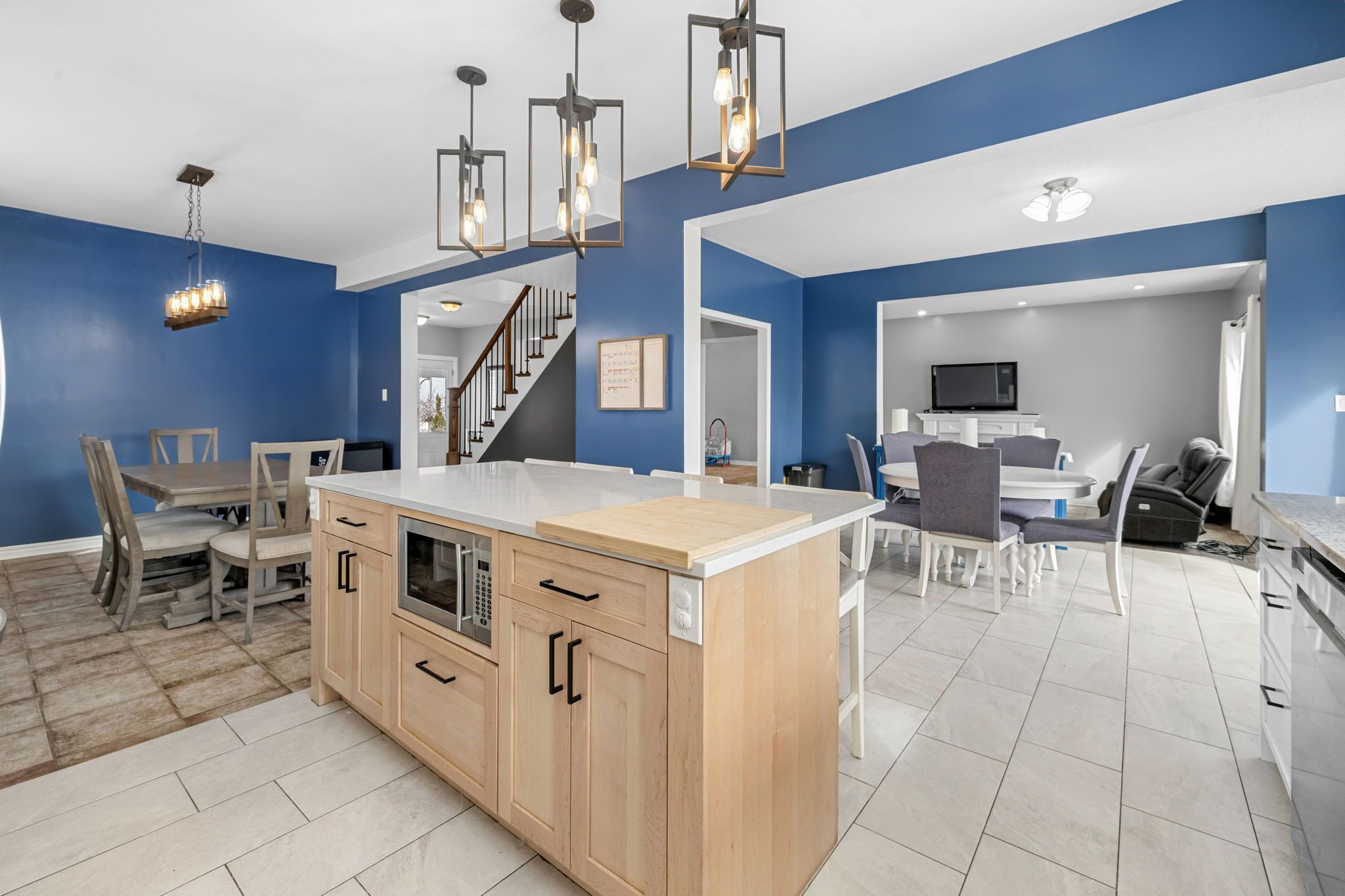 • Designer chef's kitchen features custom cabinets and modern quartz countertops.