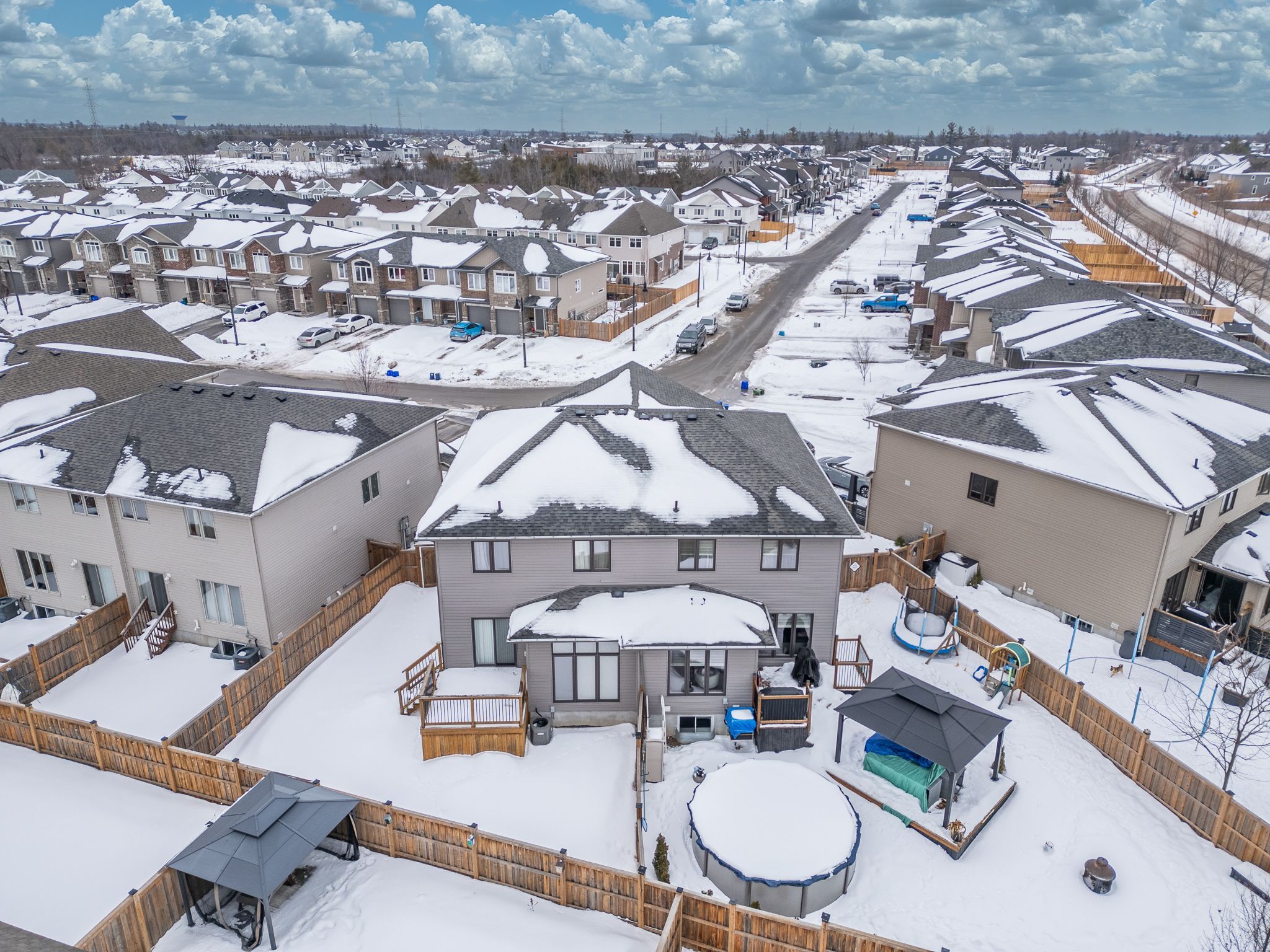 Welcome to1423 monarch drive! Discover this stunning 3-bed, 4-bath (2+2) semi-detached home, perfectly situated in kingston's woodhaven community this bright and airy residence features a modern open-concept main floor with upgraded light fixtures throughout, perfect for both busy family life and weekend entertaining. The chef-inspired kitchen boasts a generous center island, sleek quartz countertops, and a dedicated coffee bar with extra pantry storage-an ideal setup for morning routines and holiday feasts. Upstairs, you'll find three generous bedrooms, including an extra large primary retreat complete with a walk-in closet and a private 4-piece ensuite. For added convenience, the laundry room is located on the second level. The finished lower level offers a versatile recreation room with built-in speakers, pot lights, & 2 pc bathroom, ideal for a home office or gym. Step outside to your own backyard oasis. This fully fenced, pie-shaped retreat boasts a large deck, an inviting above-ground pool, and a stylish hard-top gazebo, creating the perfect setting for summer bbqs and year-round relaxation. Located just steps from parks, walking trails, and the brand-new st. Genevieve catholic elementary school, this home offers the perfect blend of upgraded style and unbeatable convenience