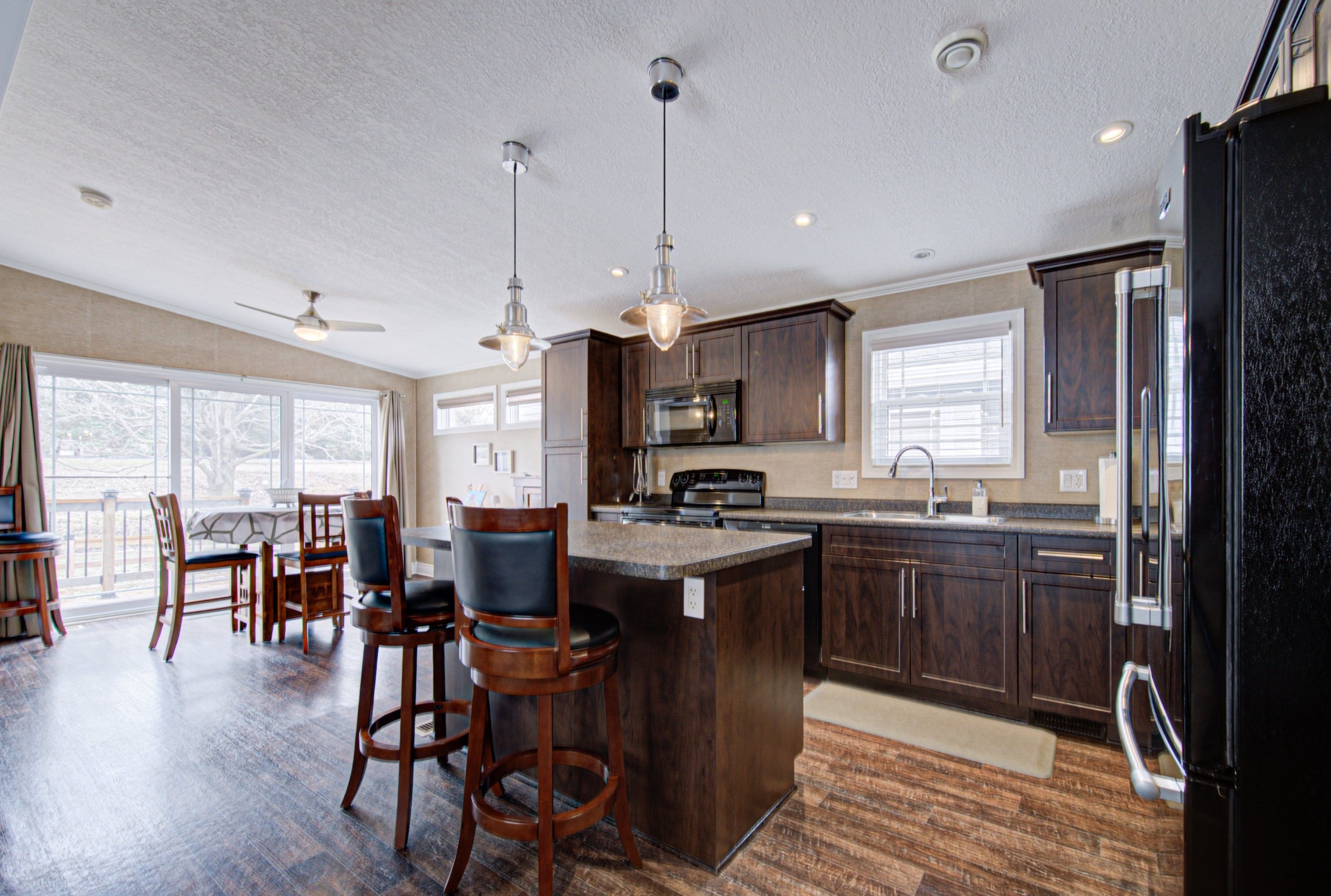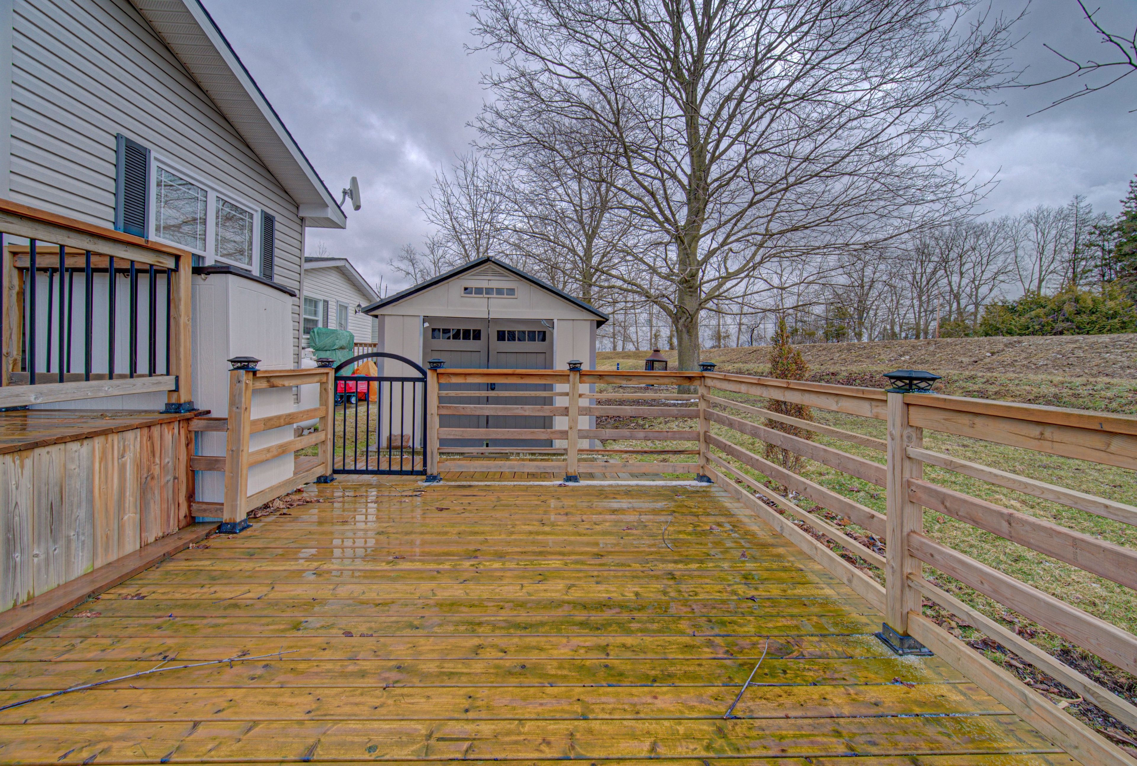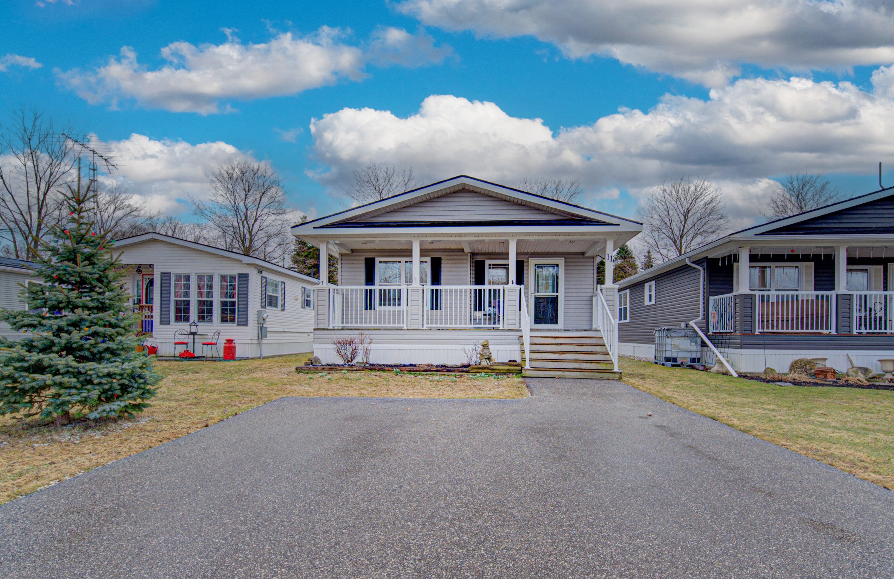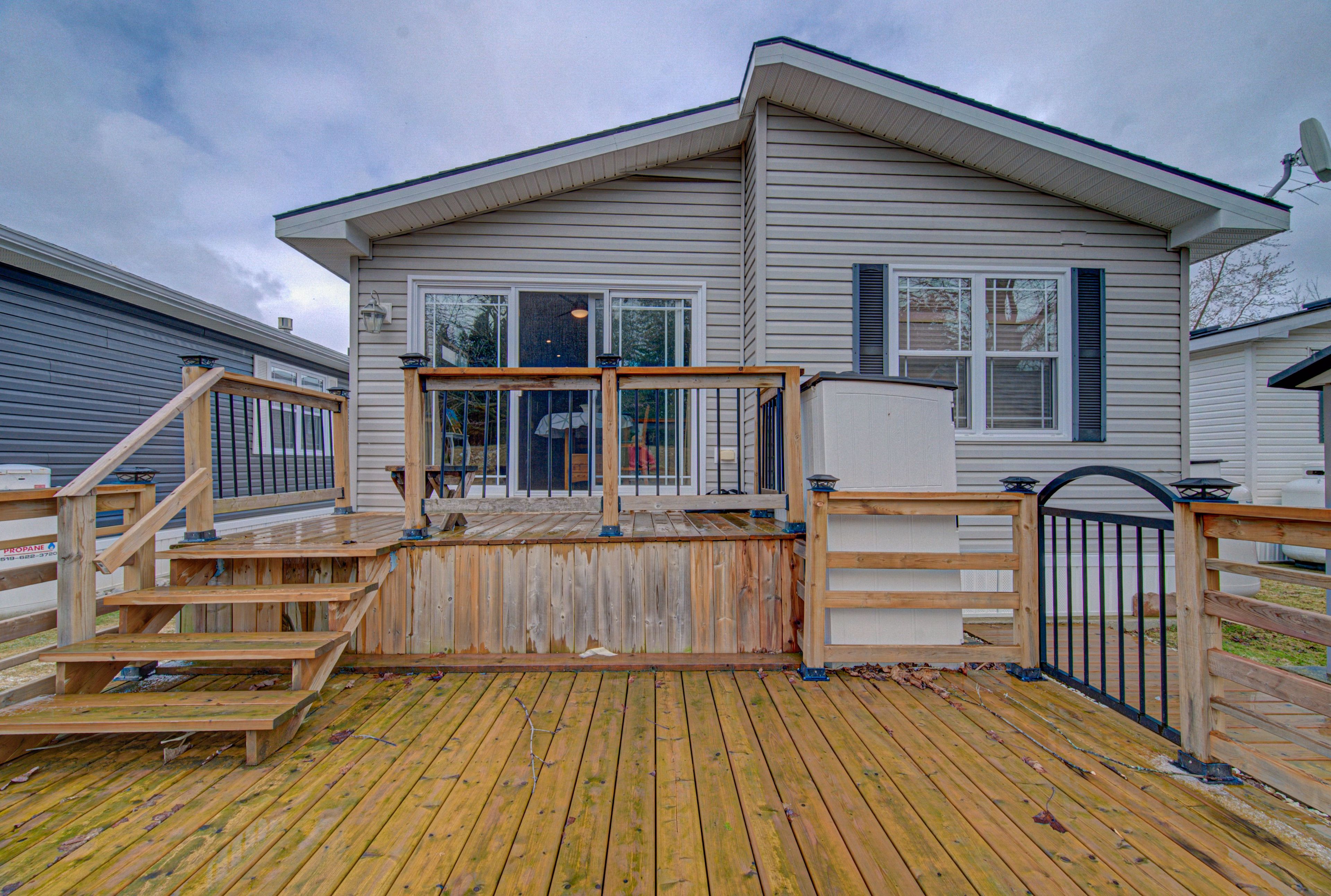 11 sun valley rd: your year-round oasis. Welcome to 11 sun valley road, a beautifully maintained northlander model nestled within the prestigious john bayus park. This home offers a tranquil retreat for those seeking an active, social lifestyle, perfectly positioned just minutes from the conveniences of cambridge and hamilton. The heart of the home features a bright, open-concept layout designed for effortless entertaining. A spacious kitchen, complete with a central island and abundant cabinetry, flows seamlessly into the inviting living area. Nearby, the dining room's sliding doors open to a private rear deck and yard, perfect for morning coffee or evening relaxation. This residence boasts 2 generous bedrooms, including a primary suite with a private 3-pc ensuite. Spanning over 1,100 sqft of year-round living space, the home is equipped with modern essentials: a cozy gas fireplace, central air, a water softener, in-suite laundry, and a dedicated storage shed. Experience the best of this sought-after 50+ community, where amenities like a fishing pond, swimming beach, pickleball courts, and a vibrant community center await.