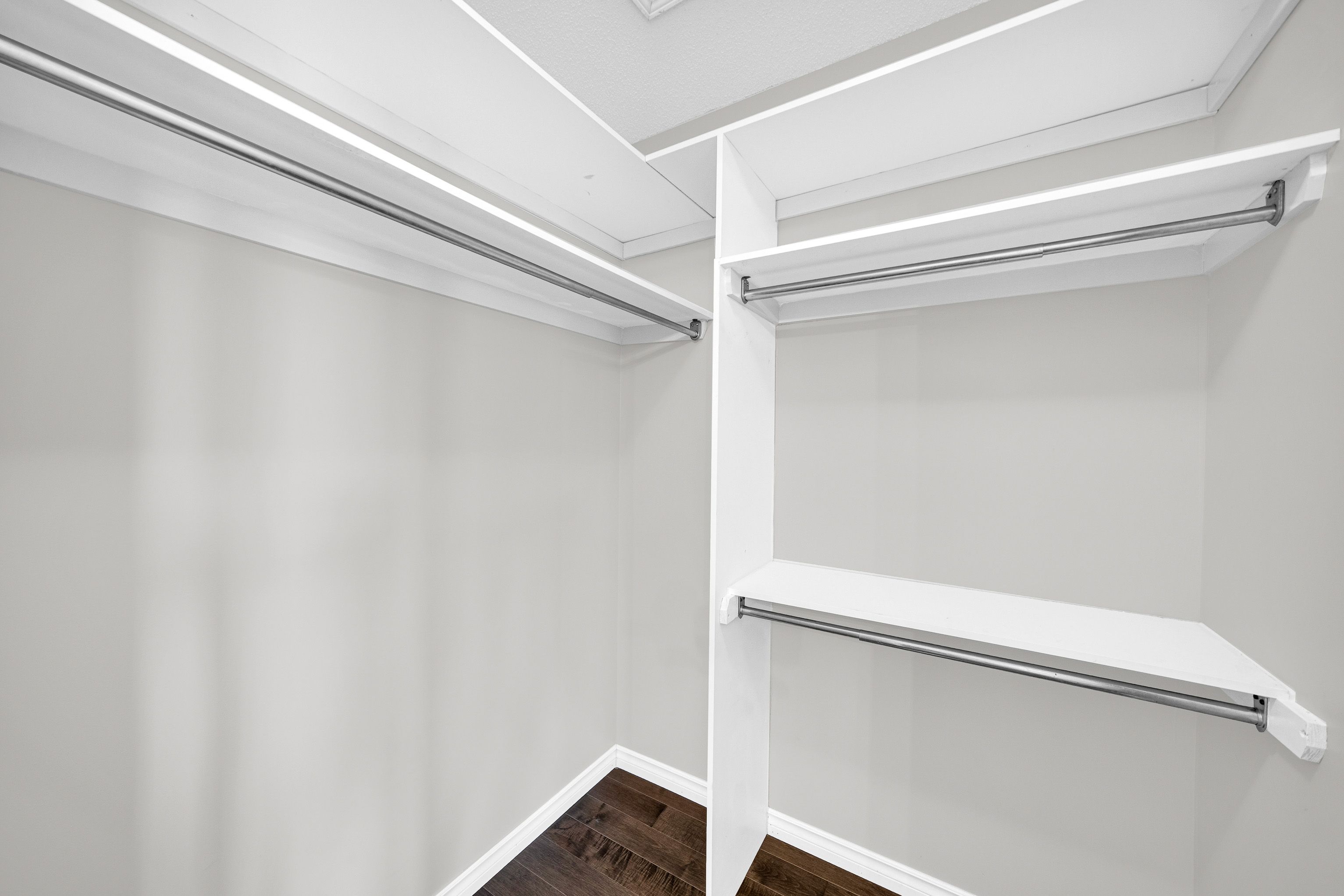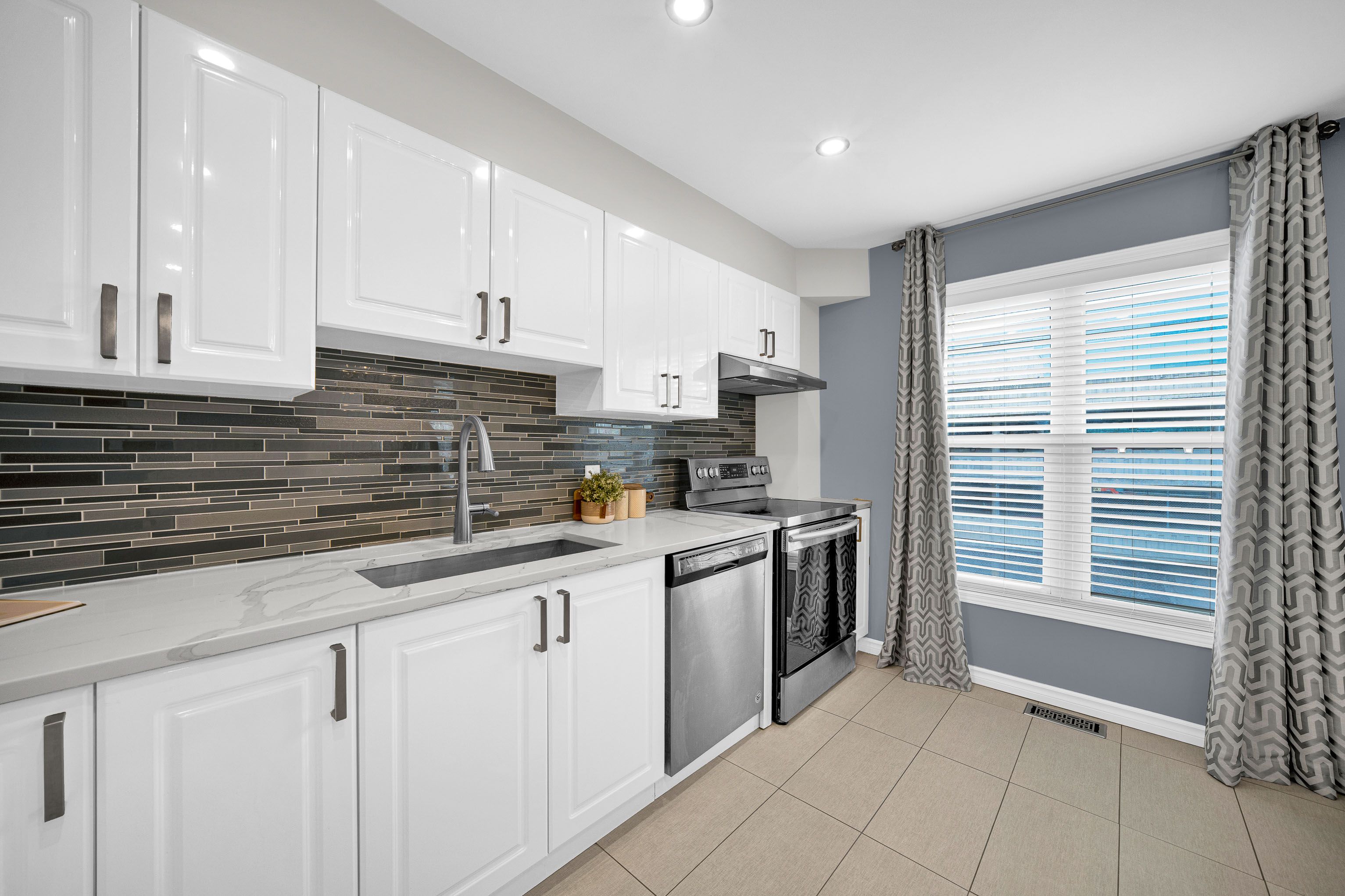 • South-facing kitchen with quartz counters and stainless steel appliances.