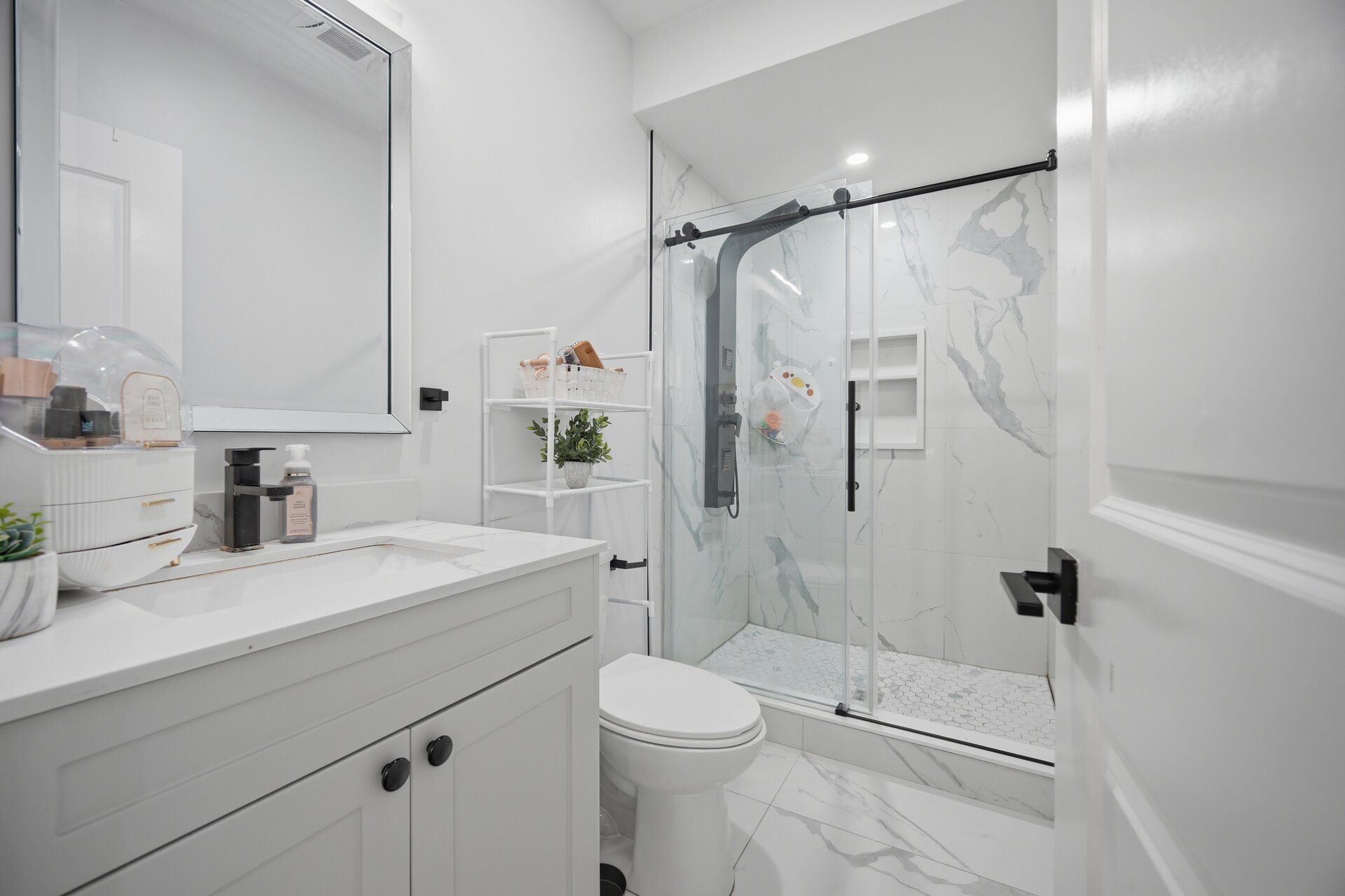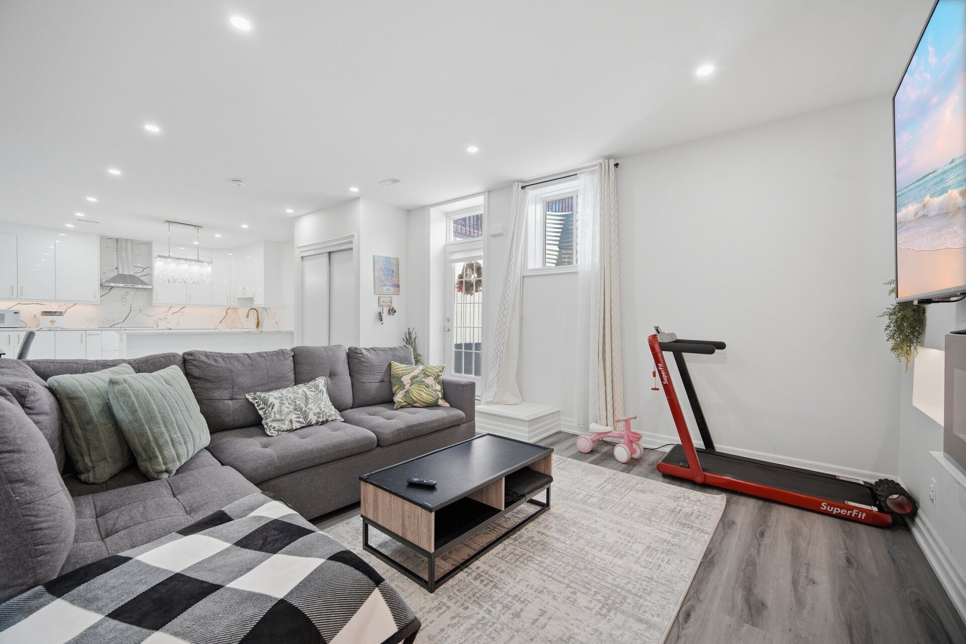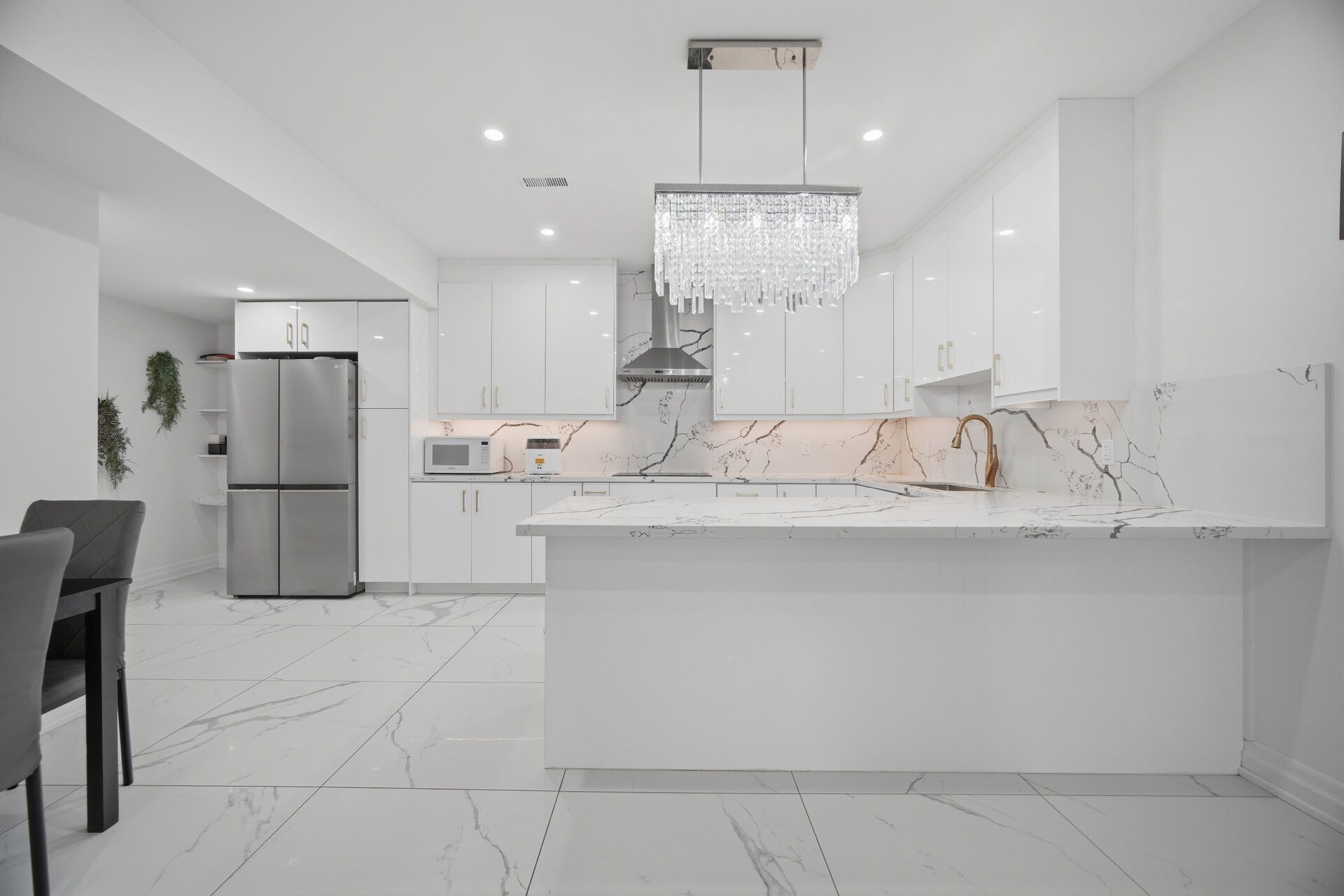 • Modern kitchen features high-end appliances and quartz countertops.