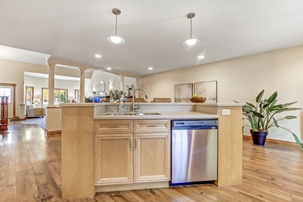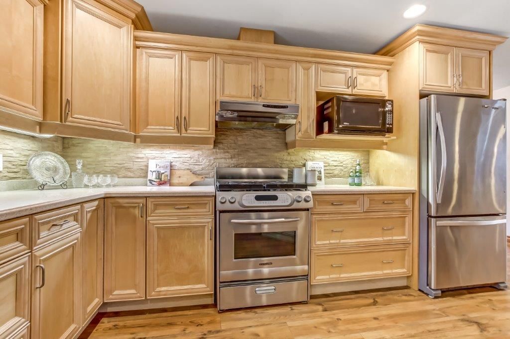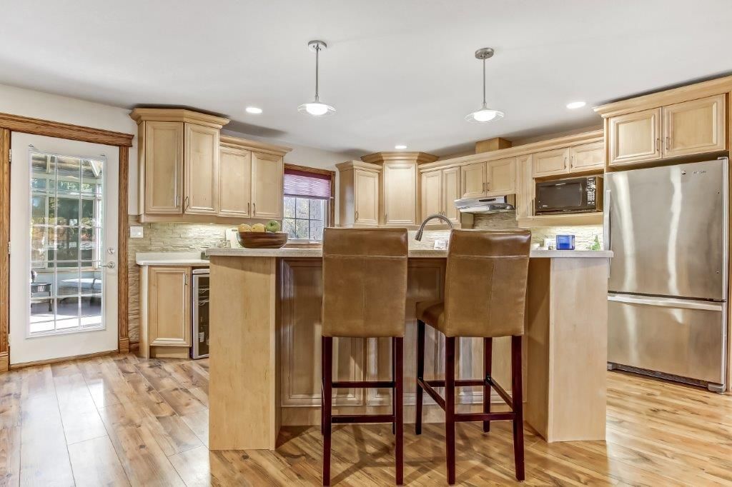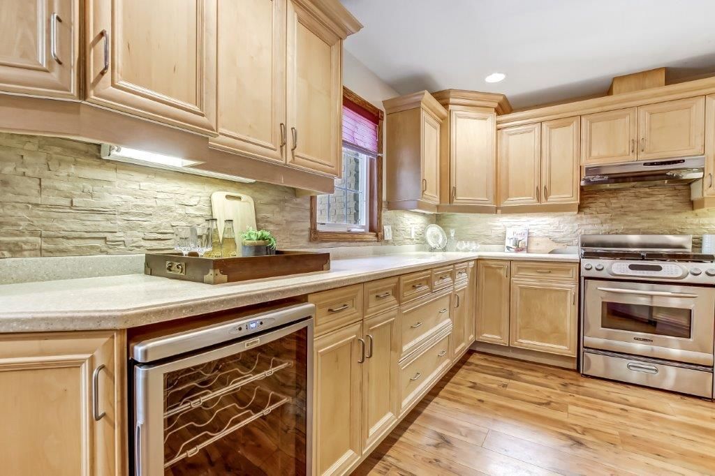• Chef's kitchen with gas stove, wine cooler, and breakfast bar.