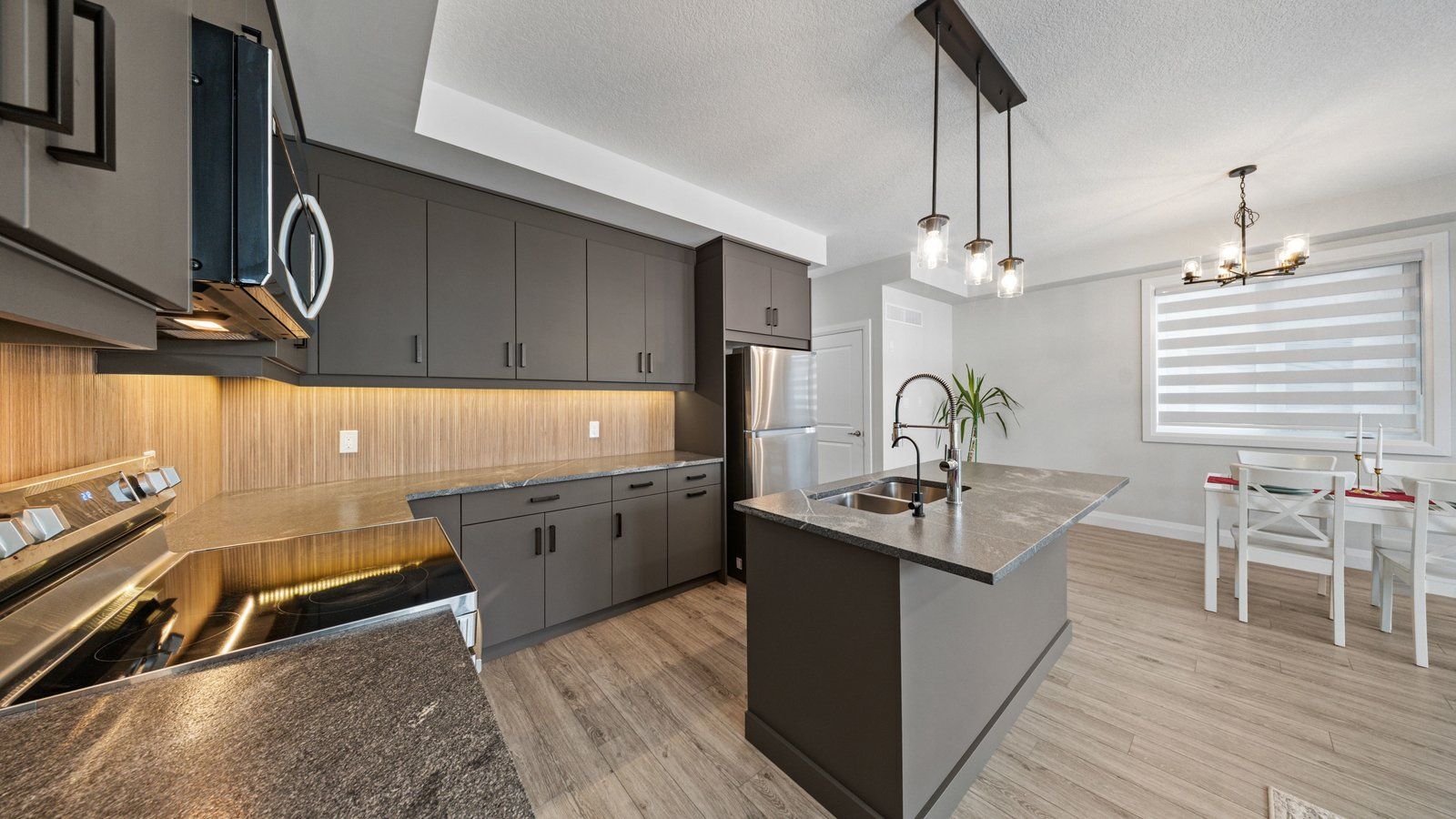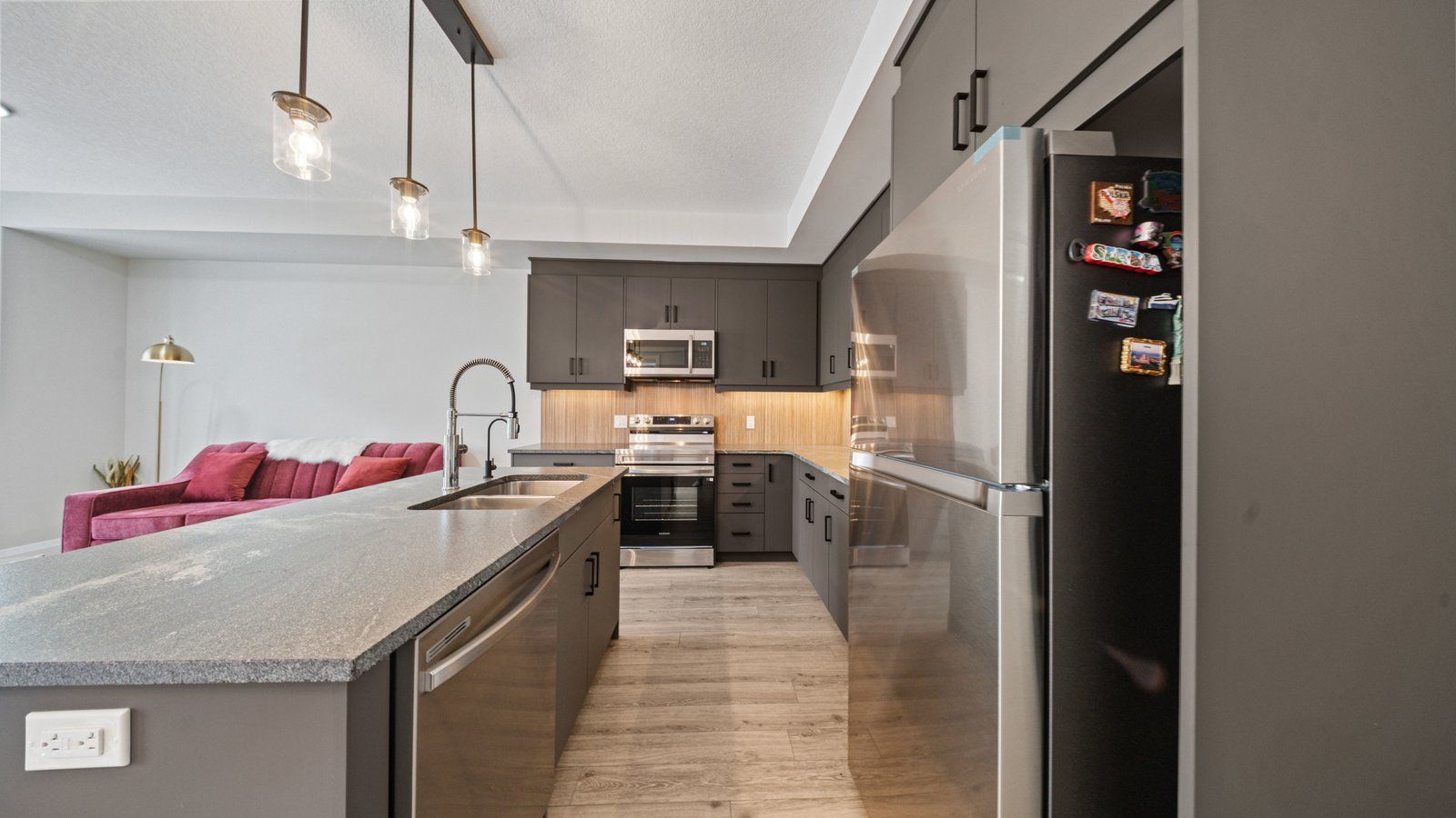 • Stylish kitchen with stainless steel appliances and spacious island.
