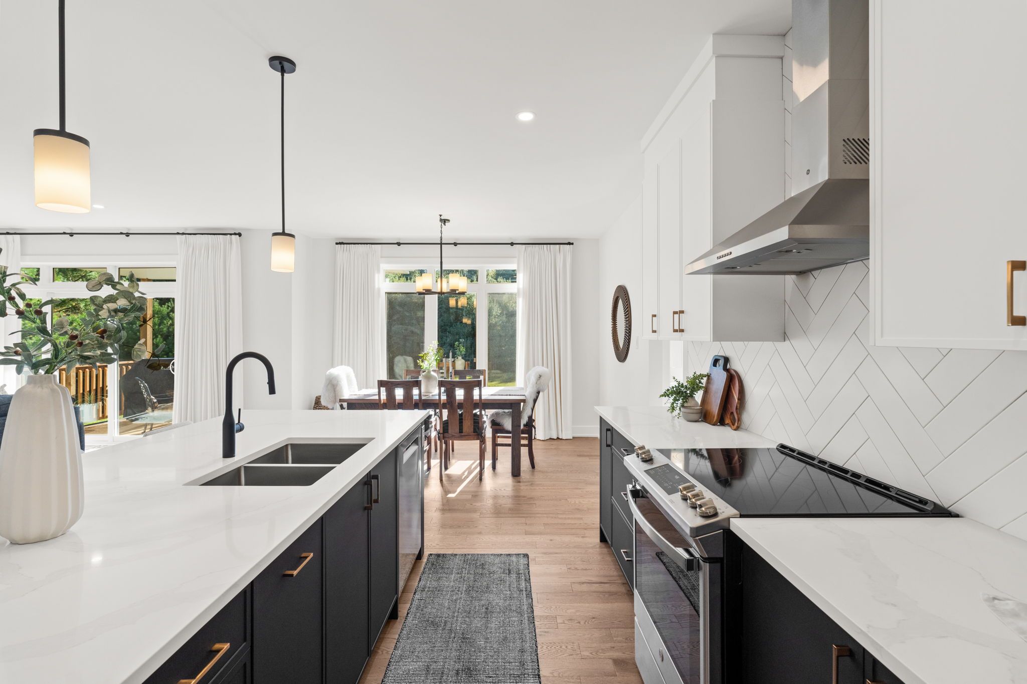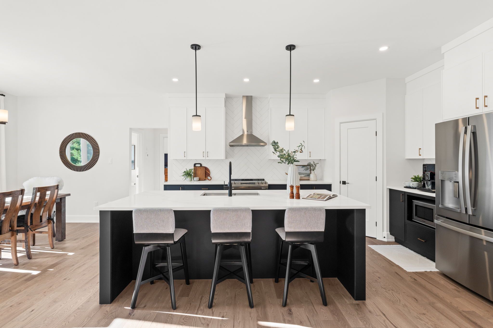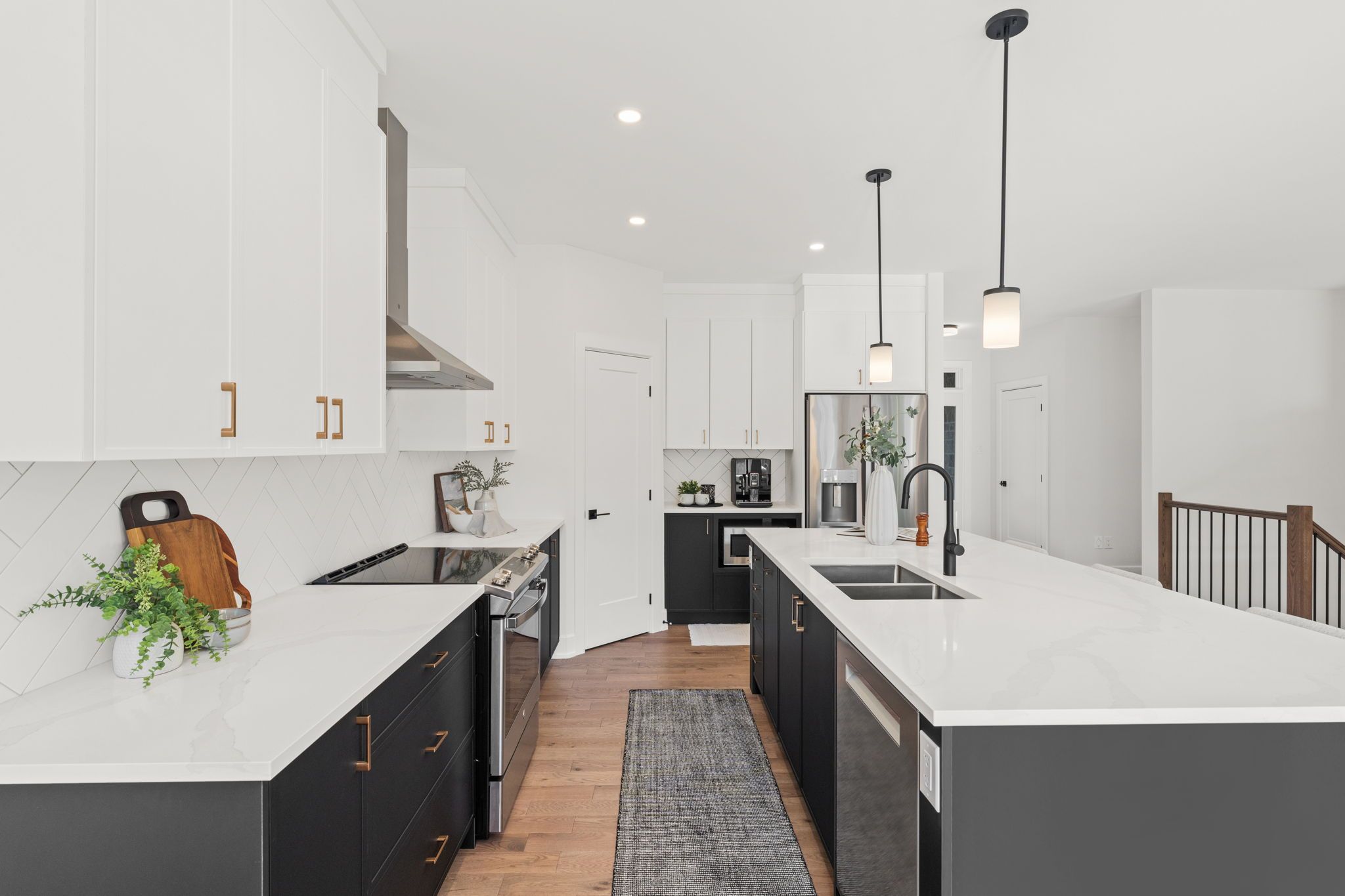 • Stylish two-toned kitchen with quartz countertops and a convenient centre island.