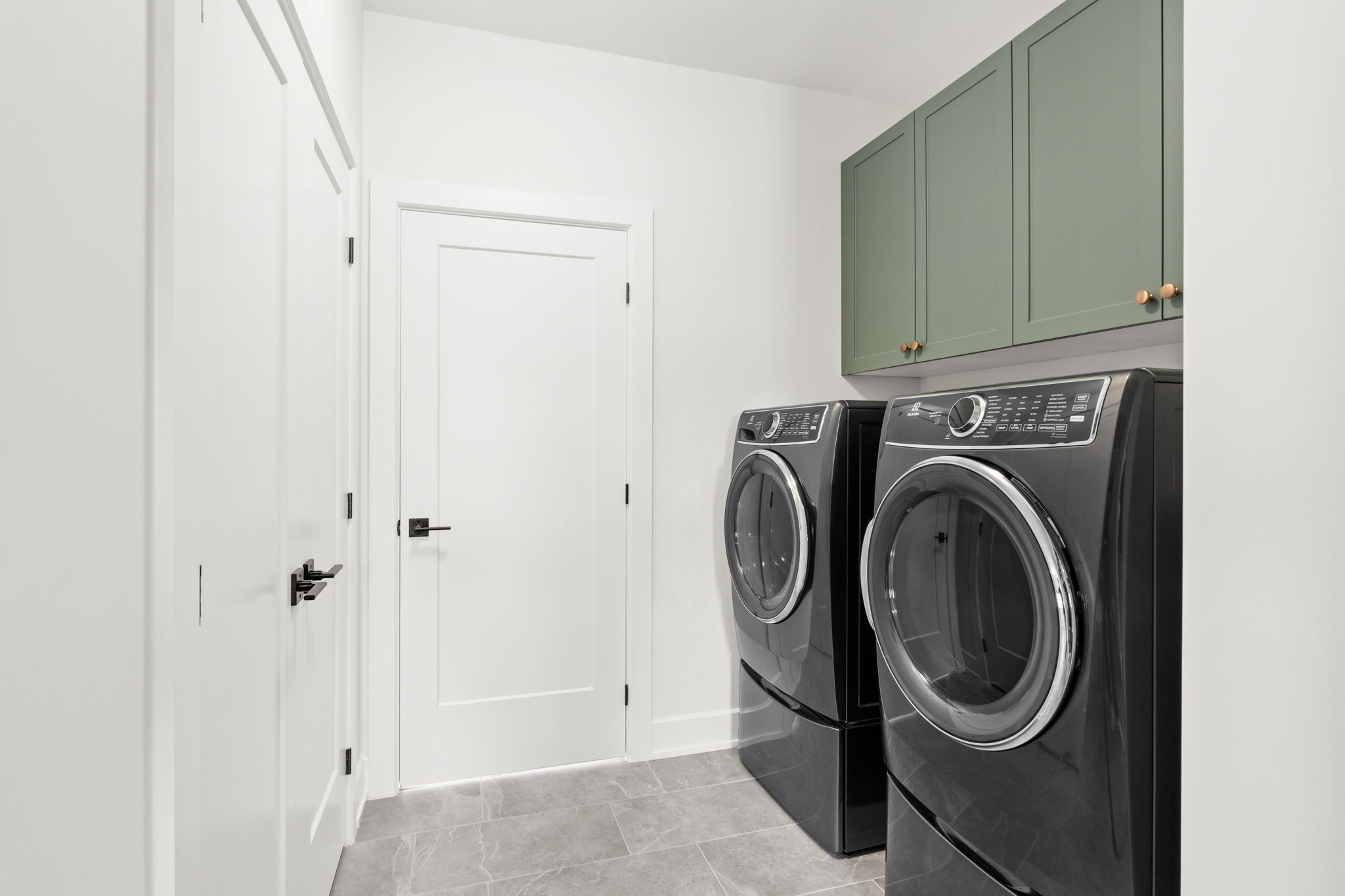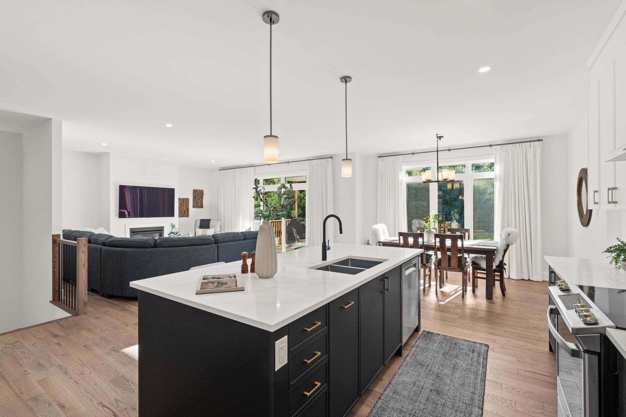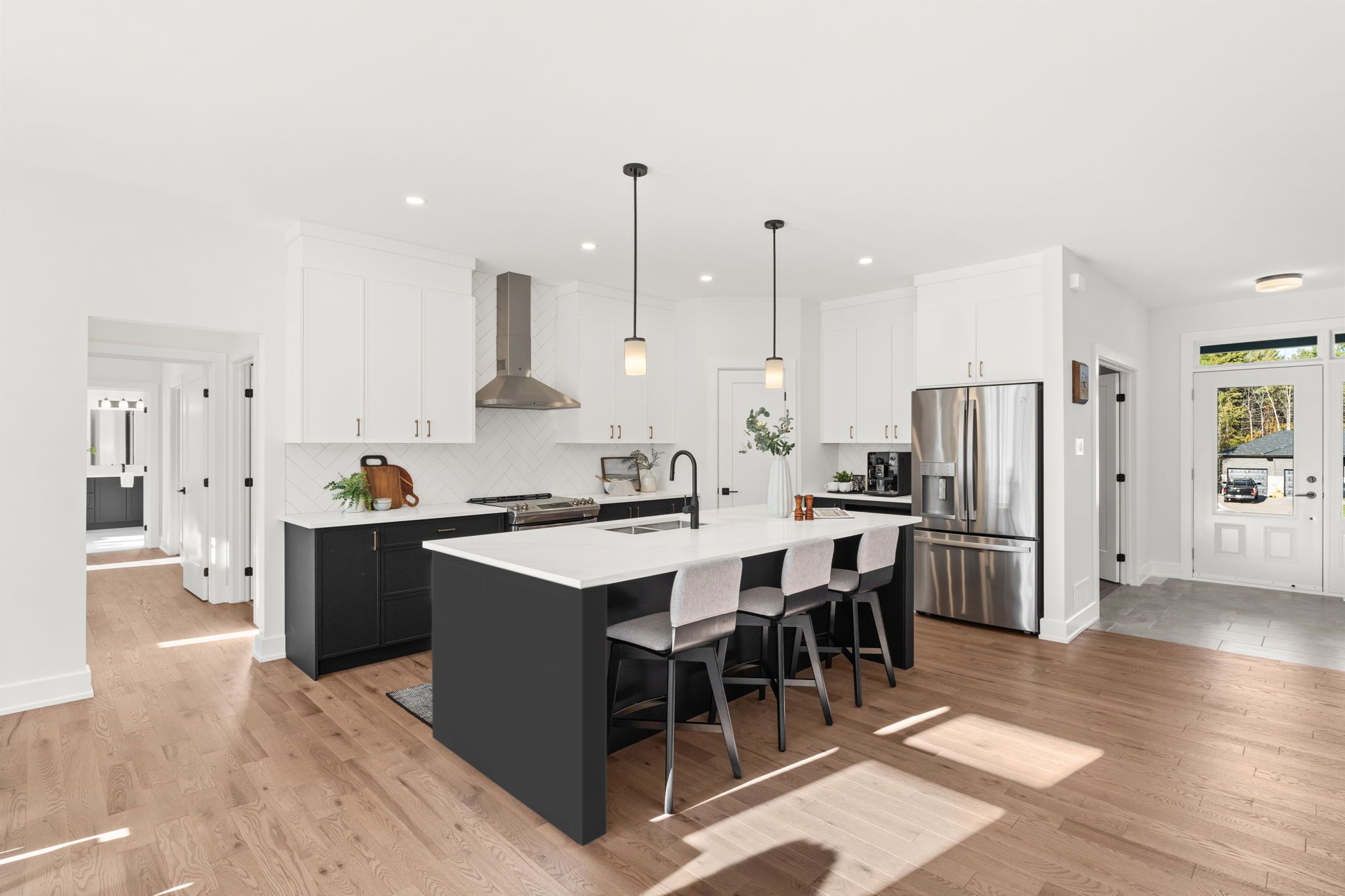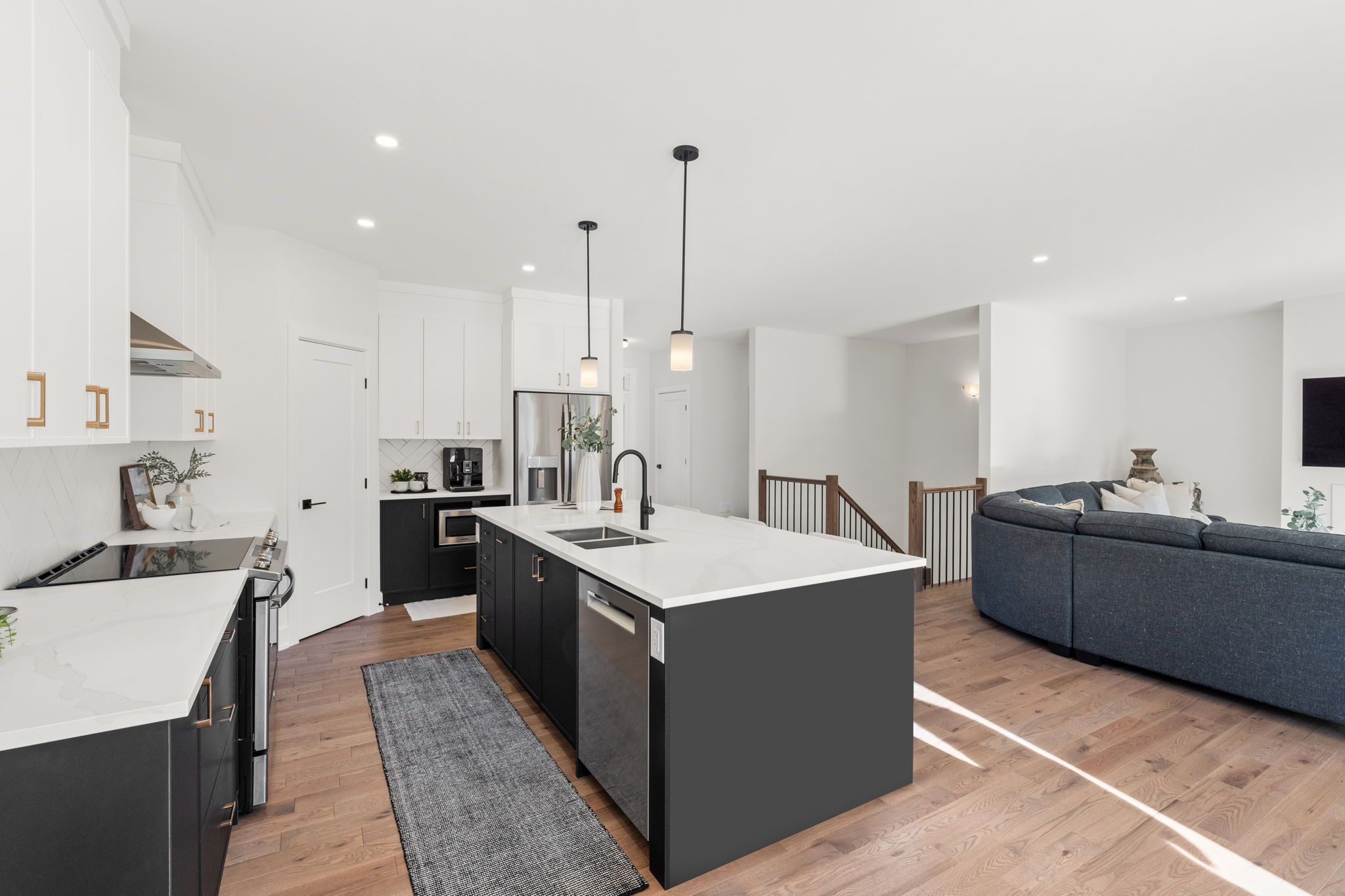 • Stylish two-toned kitchen with quartz countertops and a convenient centre island.