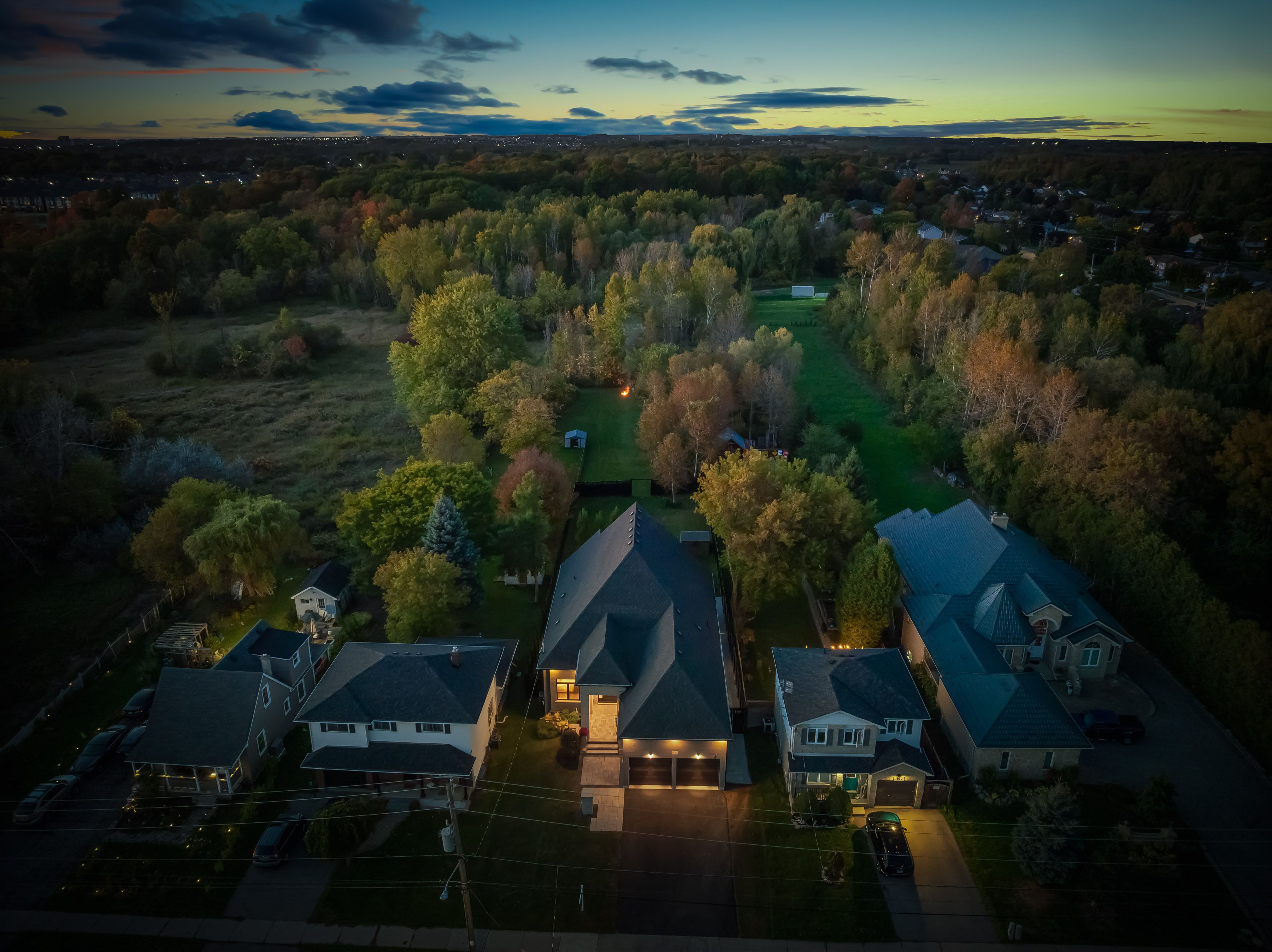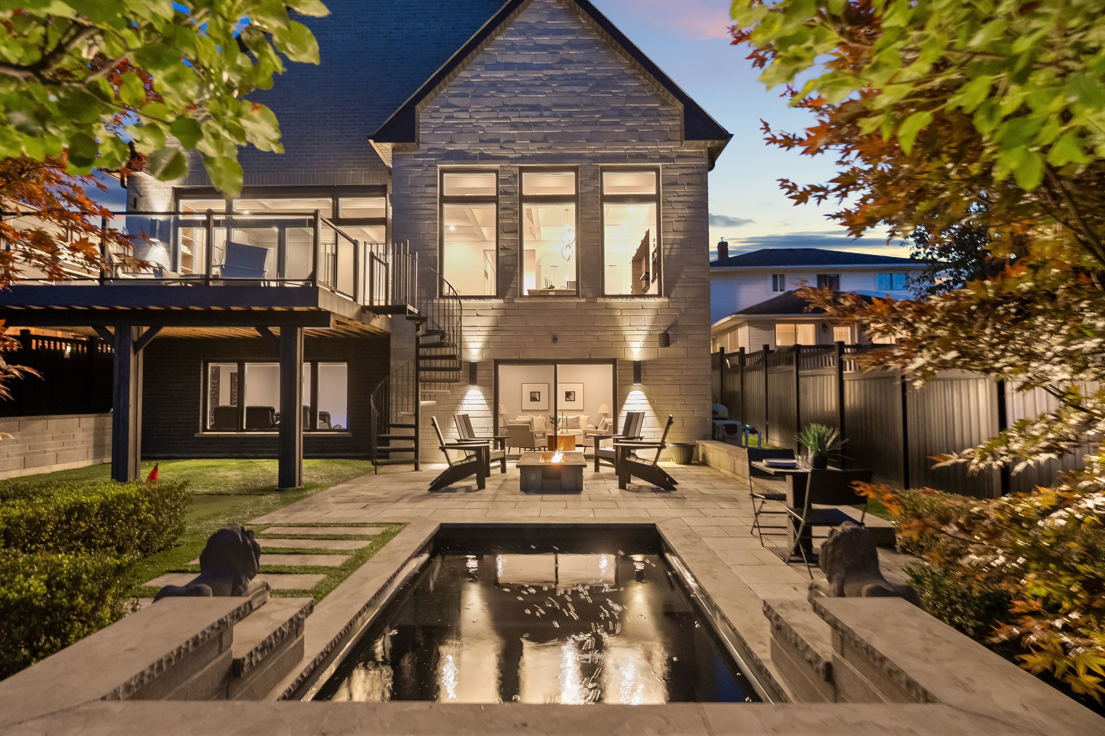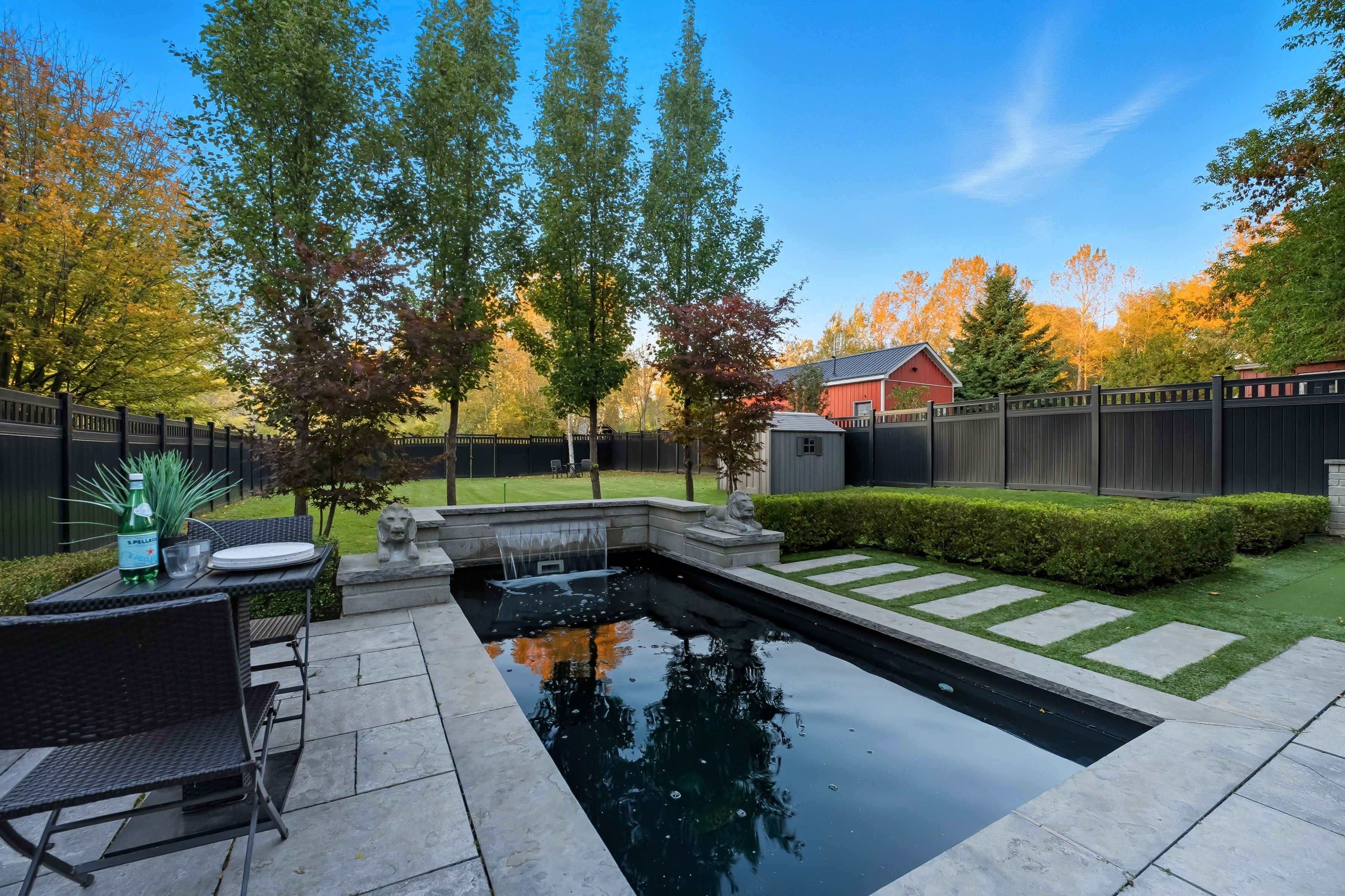 Welcome to an extraordinary custom-built estate offering over 4,000 square feet of luxurious living space on a meticulously landscaped 1. 35-acre lot. Originally built in 2018 and enhanced with hundreds of thousands in recent high-end renovations, this home is a flawless blend of sophistication, comfort, and modern design. From the moment you arrive, you'll be captivated by the grand covered porch, new fluted glass entryway, and stunning curb appeal. Inside, soaring vaulted and coffered ceilings, detailed crown moulding, and expansive floor-to-ceiling windows fill the home with light and elegance. The main floor showcases a modern luxury kitchen complete with a massive center island, wall oven, cooktop, pot filler, and coffee bar, all overlooking the serene, private backyard and greenspace beyond. The open-concept living area features a gas fireplace surrounded by custom built-ins and integrated speakers, perfect for entertaining or relaxing. Two main-floor primary sites each offer walk-in closets and spa like en-suites, with the main primary featuring built-in cabinetry, a lavish dressing room, and a magazine-worthy 5-piece ensuite with heated floors and a built-in speaker system. The windows, a four-piece bathroom with heated floors, a theatre room with surround sound and entertainment zones with beautifully landscaped patio featuring a built-in gas fireplace and heated spa pool with waterfall, a putting green, and a grass area enclosed by a high-quality vinyl fence (+/-$70k). Beyond the fenced area is an extra-wide green space with forest. Additional highlights include a luxury laundry/mudroom with quartz counters and custom cabinetry, indoor/outdoor speakers, 200-amp electrical, hrv humidifier, security system with cameras, and a tankless water heater. Conveniently located near all amenities and highways with easy access to toronto and the airport, this exceptional property offers the perfect balance of luxury, privacy, and convenience.