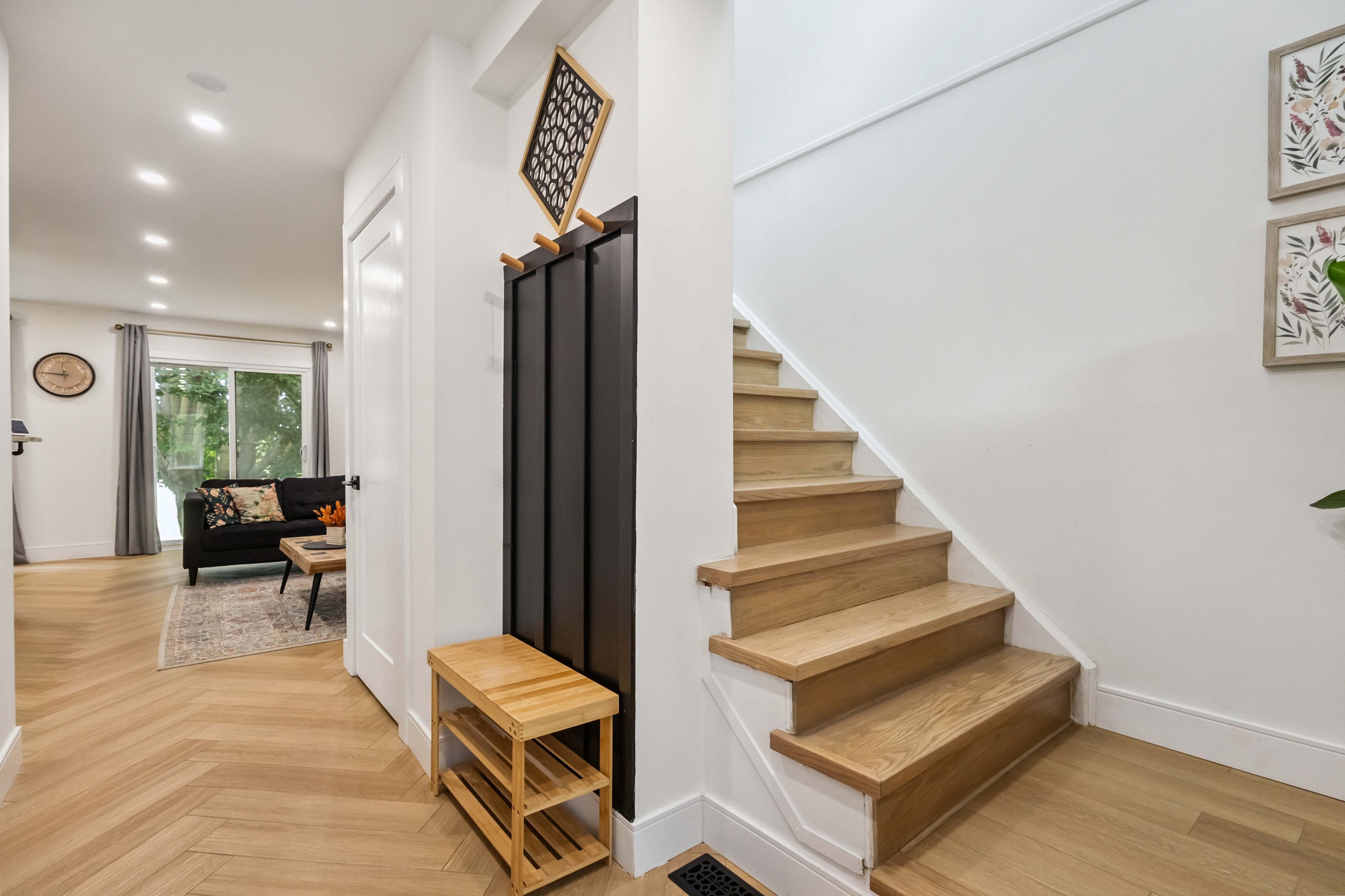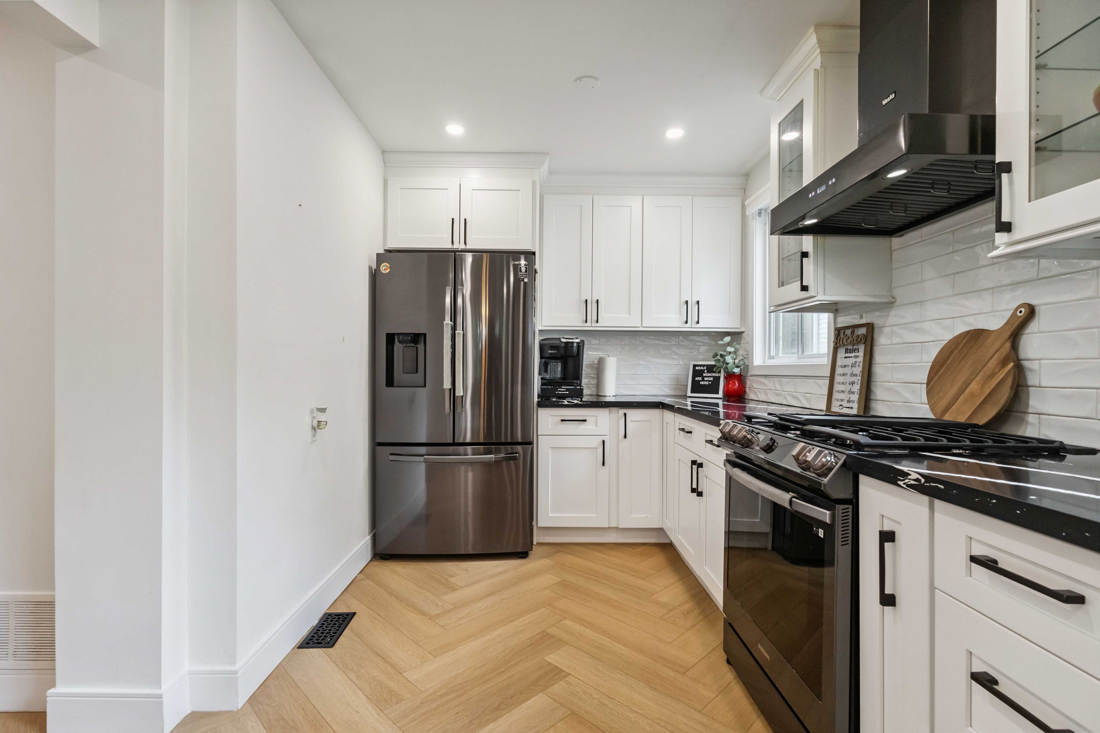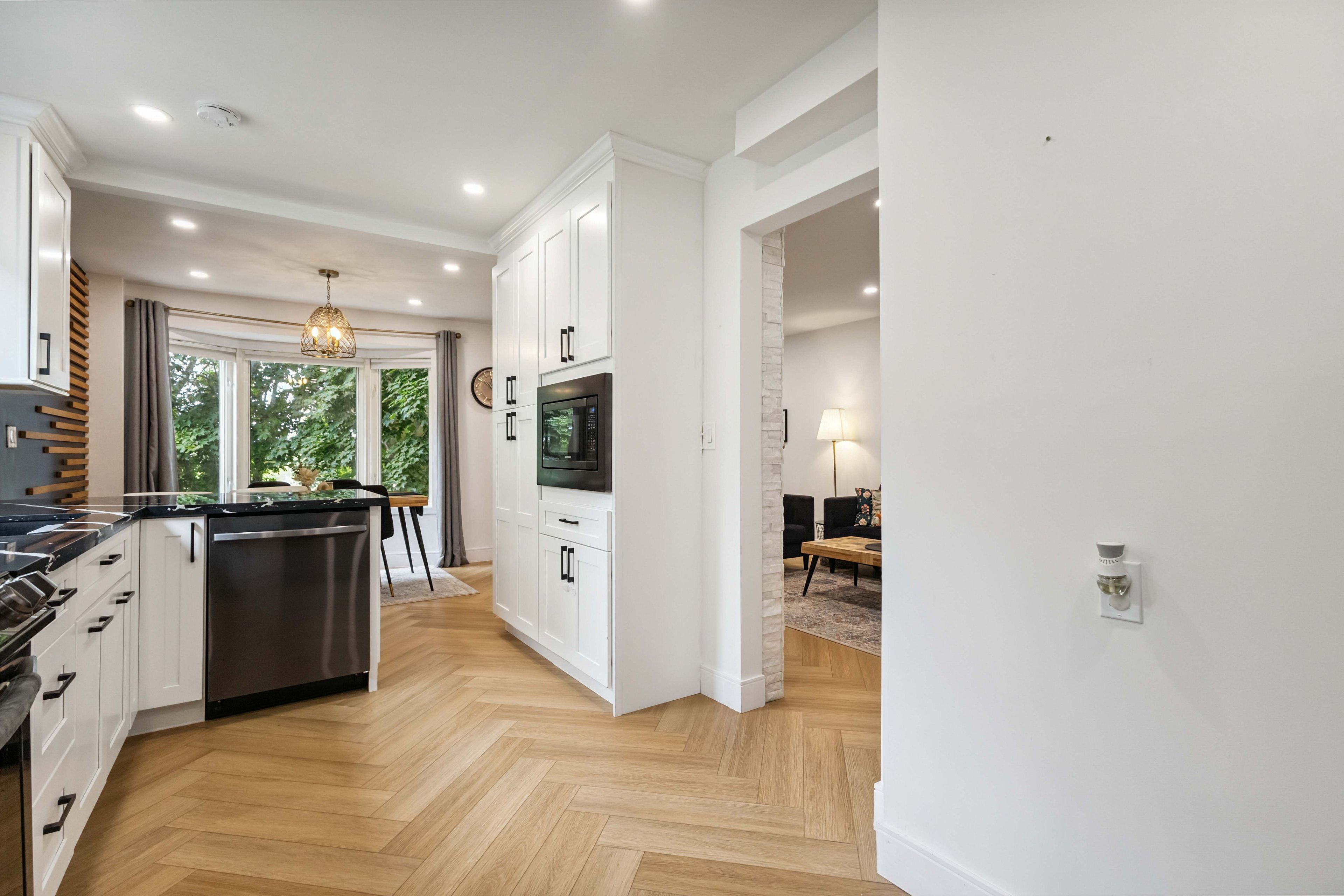 • Custom maple kitchen with quartz counters and smart storage for convenience.