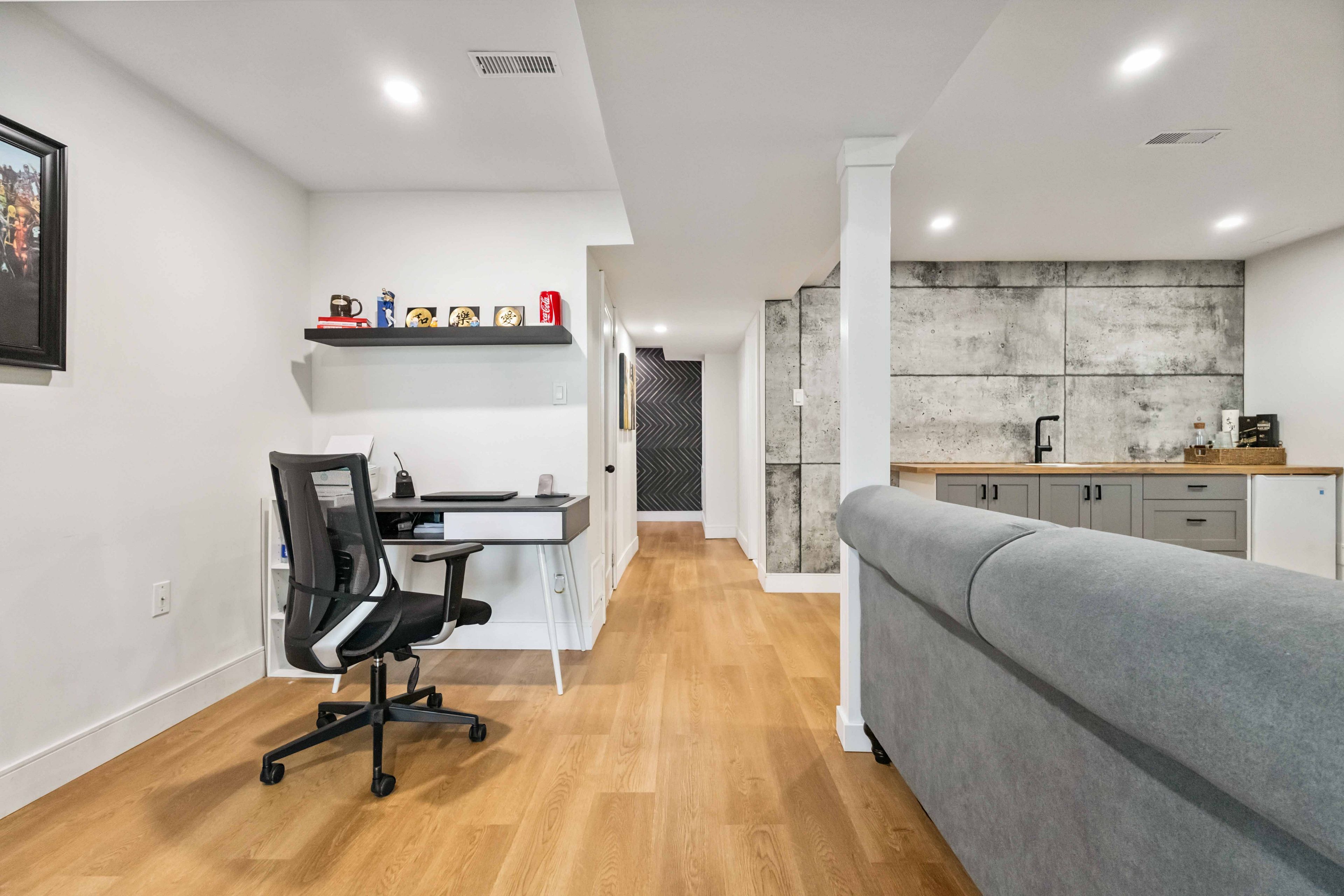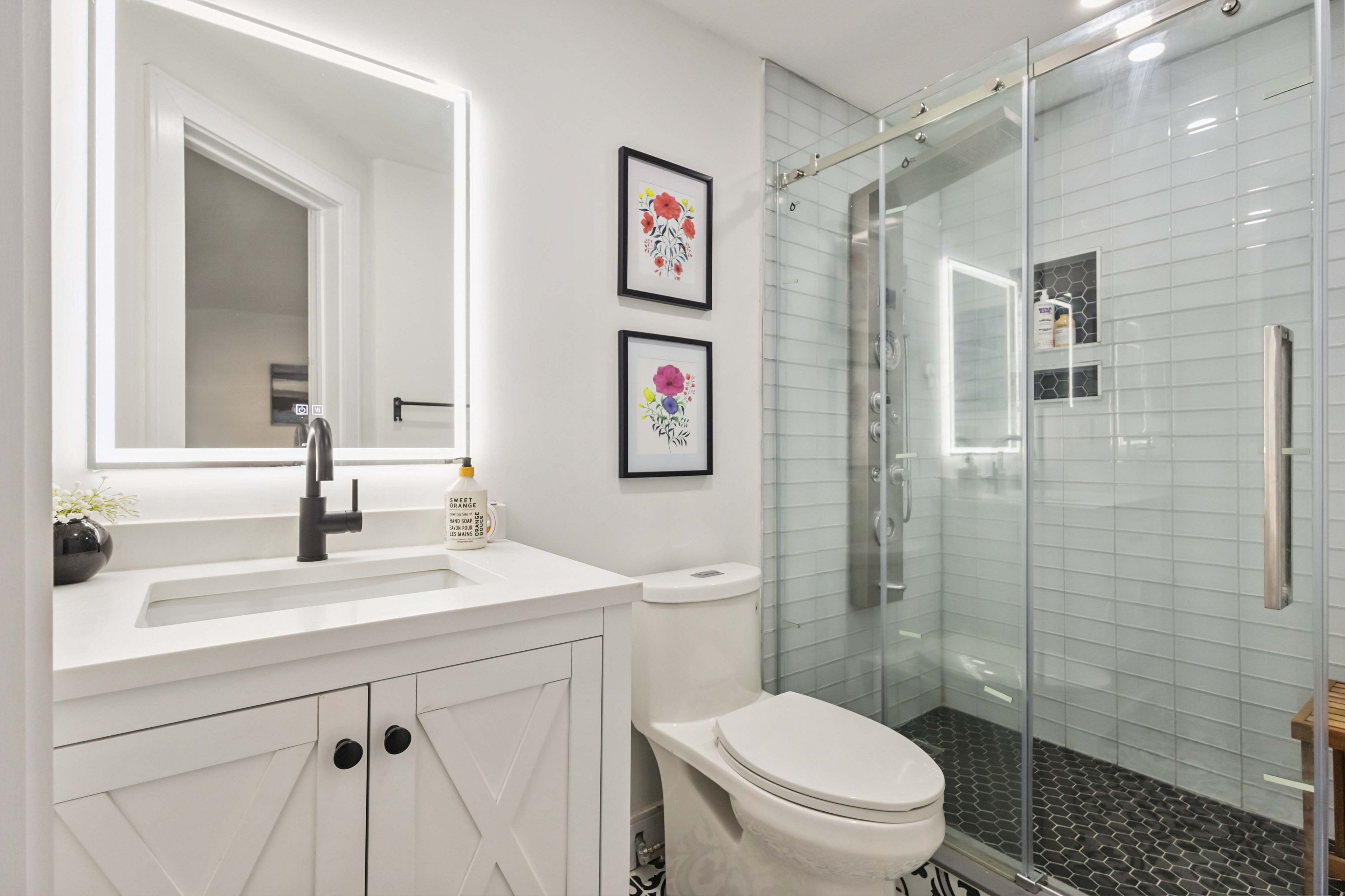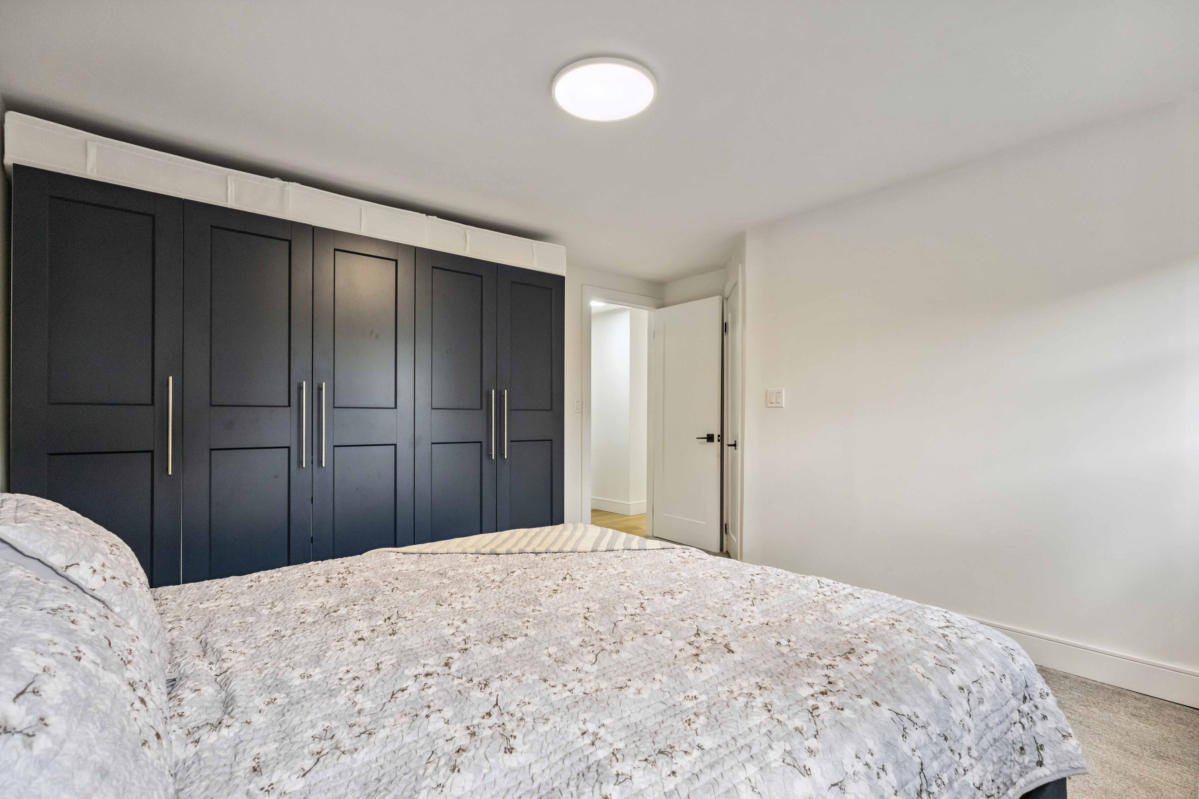 • Custom maple kitchen with quartz counters and smart storage for convenience.