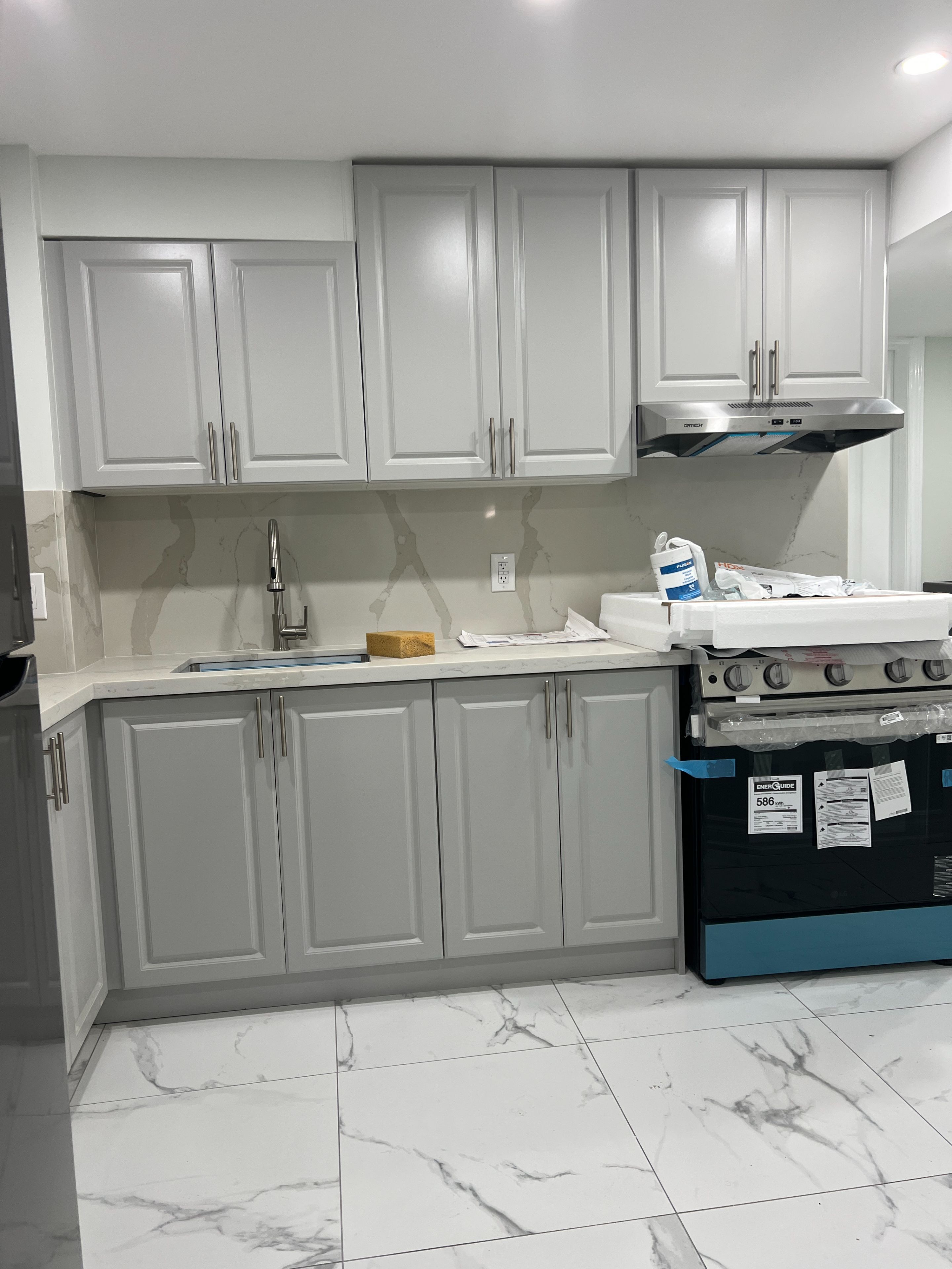 • Features a modern kitchen with quartz countertops and backsplash.