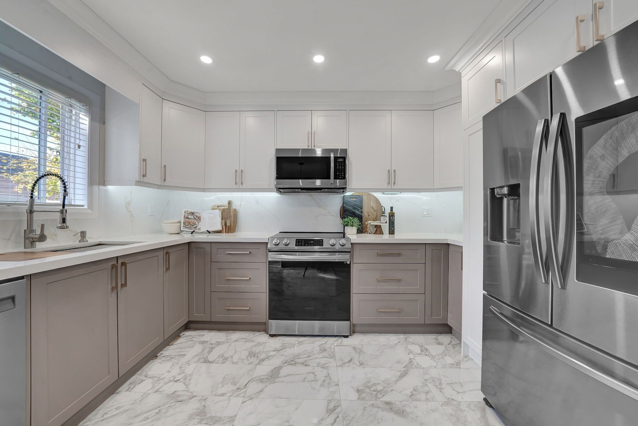 • Gourmet kitchen with quartz countertops and premium stainless steel appliances.