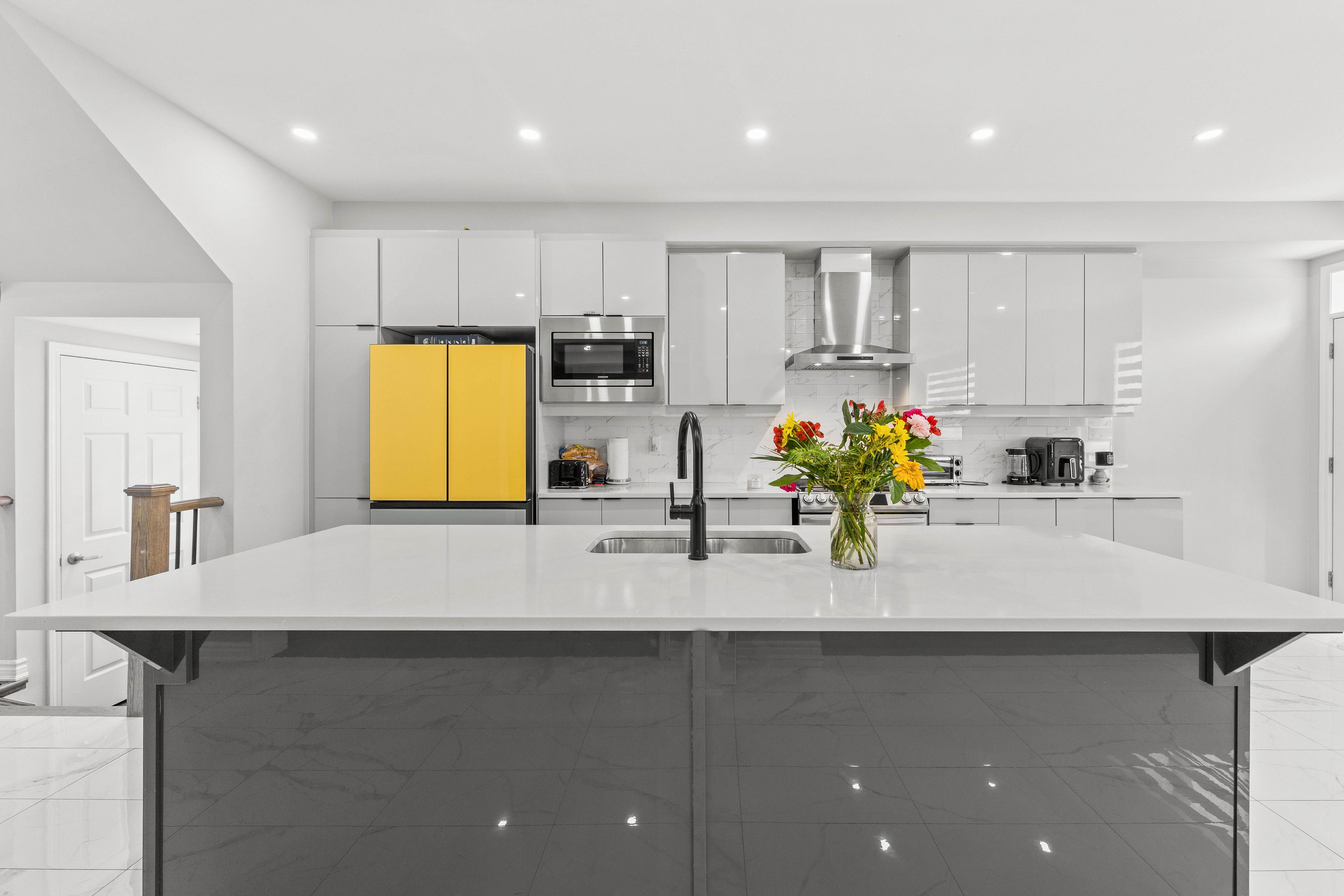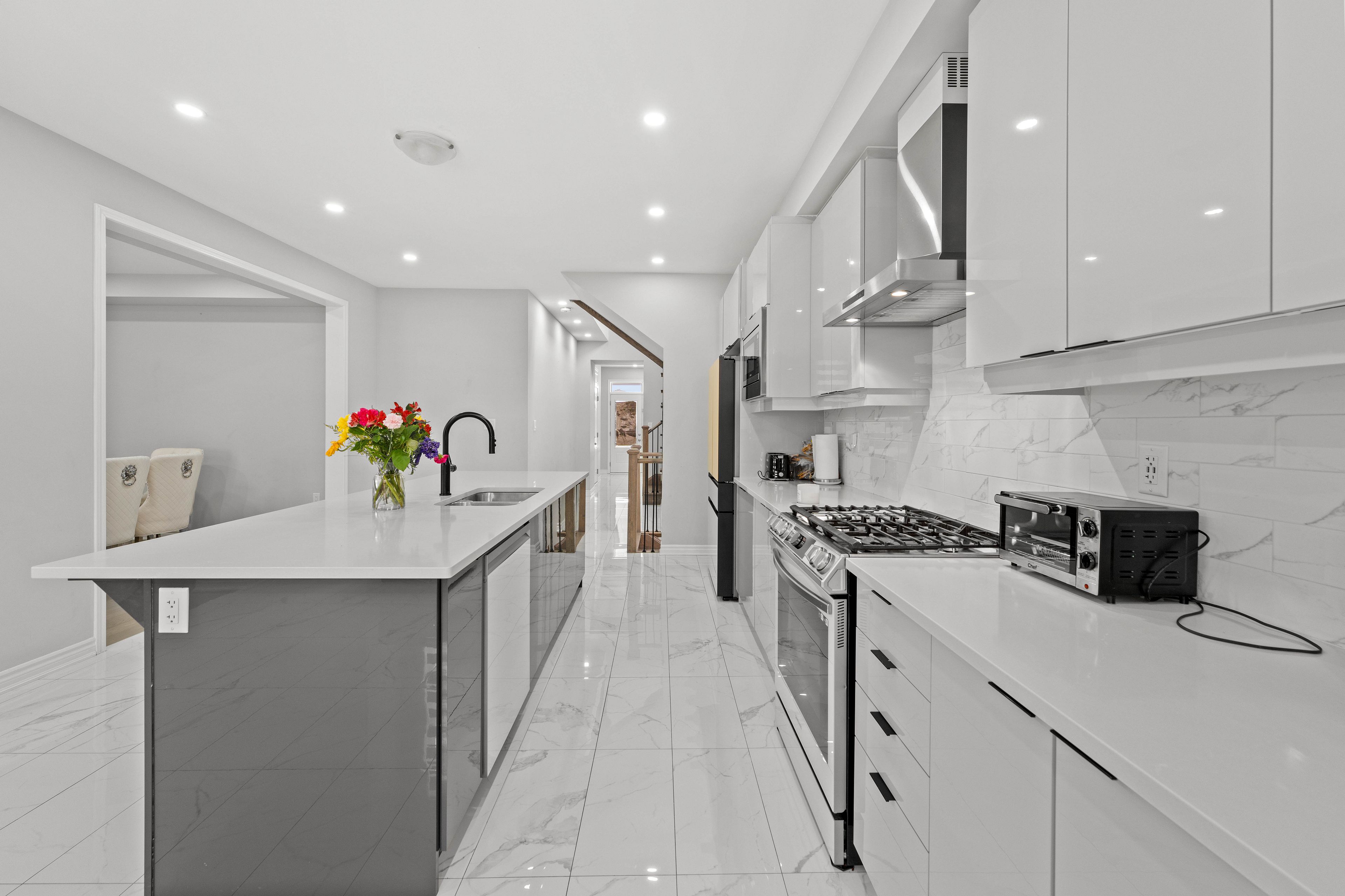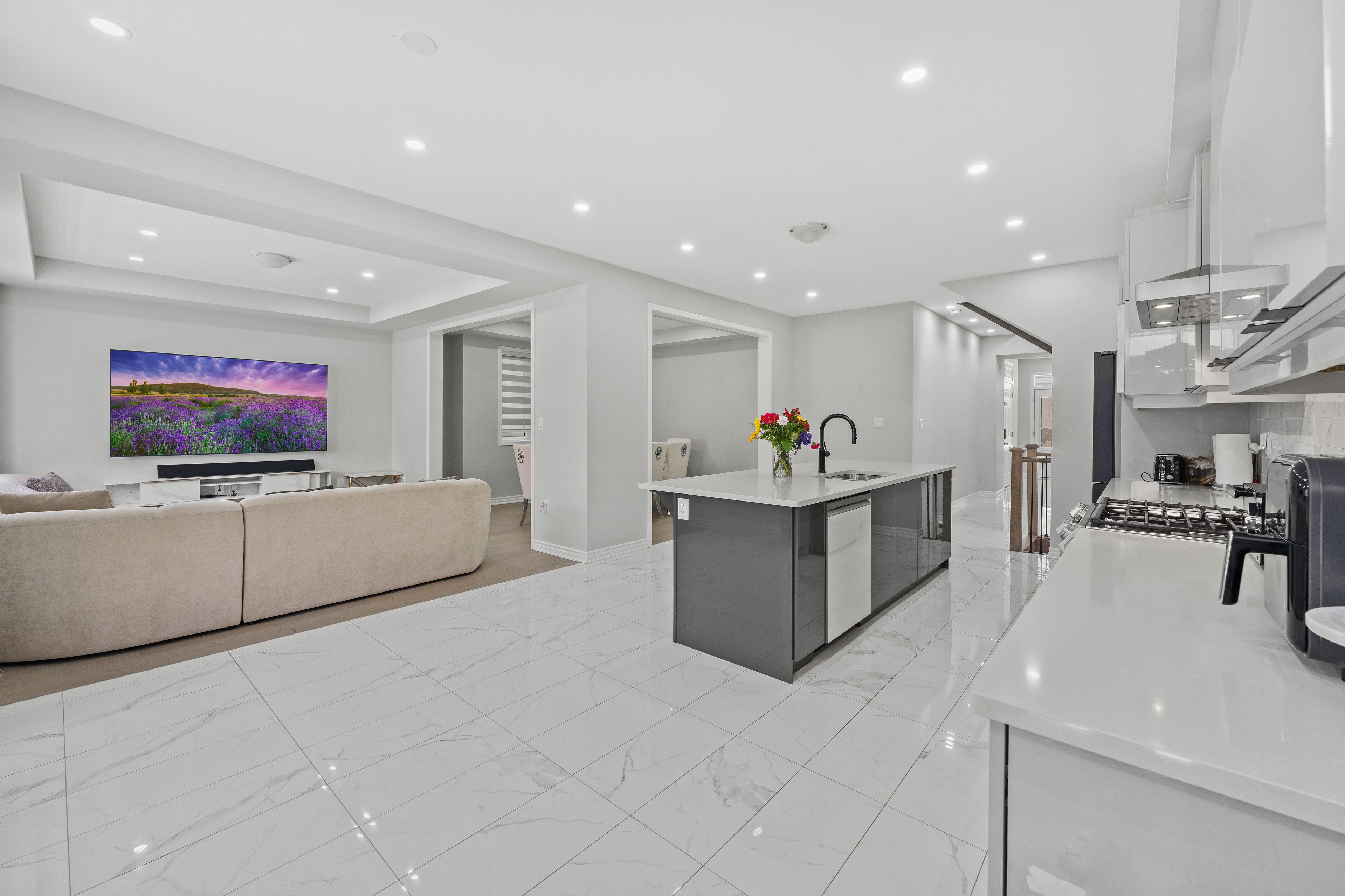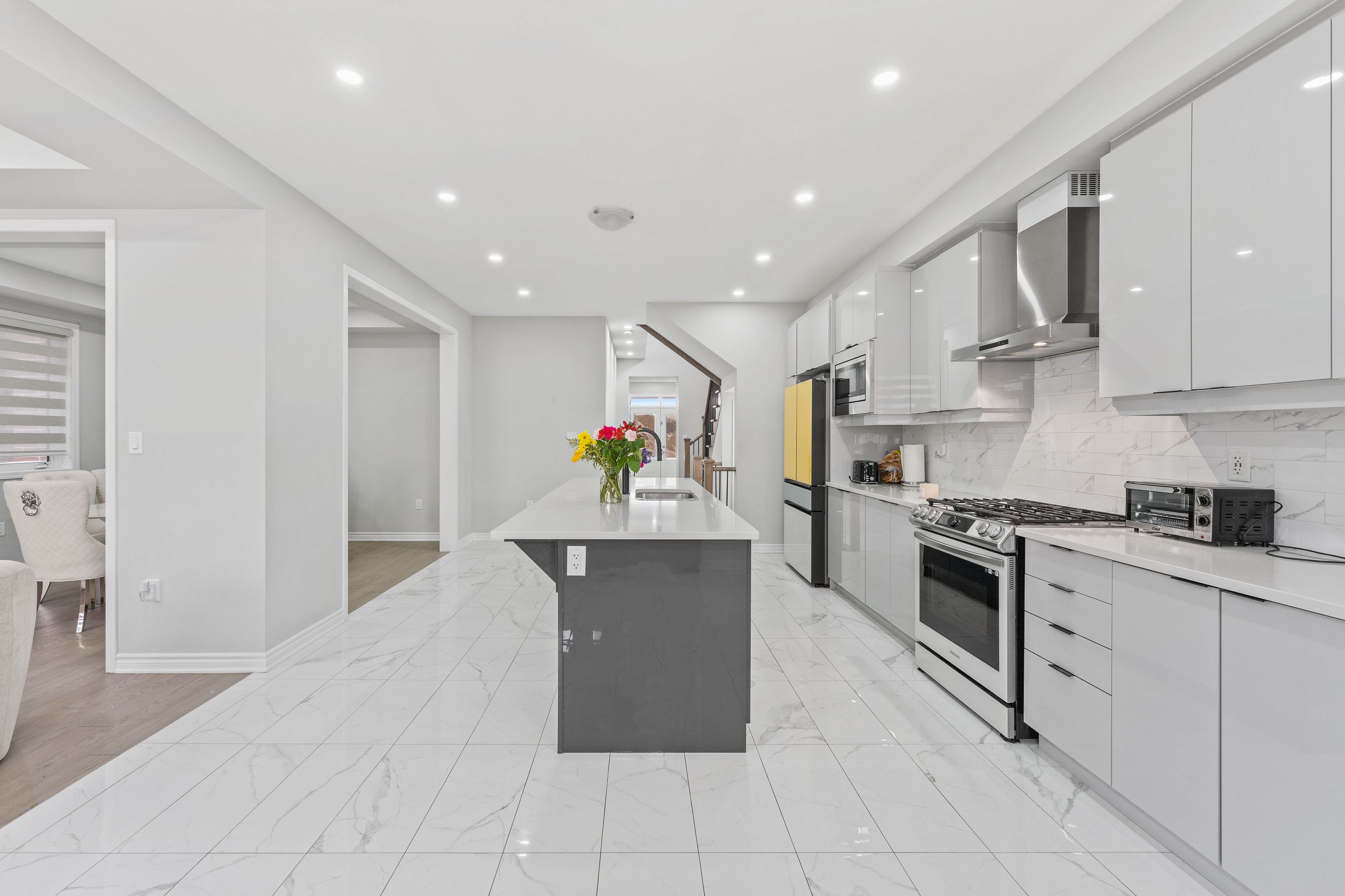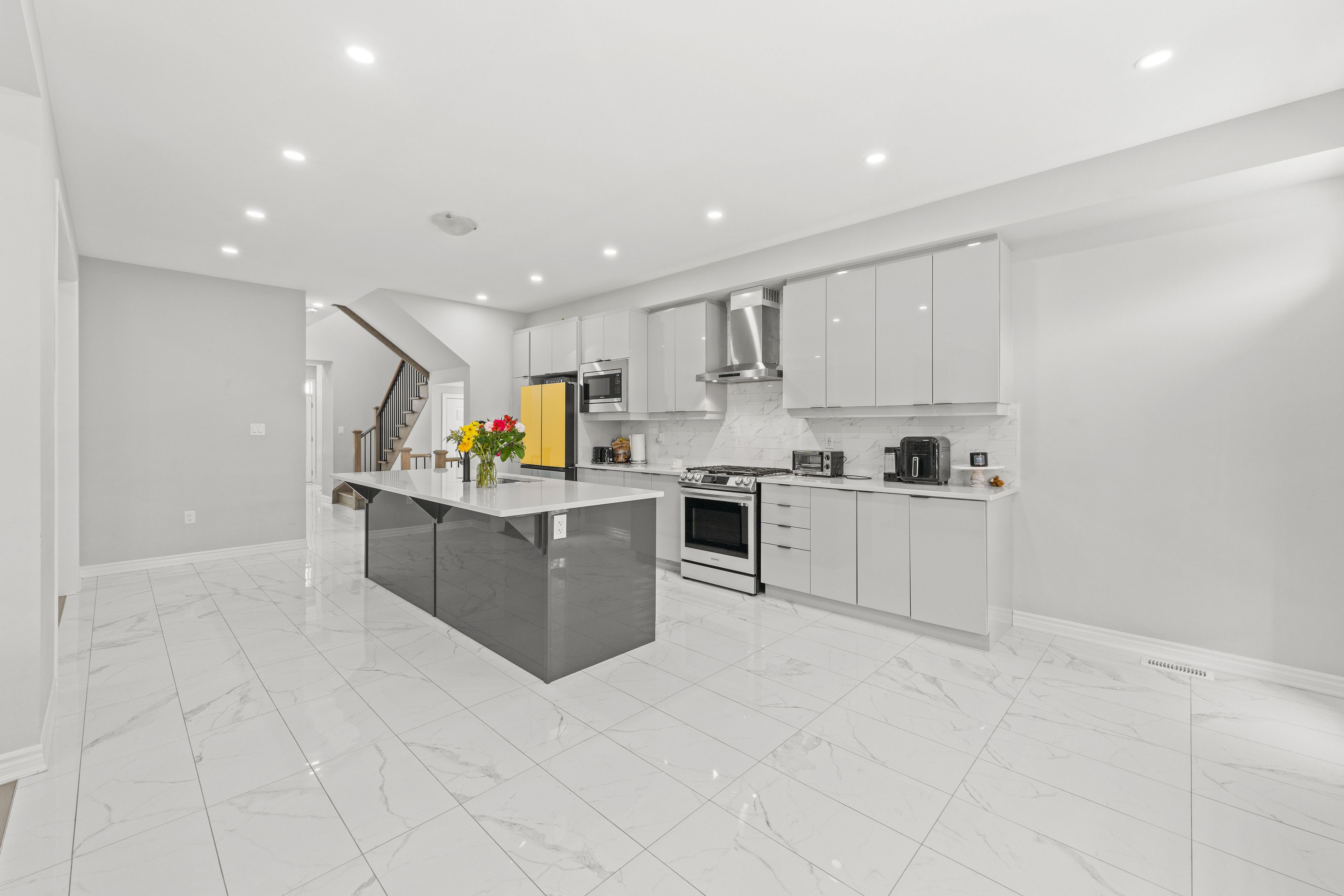 • Modern kitchen with upgraded appliances and a large center island.