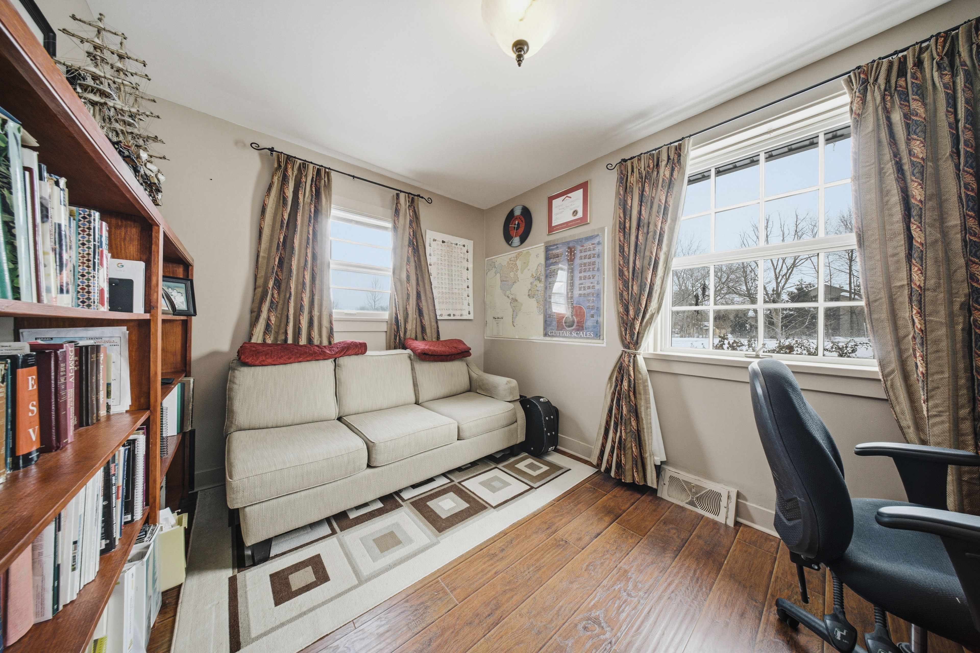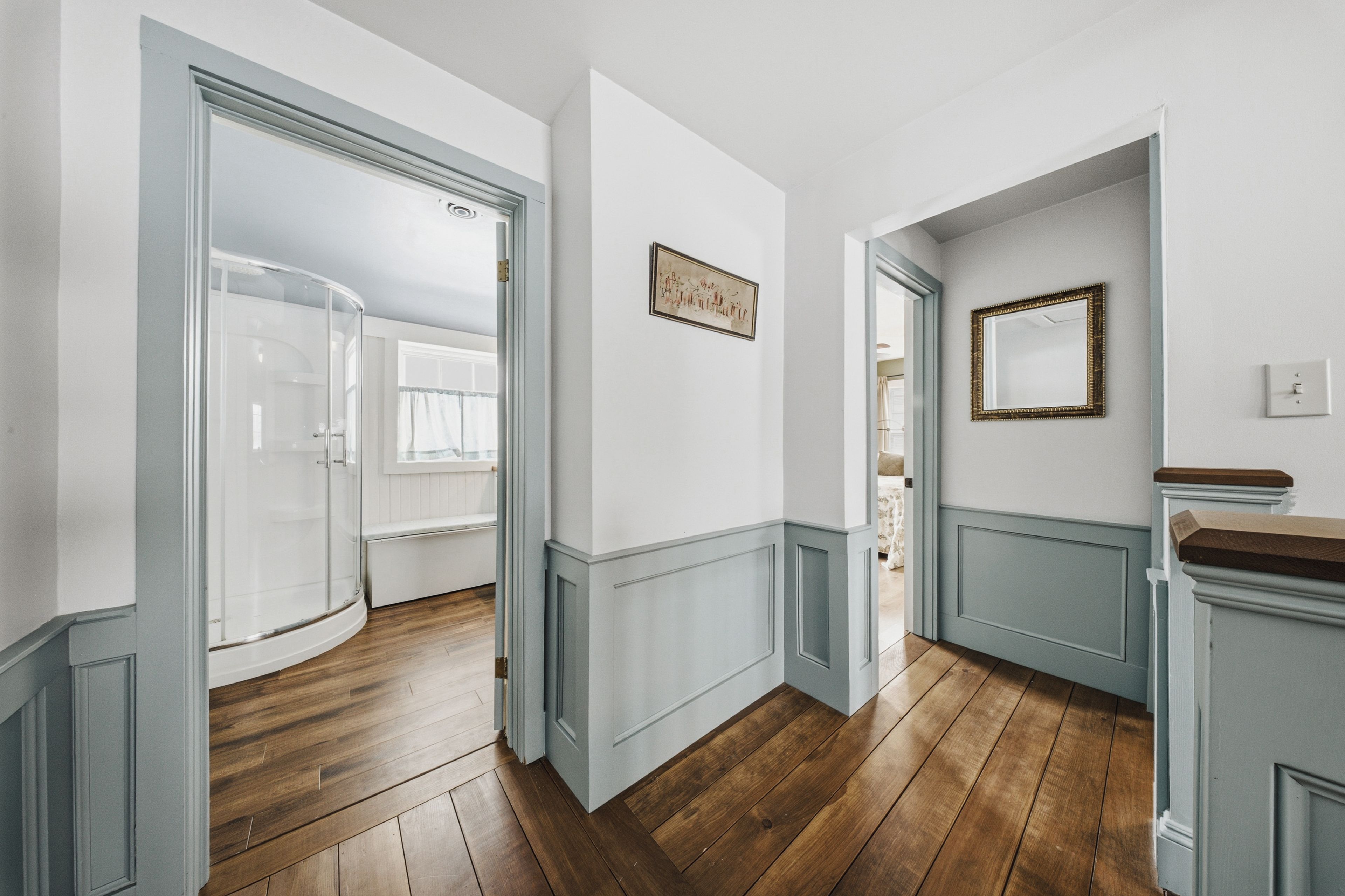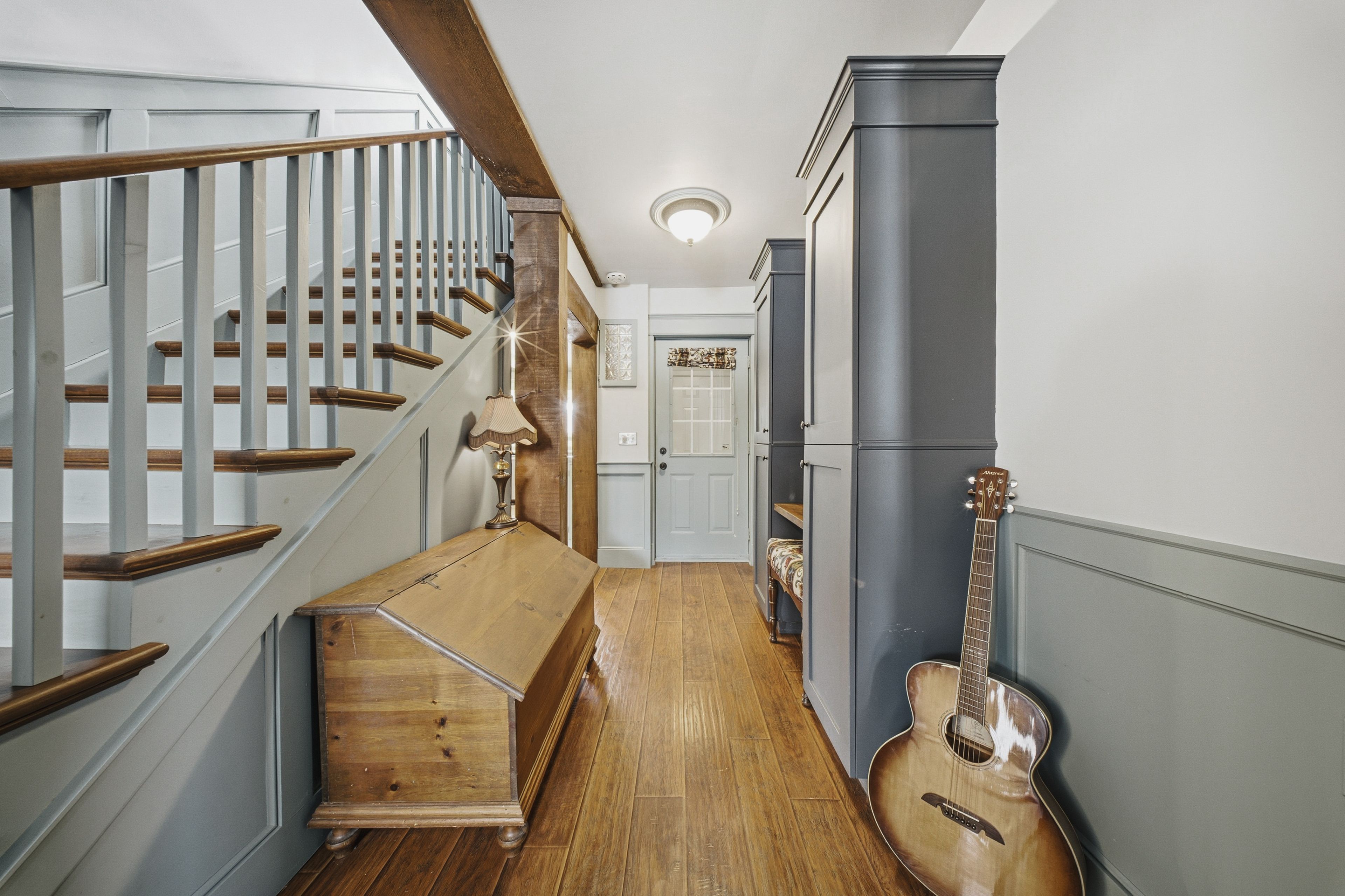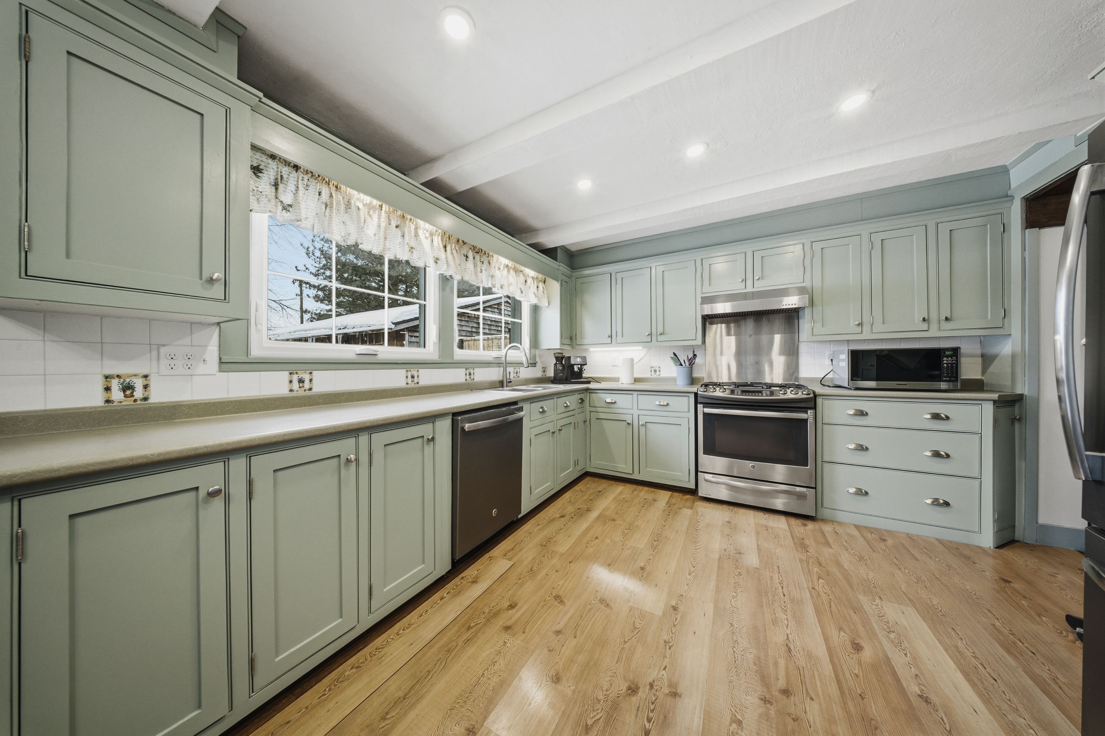• Spacious four-bedroom home with rich hardwood flooring and exposed beams.