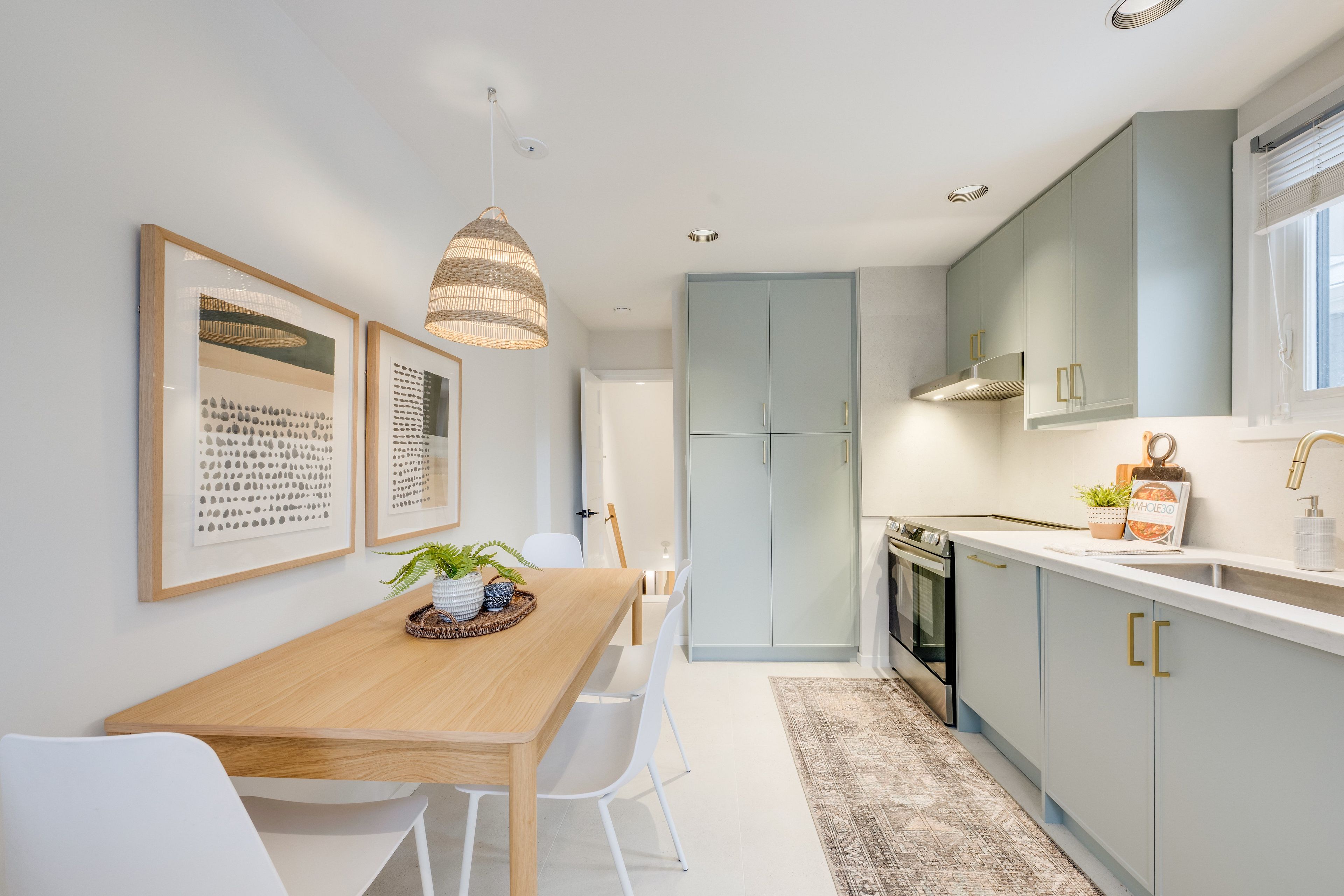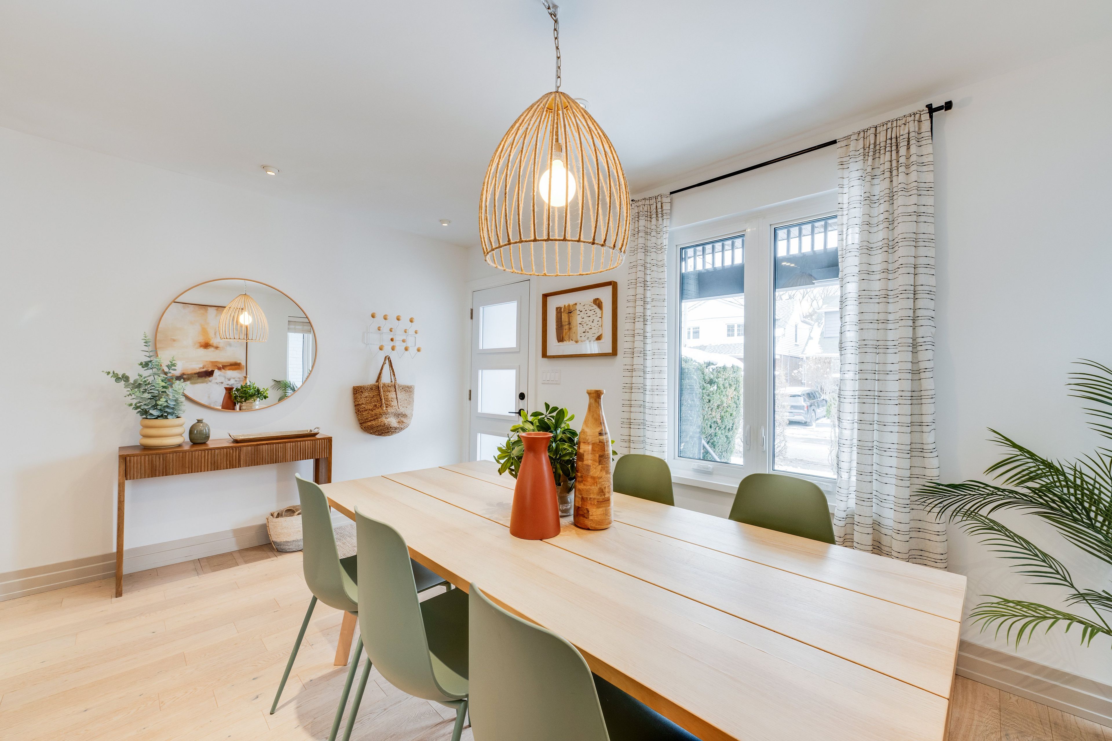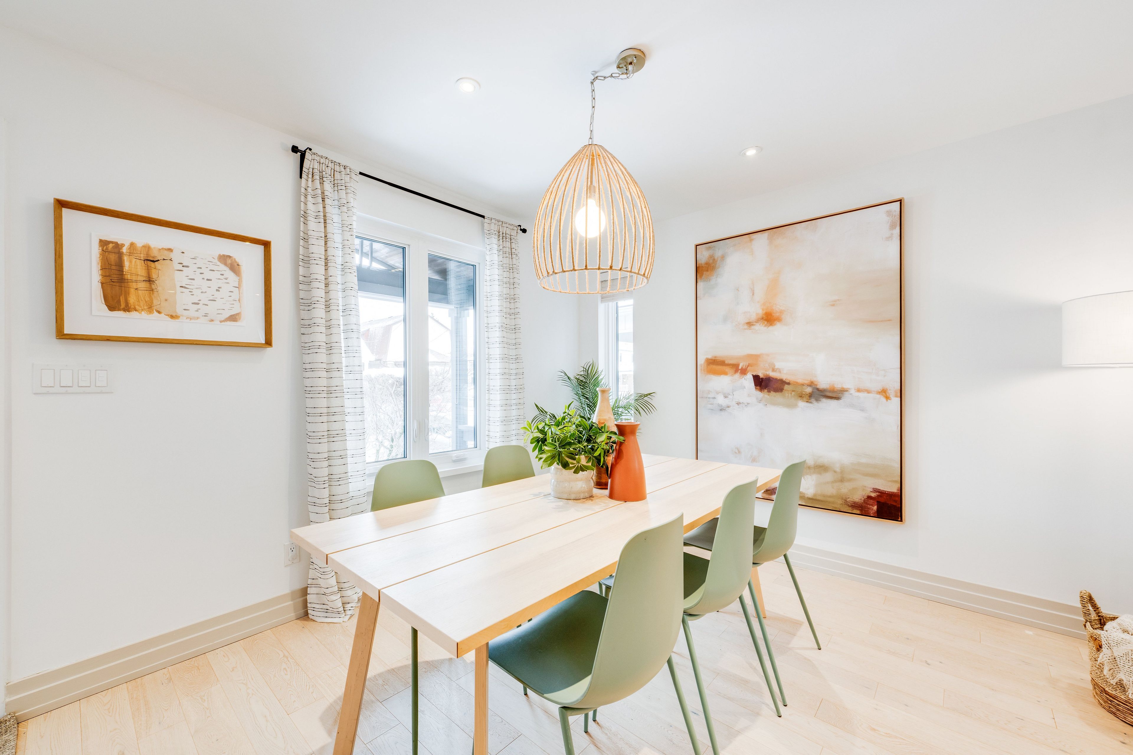• Open-concept living and dining area with serene oak plank floors.