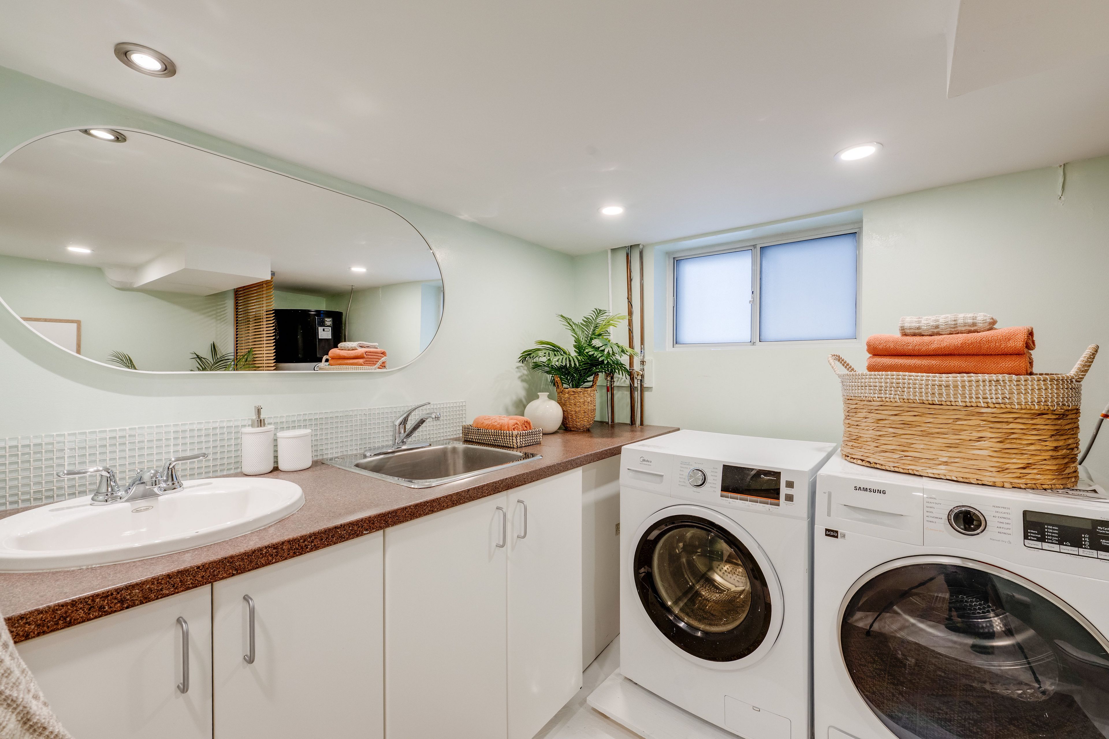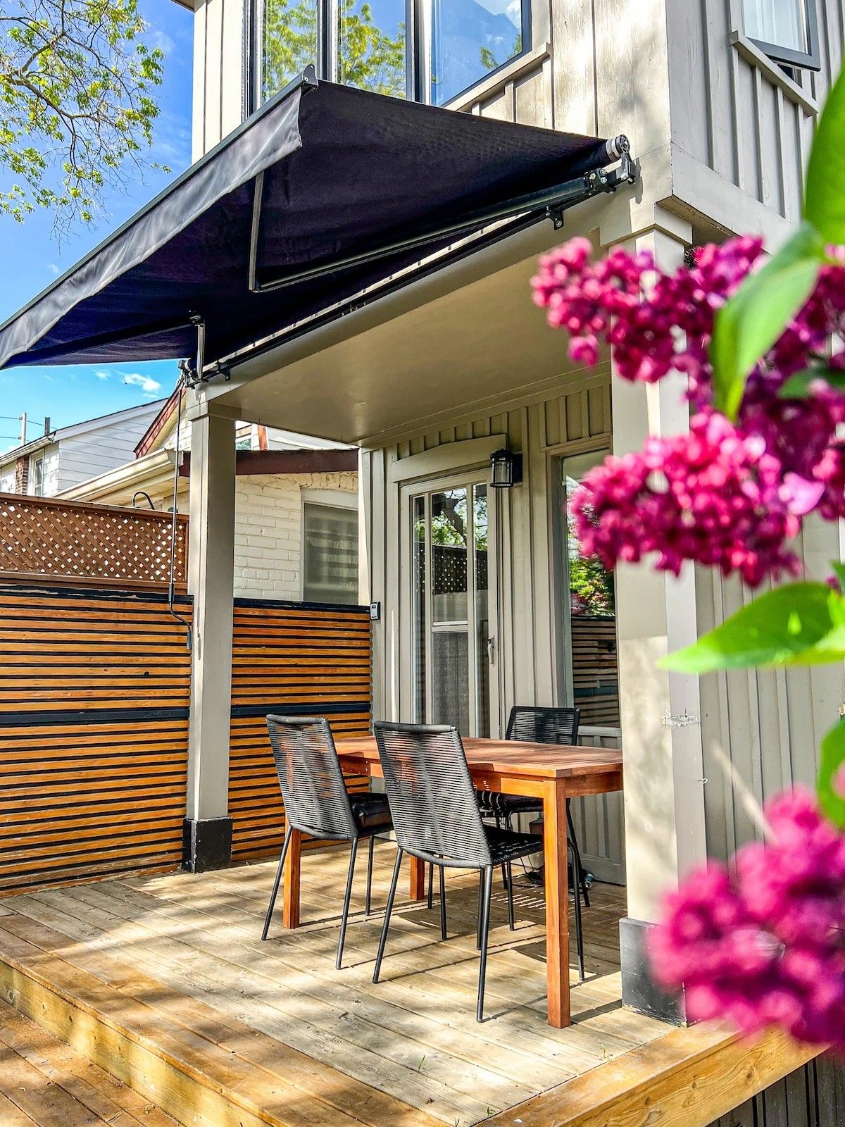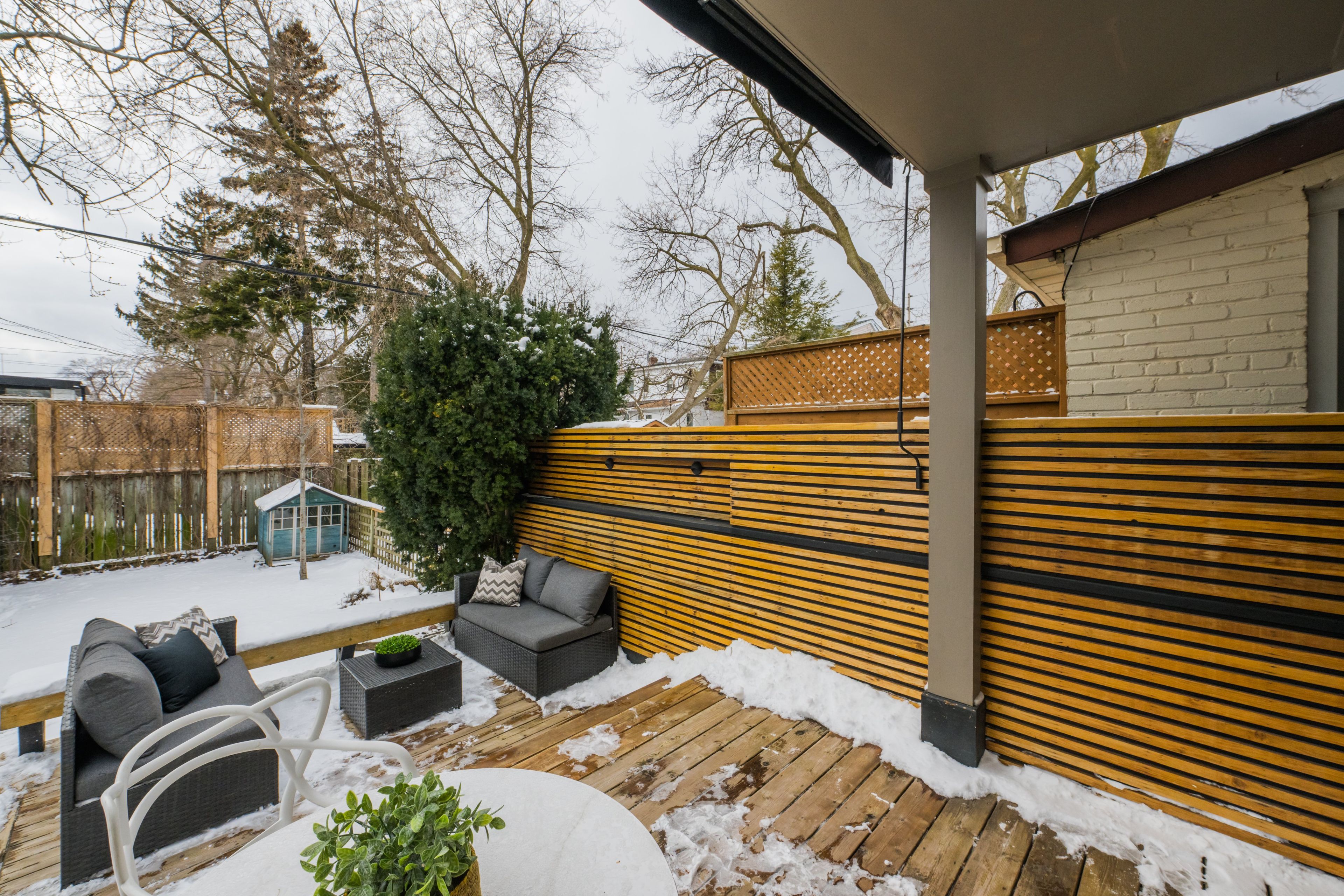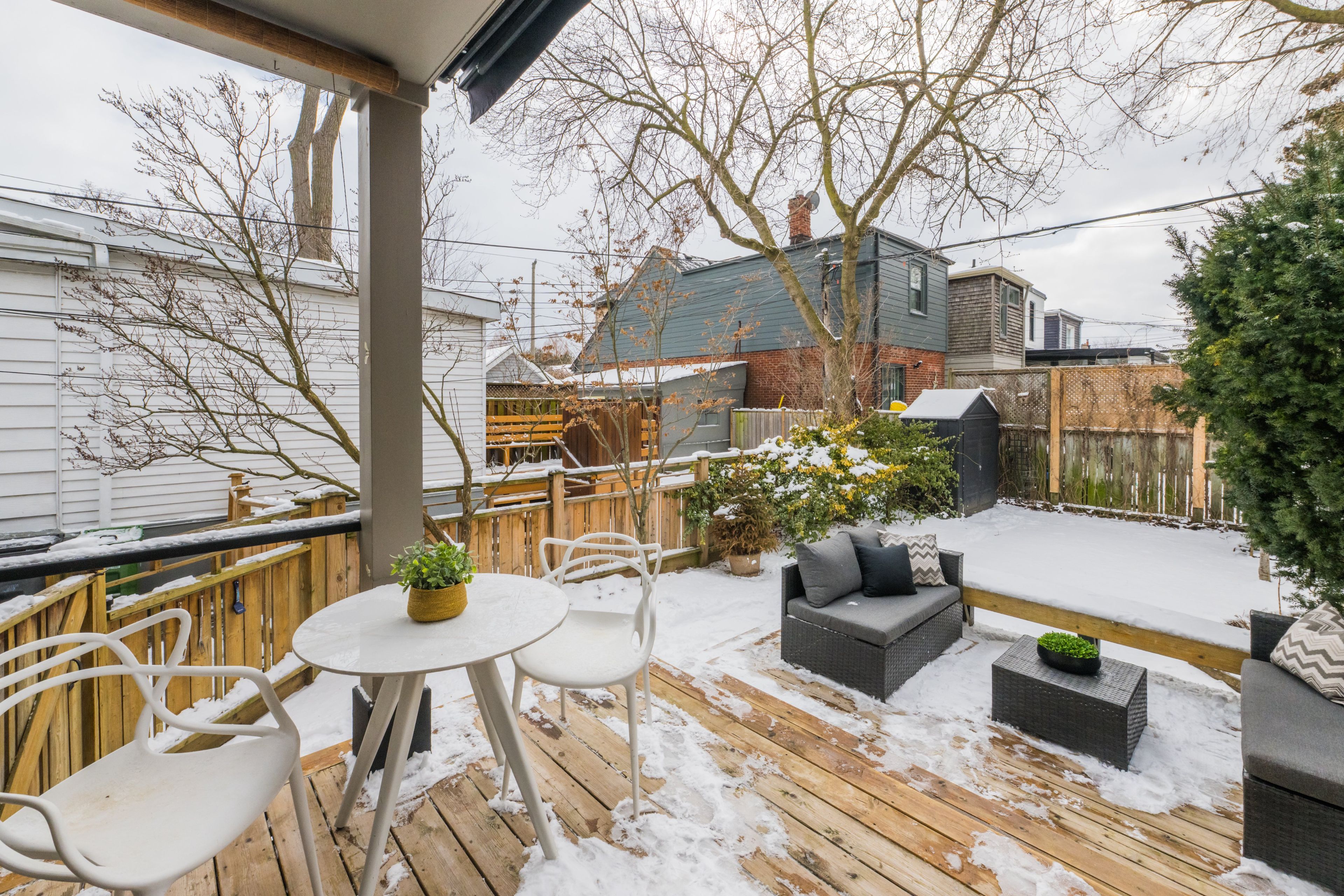 • Beautiful eat-in kitchen flows to a fenced garden and tiered deck.