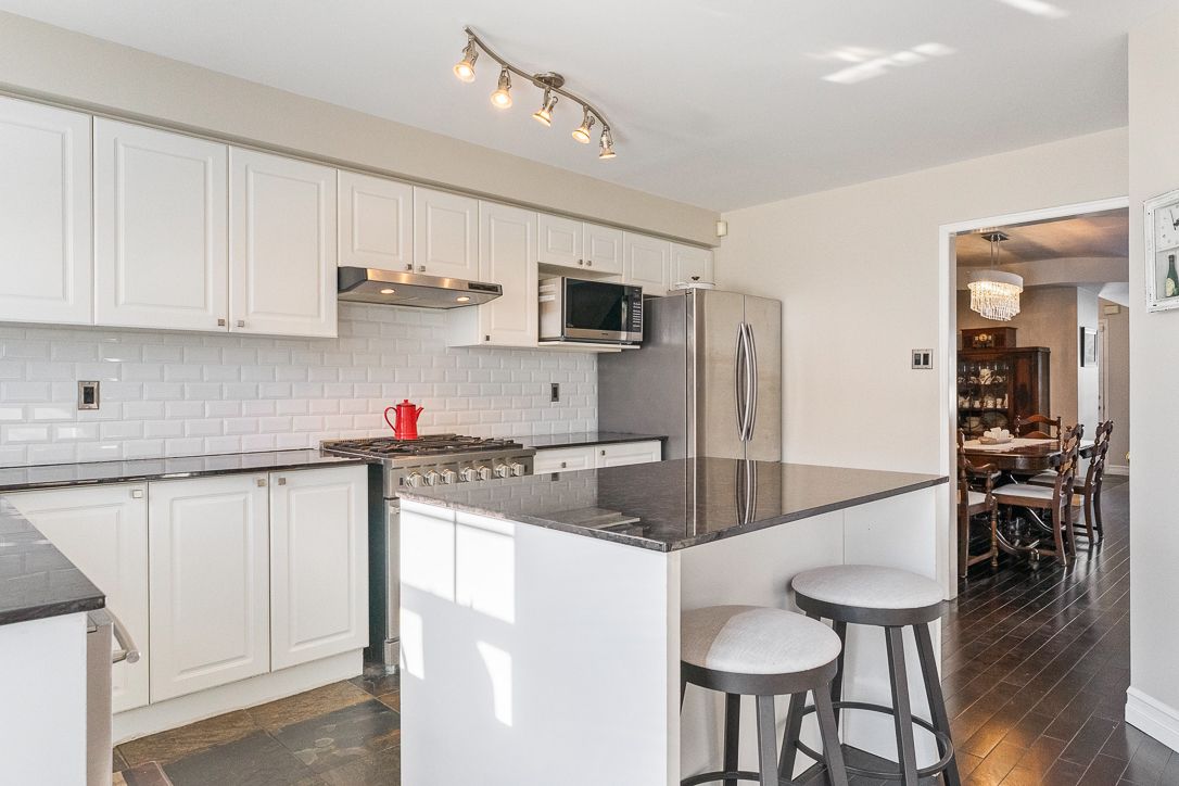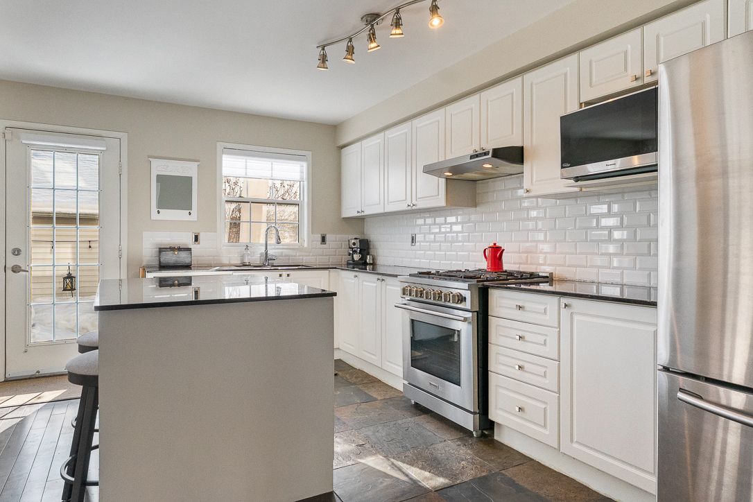 • Generous eat-in kitchen with stainless steel appliances and granite countertops.