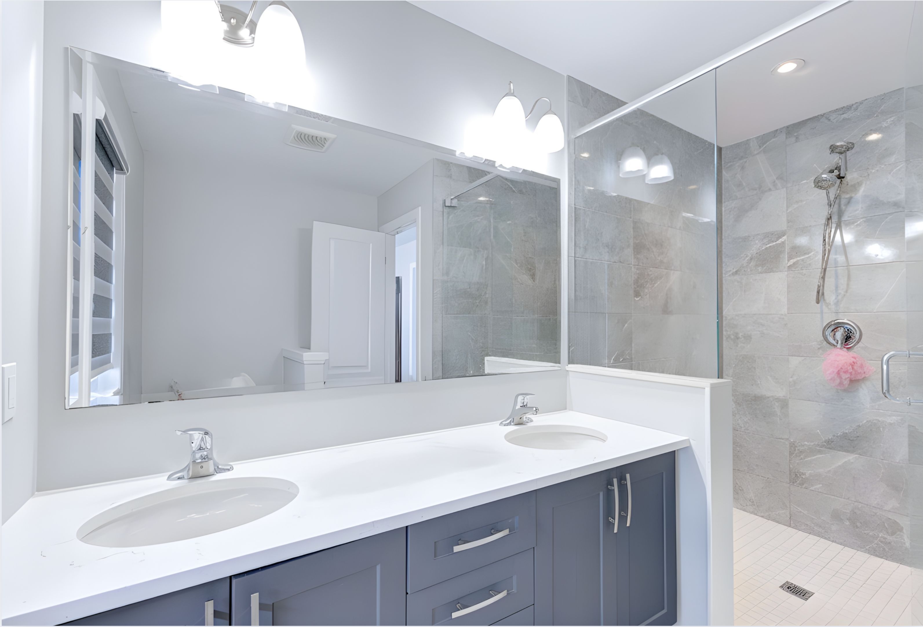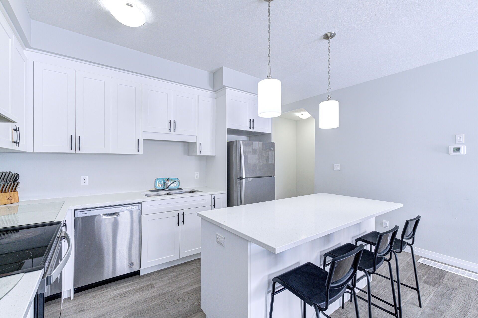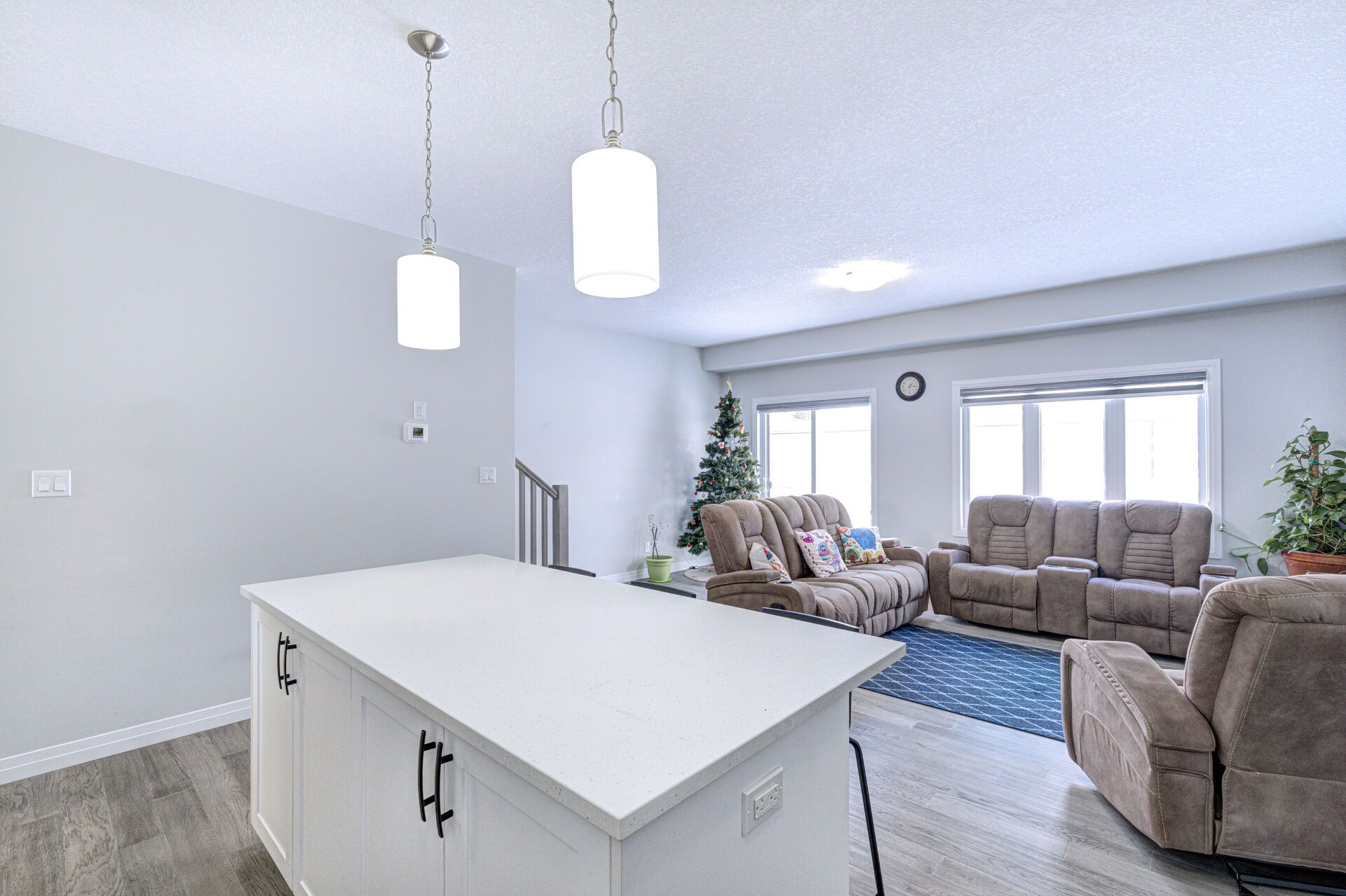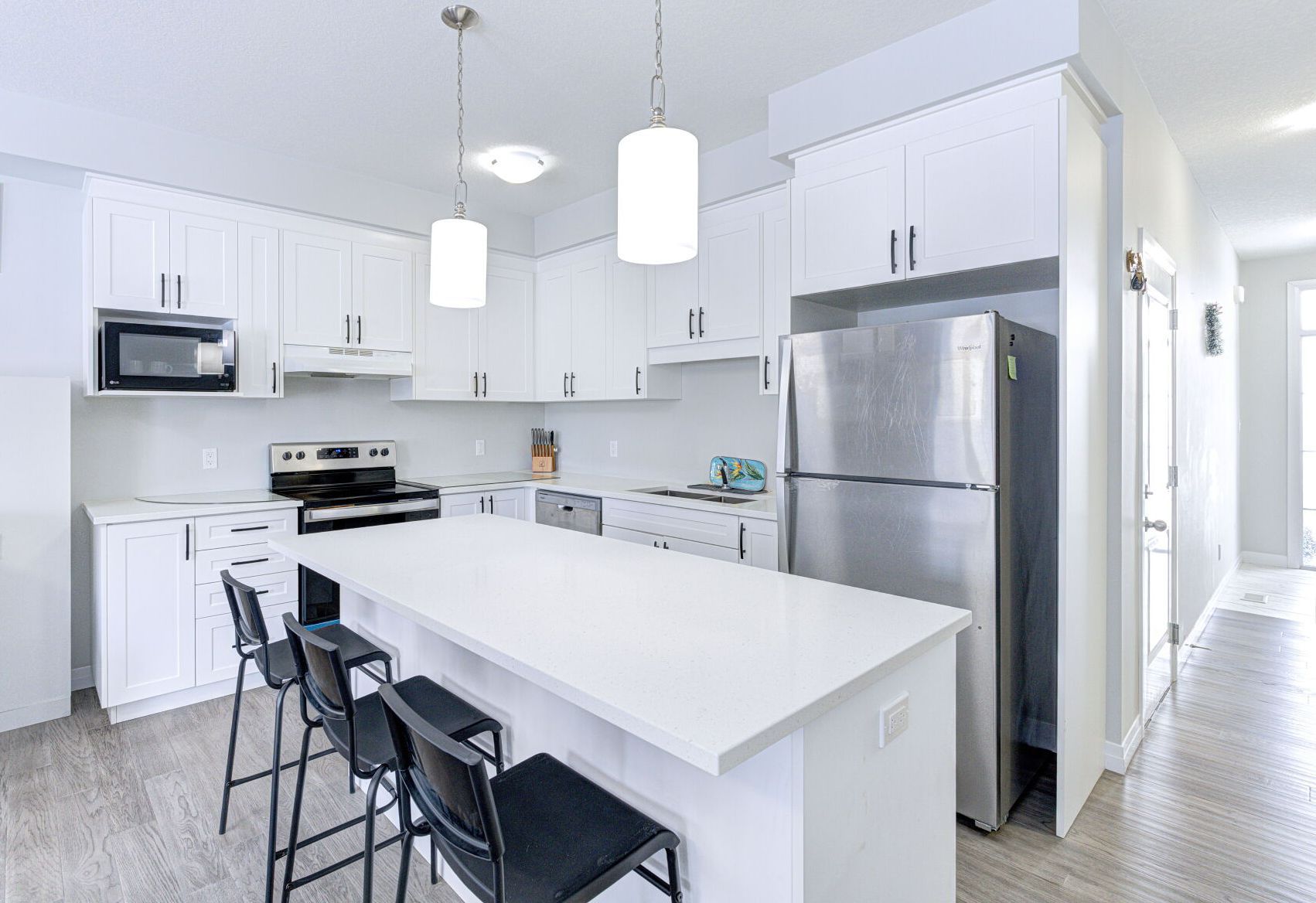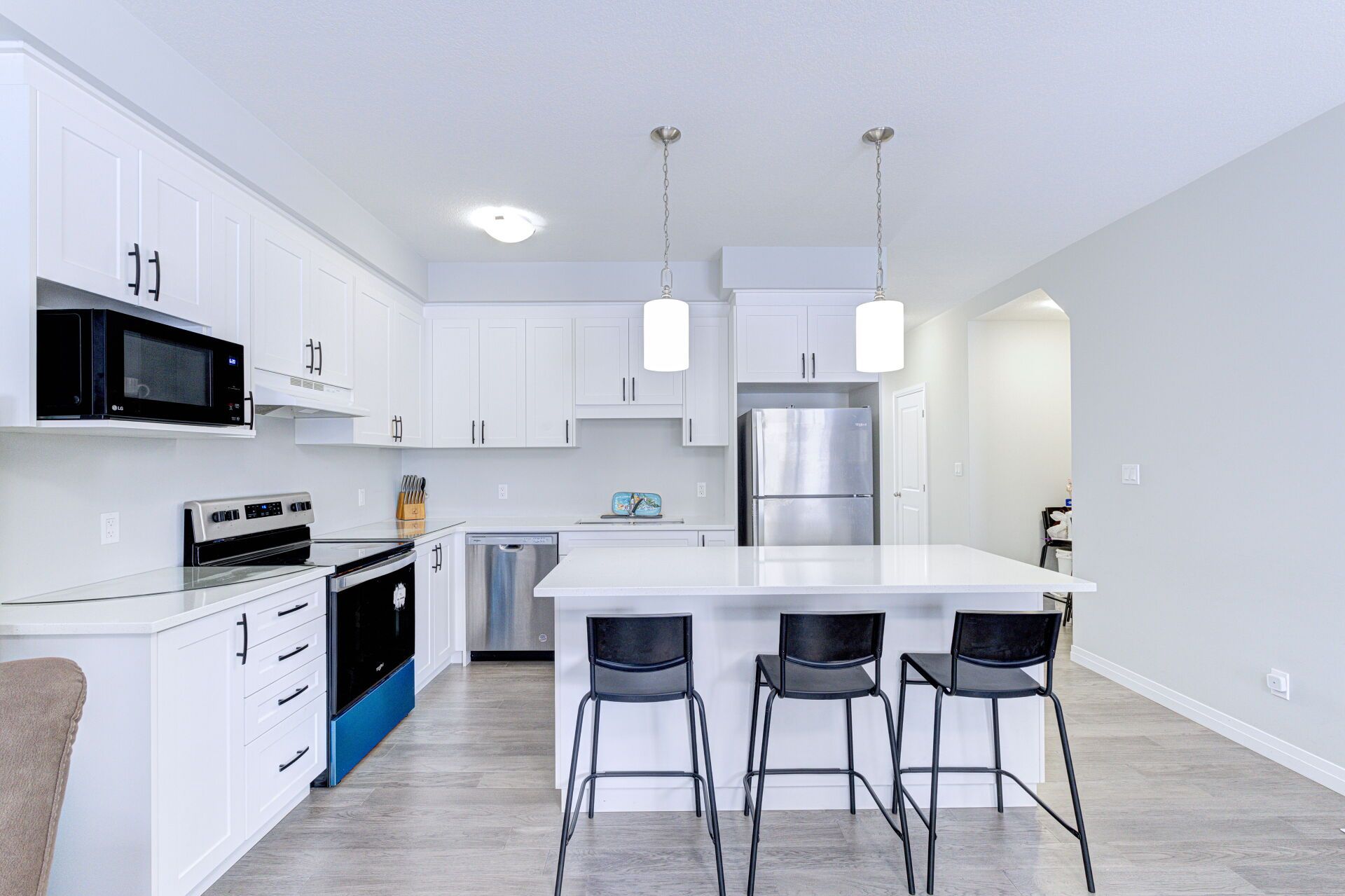 • Modern kitchen features large island, quartz countertops, and plenty of natural light.
