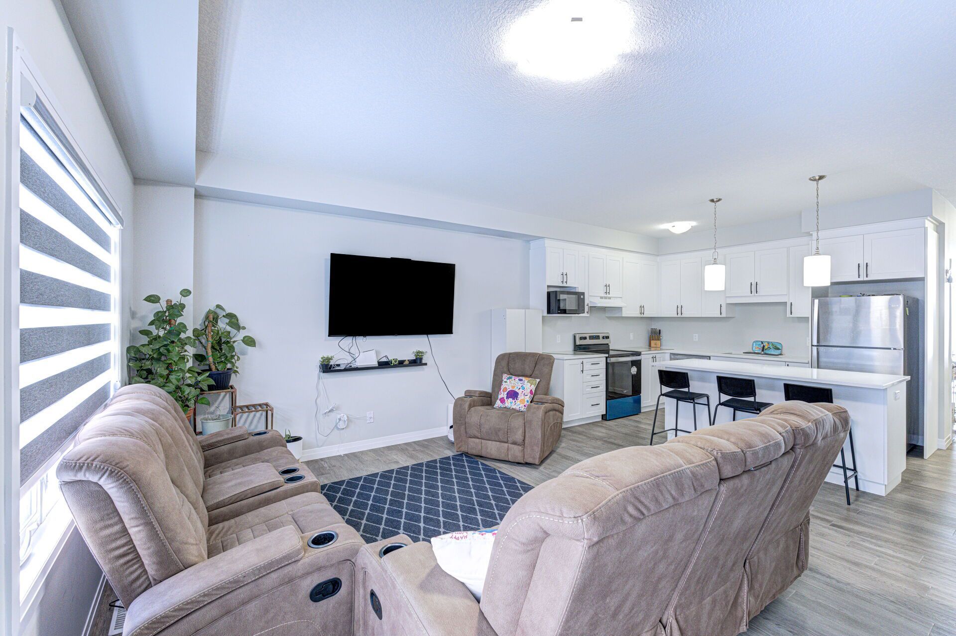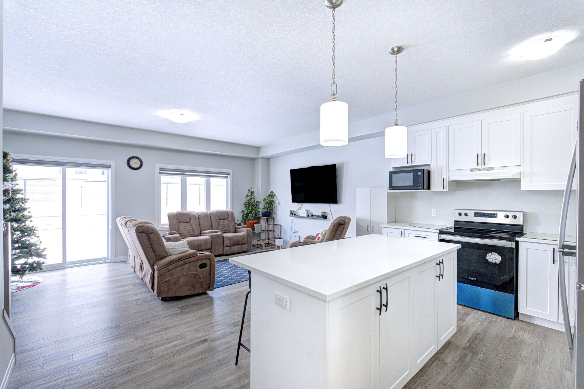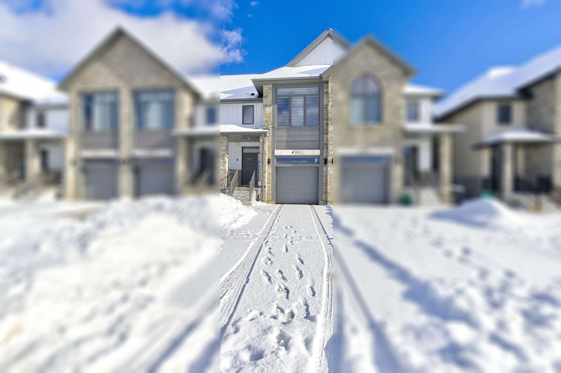 "open house: december 13th from 1:00 to 4:00 pm for any questions or to book a private showing, please call 647-779-9484" this beautifully designed freehold townhome is located in the highly desirable westwood village community. It comes with the added benefit of no condo fees. The main floor offers an open-concept layout with engineered hardwood and tile flooring, creating a smooth flow between the living, dining, and kitchen areas. The modern kitchen features a large island, quartz countertops, and expansive windows that fill the space with natural light. The second floor includes three spacious bedrooms. The primary suite offers a walk-in closet and a luxurious ensuite with double sinks and a glass walk-in shower. The convenience of second-floor laundry adds to the functionality of the home. Built by ridgeview homes, an award-winning builder, this property reflects quality craftsmanship and premium finishes throughout. The community is thoughtfully planned with access to local shops, restaurants, downtown cambridge amenities, parks, scenic trails, and a proposed future school.