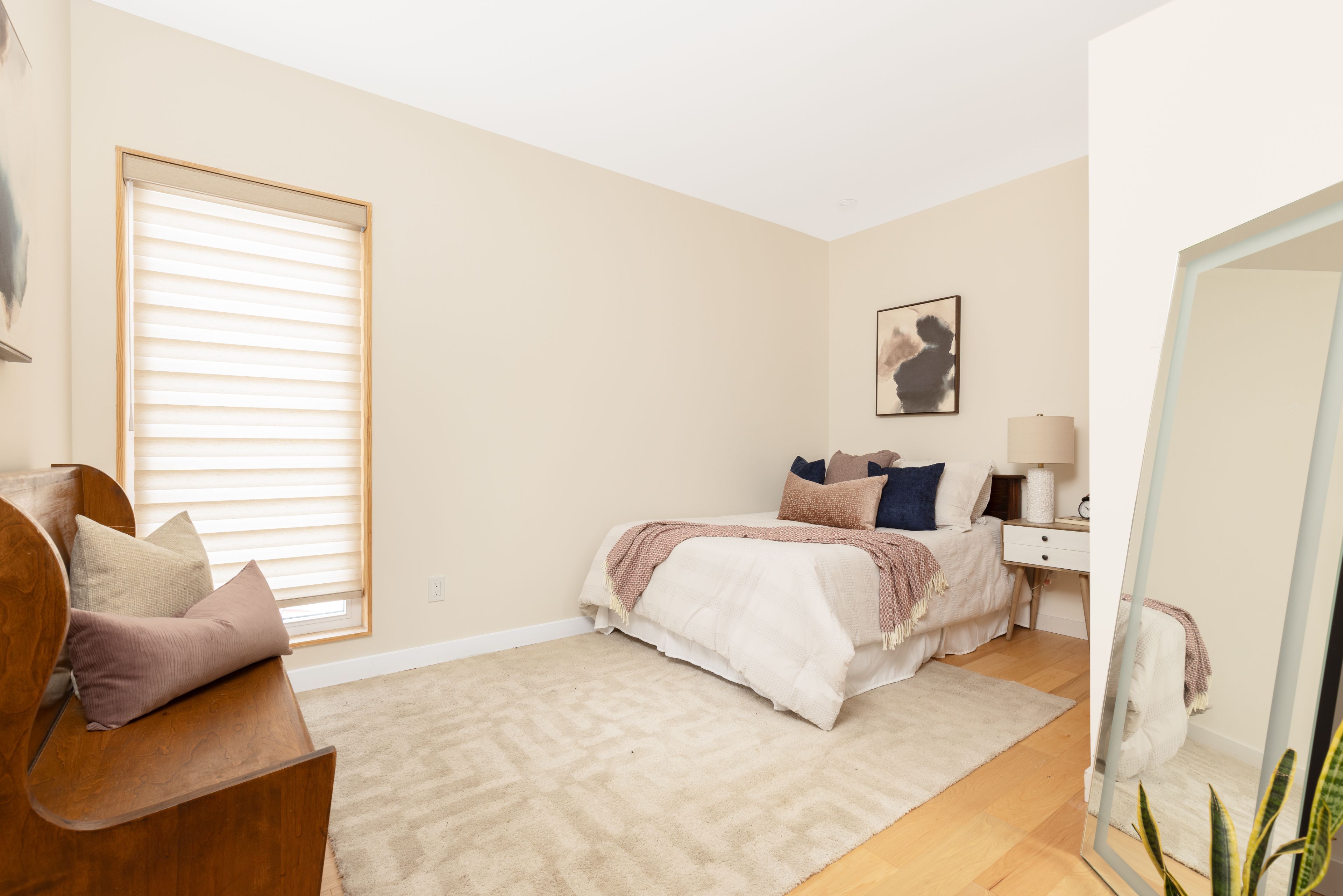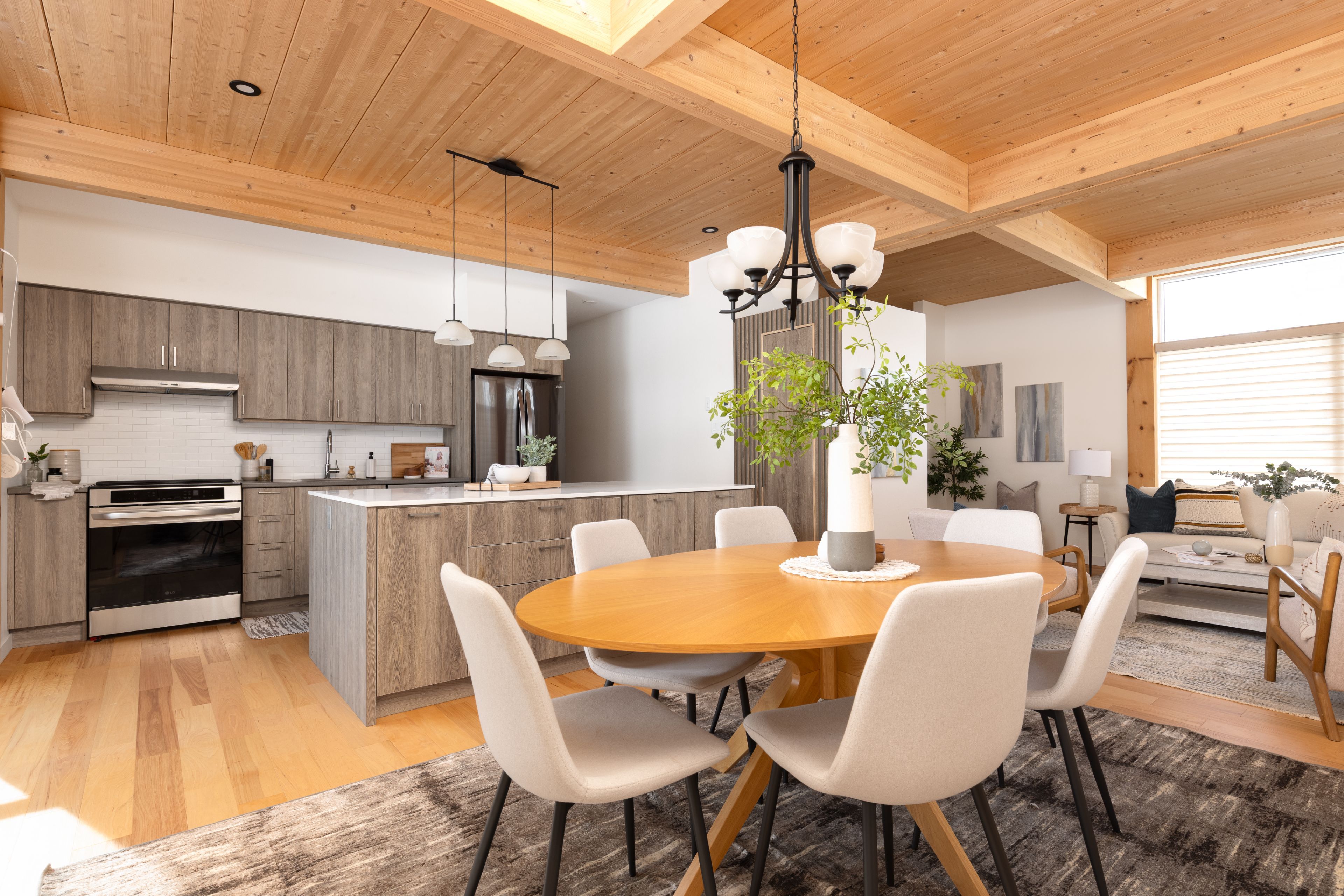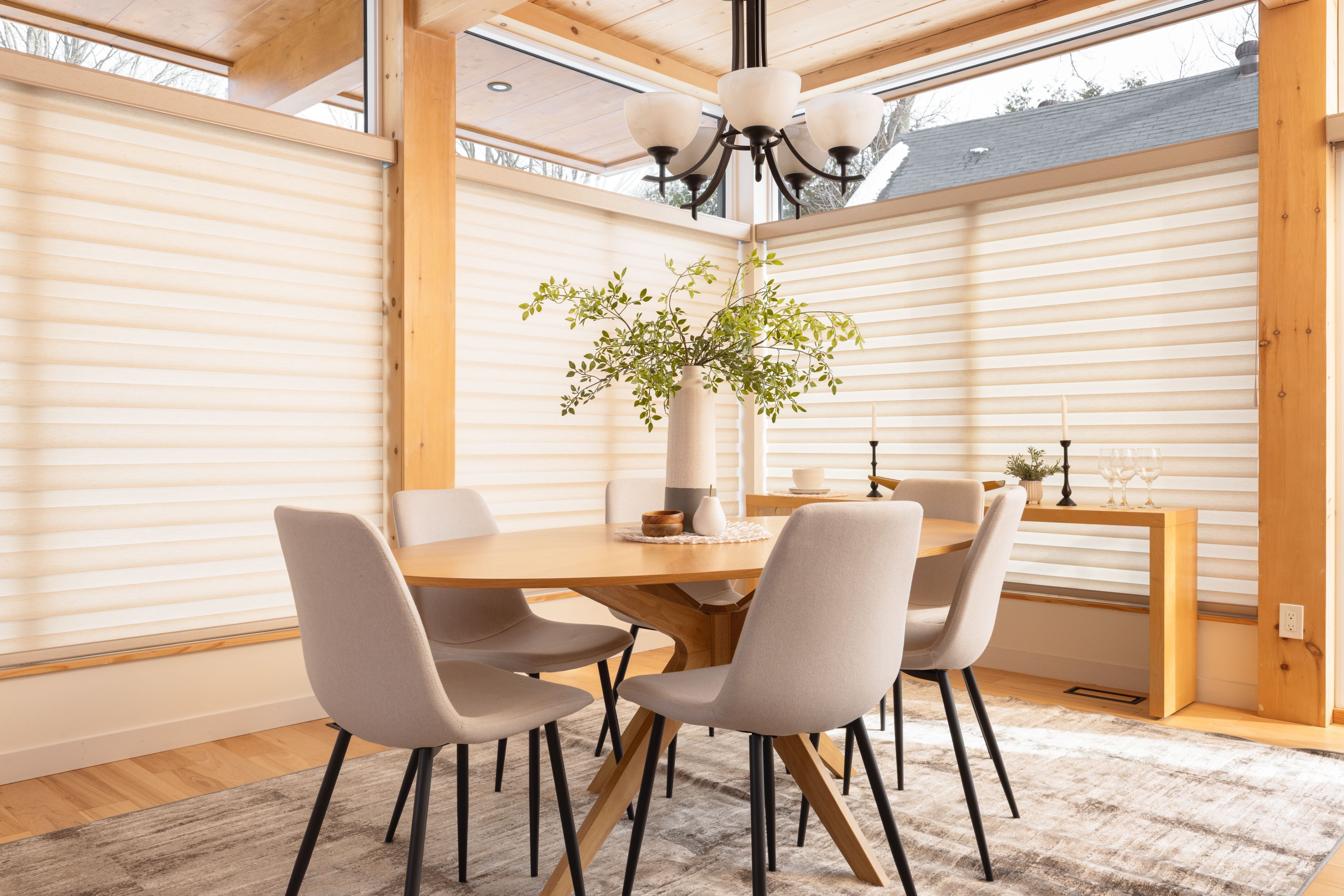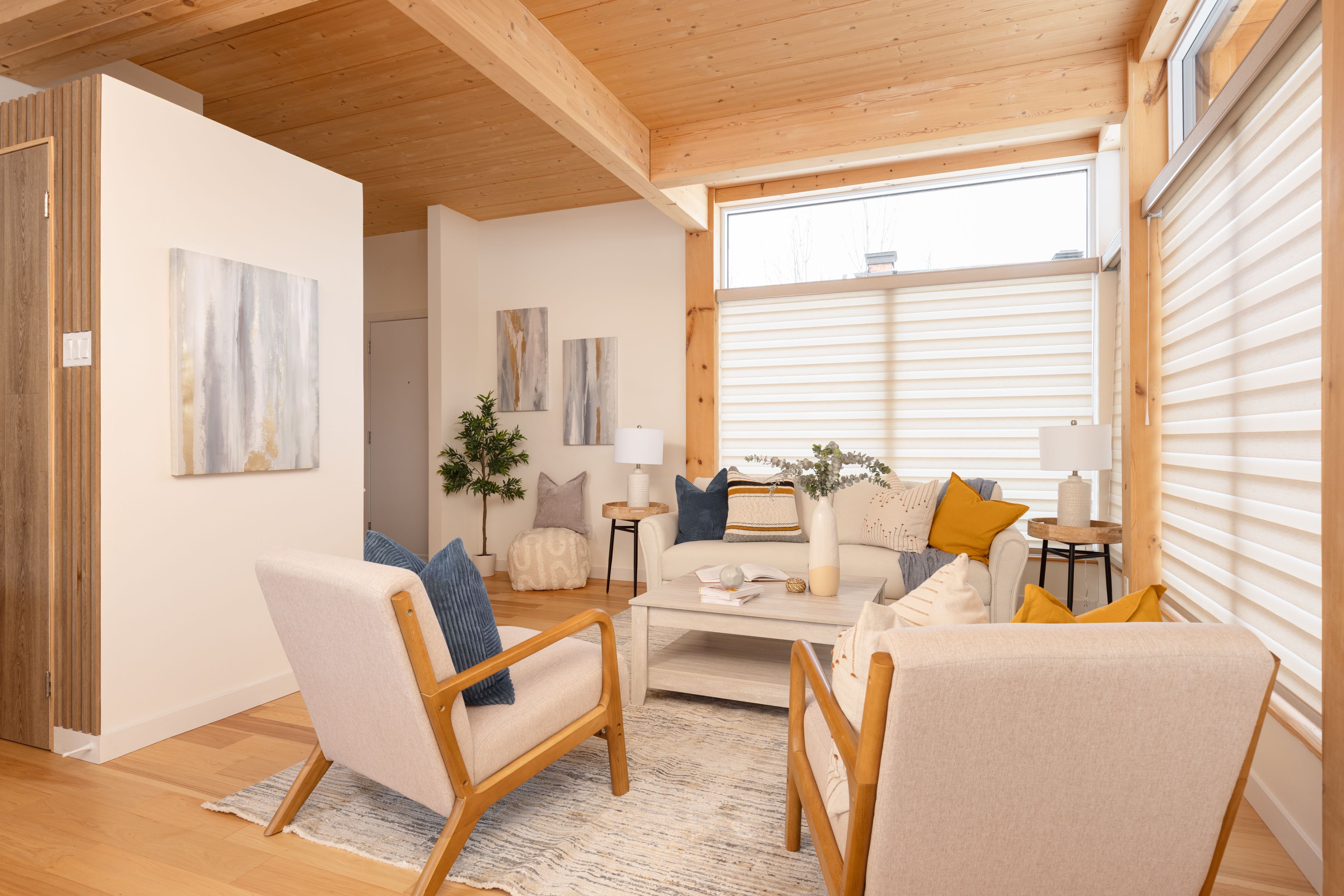 • Bright living space with large windows welcomes morning light.