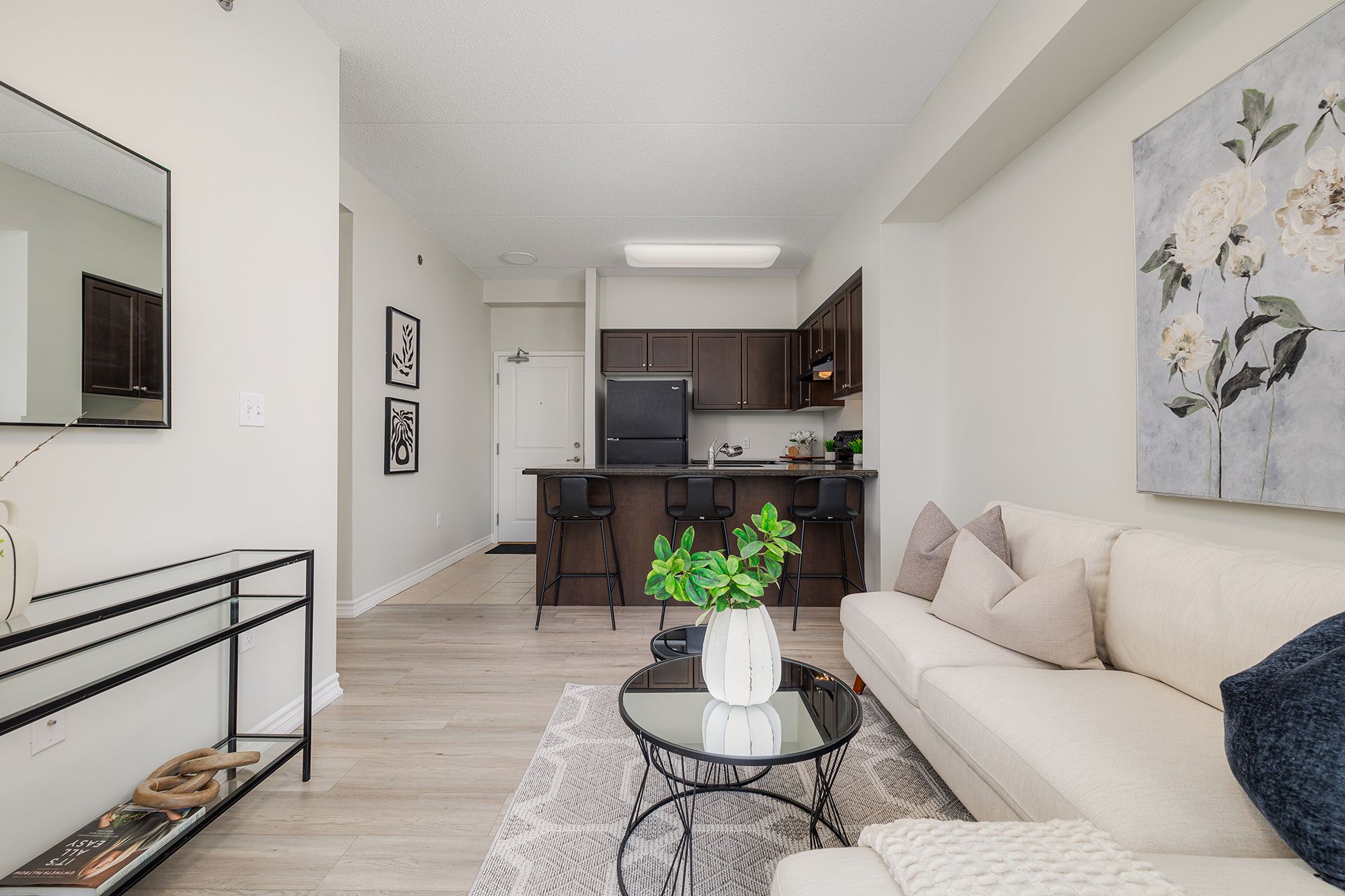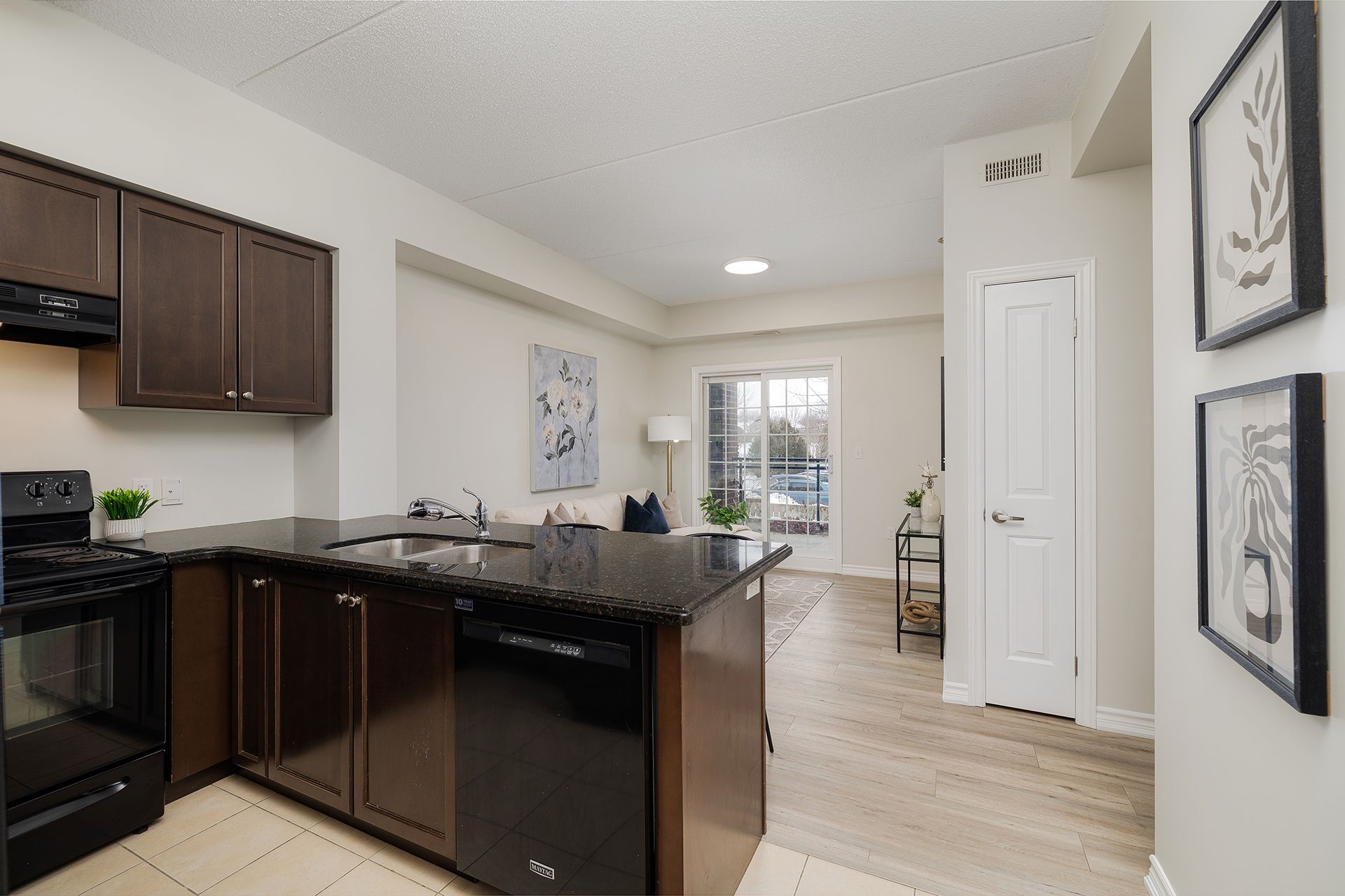 Welcome to grandview on gordon! This first-floor, 751 sqft unit offers a bright & functional layout in guelph's south end, with 2 bedrooms, 1 den, & a full bathroom. Carpet-free interior features brand-new luxury vinyl plank flooring (2026), 9ft ceilings & fresh paint throughout. The kitchen features black quartz counters, a full-size dishwasher & a convenient breakfast bar opening to the living area. A standout feature is the versatile den with its own closet, ideal for an office, extra storage, reading nook, or guest space. Updated with bright, new light fixtures throughout, this unit is truly move-in ready. Connect with the outdoors on the spacious private balcony. Benefit from in-suite stacked laundry, one secure underground parking space & a dedicated storage locker. Ideally located on a direct bus route, minutes from the university of guelph, shopping & entertainment in the heart of the south end, & easy 401 access. Move-in ready & perfect for low-maintenance living!