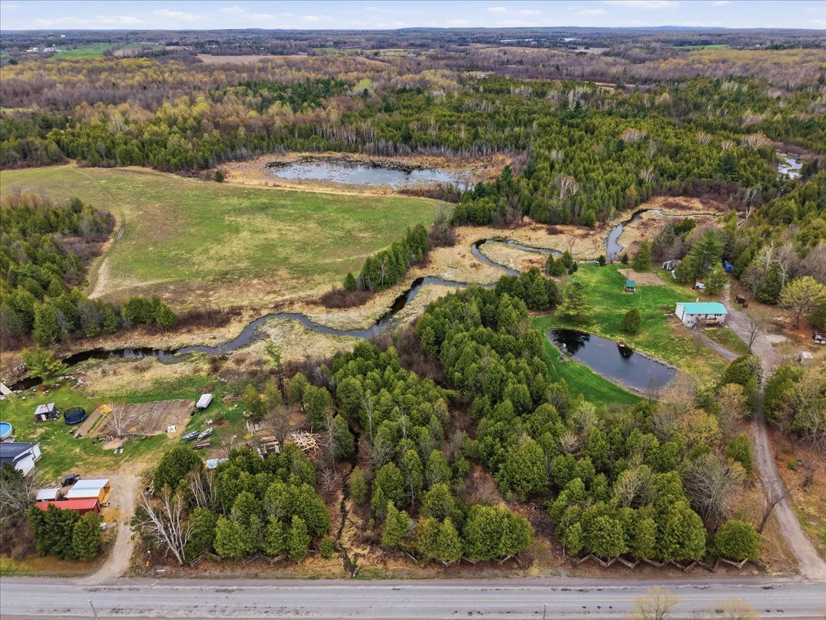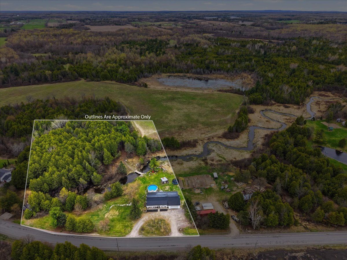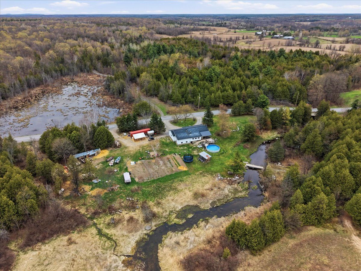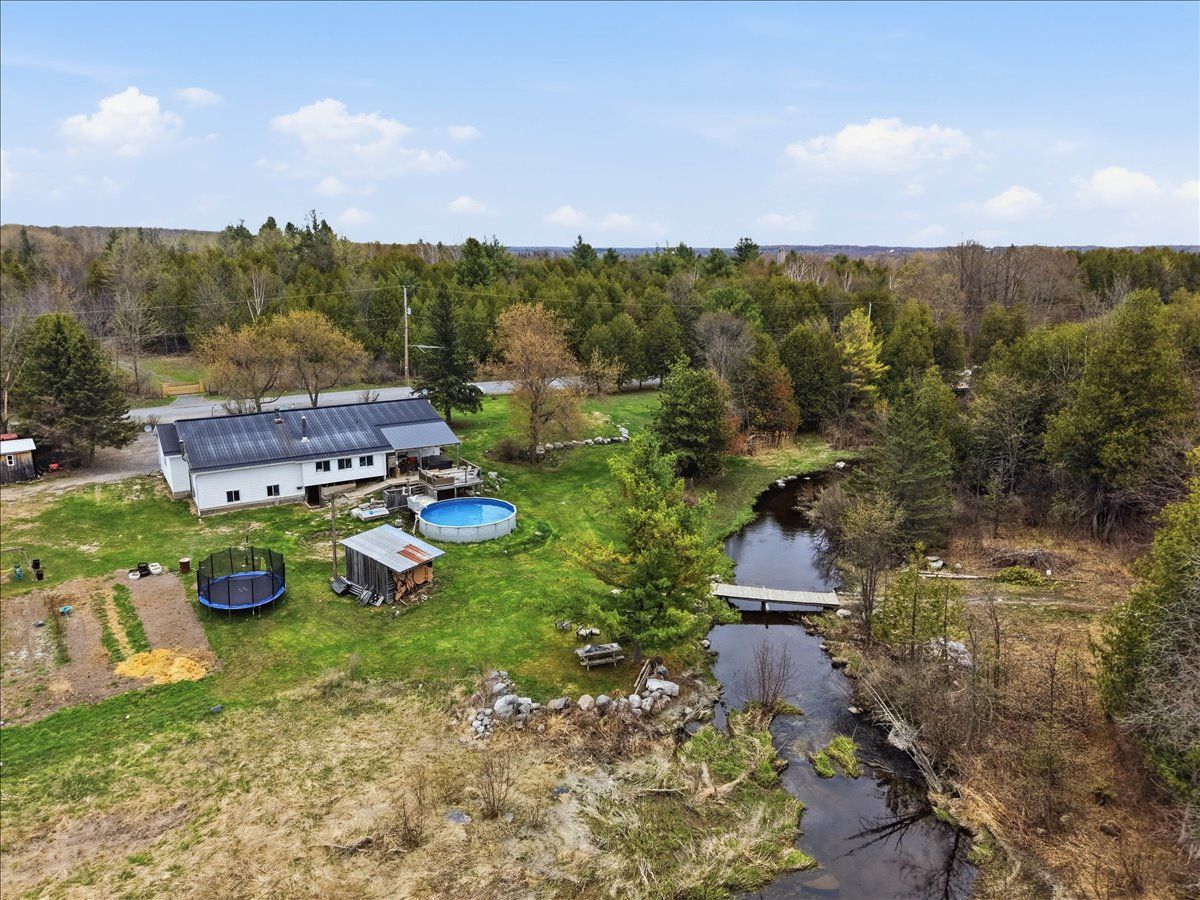 Set on a picturesque country lot, this raised bungalow at 1442 quin-mo-lac road offers comfortable rural living just outside the town of tweed. The home features a generous layout with seven bedrooms, making it well-suited for larger families, home-based living, or those seeking extra space. The main living areas are bright and functional, with a formal dining room, a well-equipped kitchen, a cozy living room and bonus indoor man-cave! Heating is provided by propane forced air and 2 wood stoves for flexibility ,complemented by a metal roof and concrete foundation. The attached garage adds convenience and ample storage. Outside, enjoy landscaped grounds, established gardens, an above-ground pool (2022), and a covered deck with hot tub (2022). A peaceful creek borders part of the property, enhancing the natural setting.