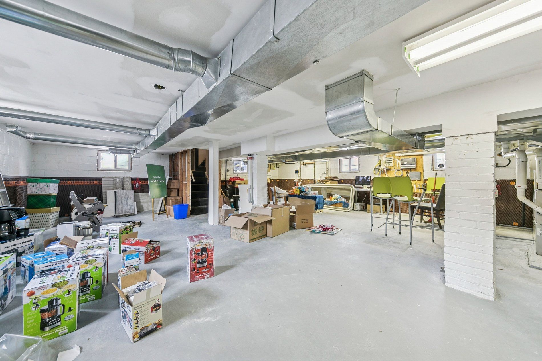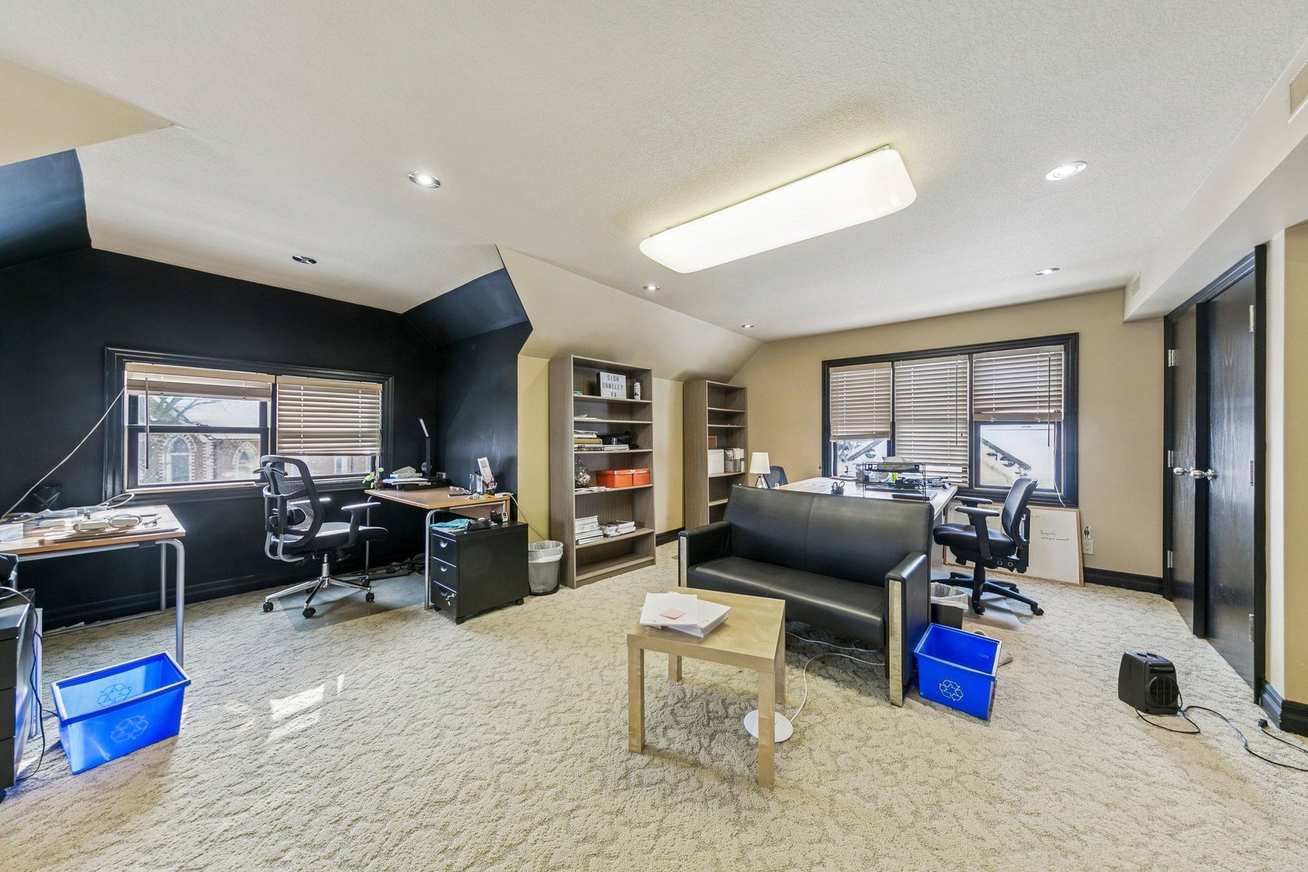 Well-appointed 2,089 sq ft office space with a functional layout, including open workspace and private offices. Features a built-out kitchen and additional basement storage space (not included in square footage). Bright interior with ample windows and skylight. Prominent corner property offering excellent exposure. Accessible location with many nearby amenities.