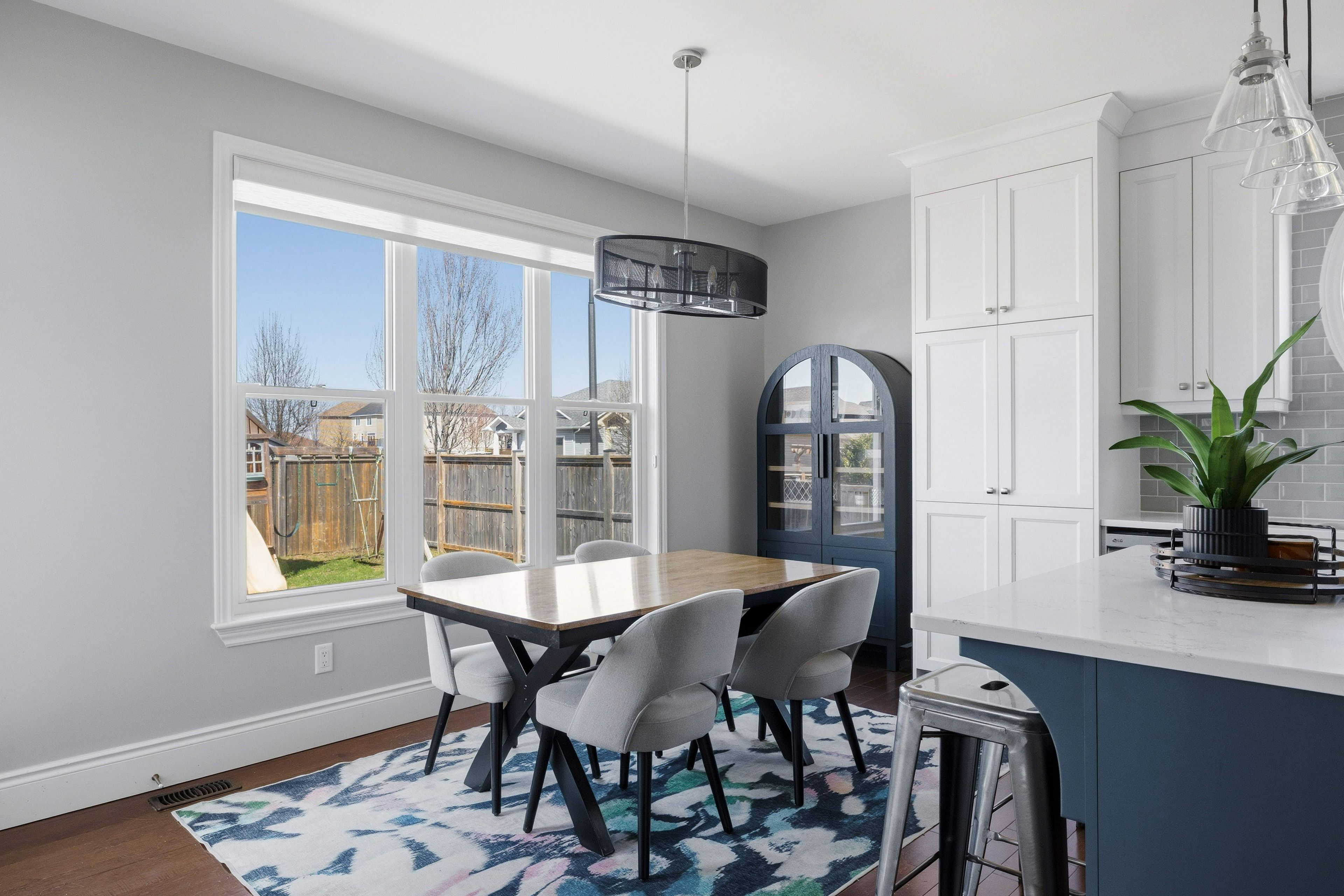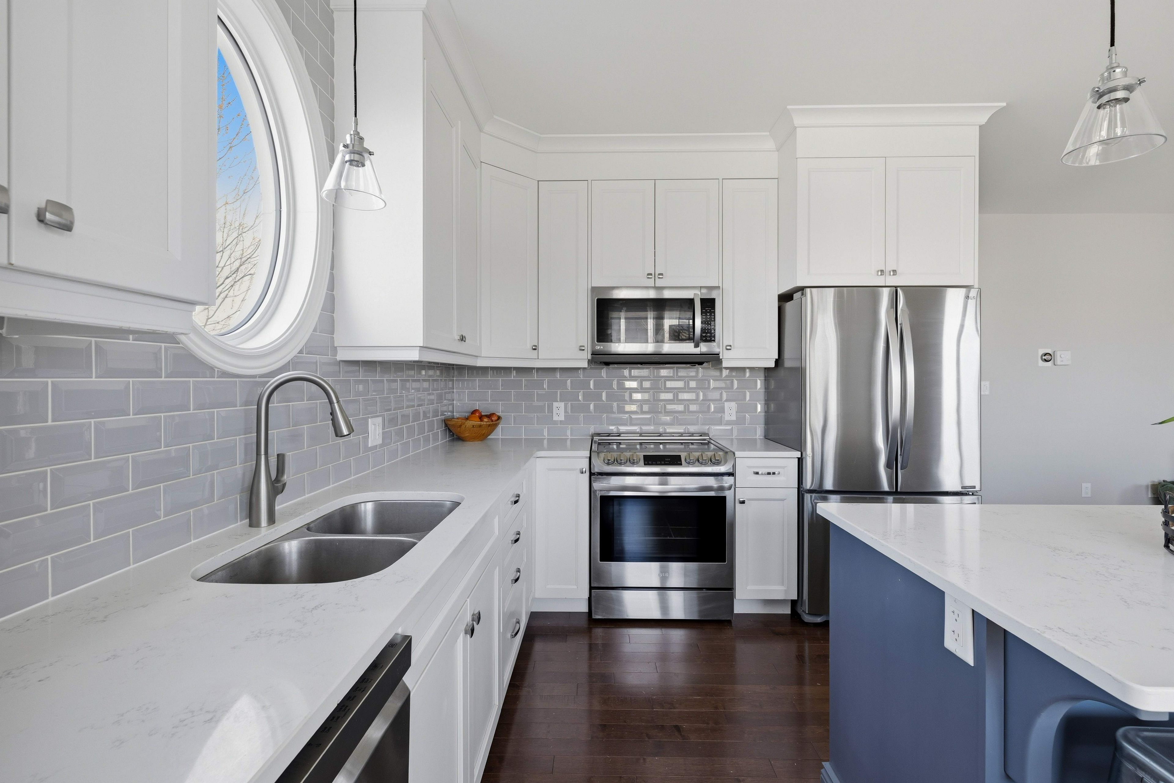 • Spacious kitchen with quartz countertops and a view of the backyard.