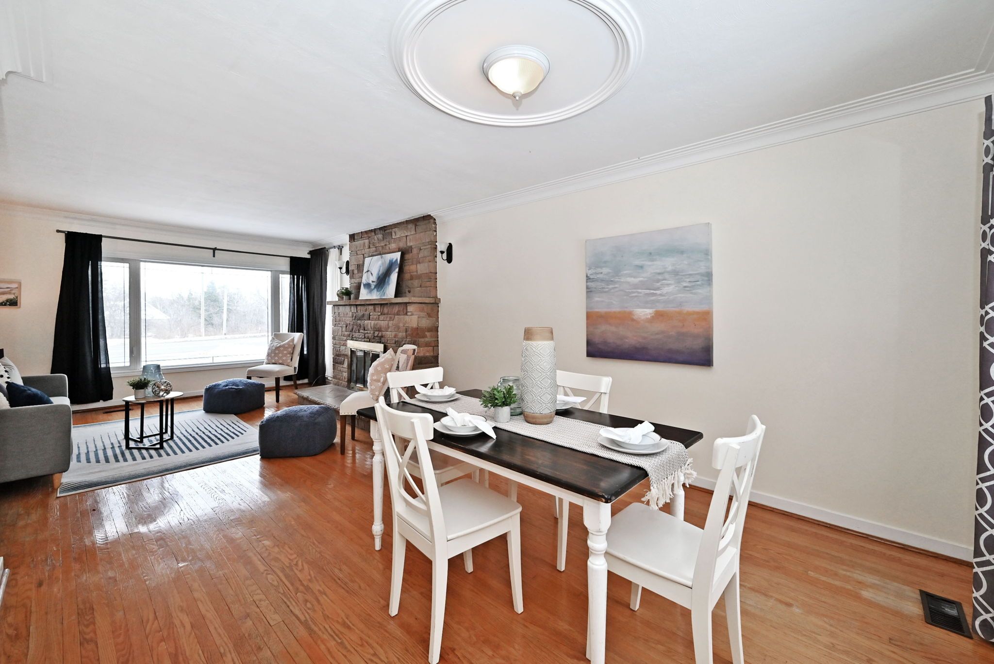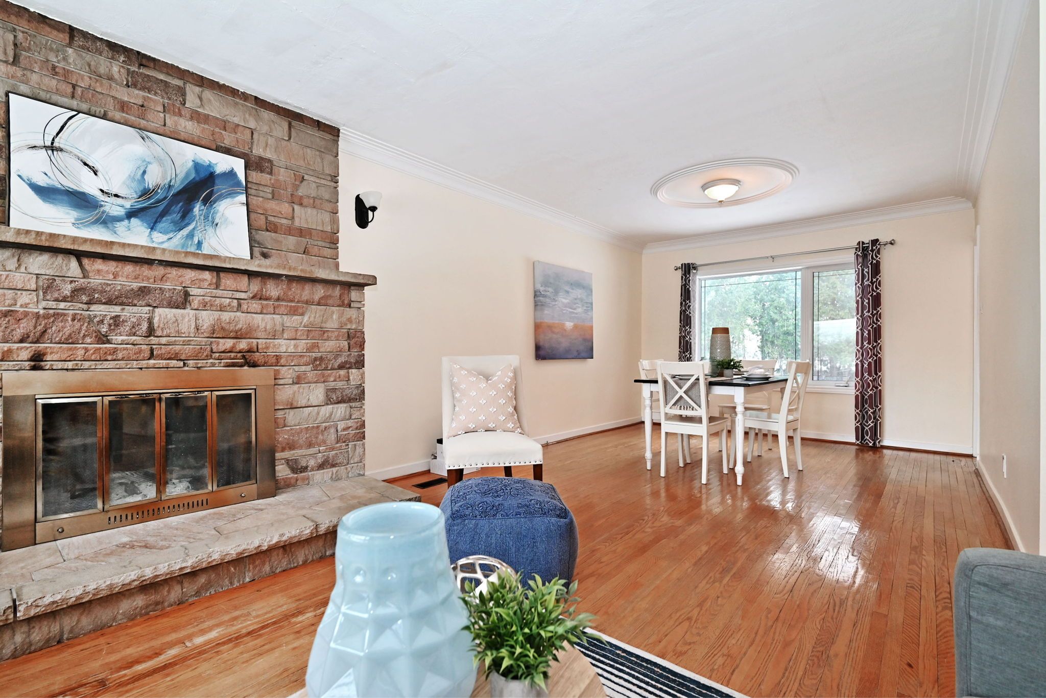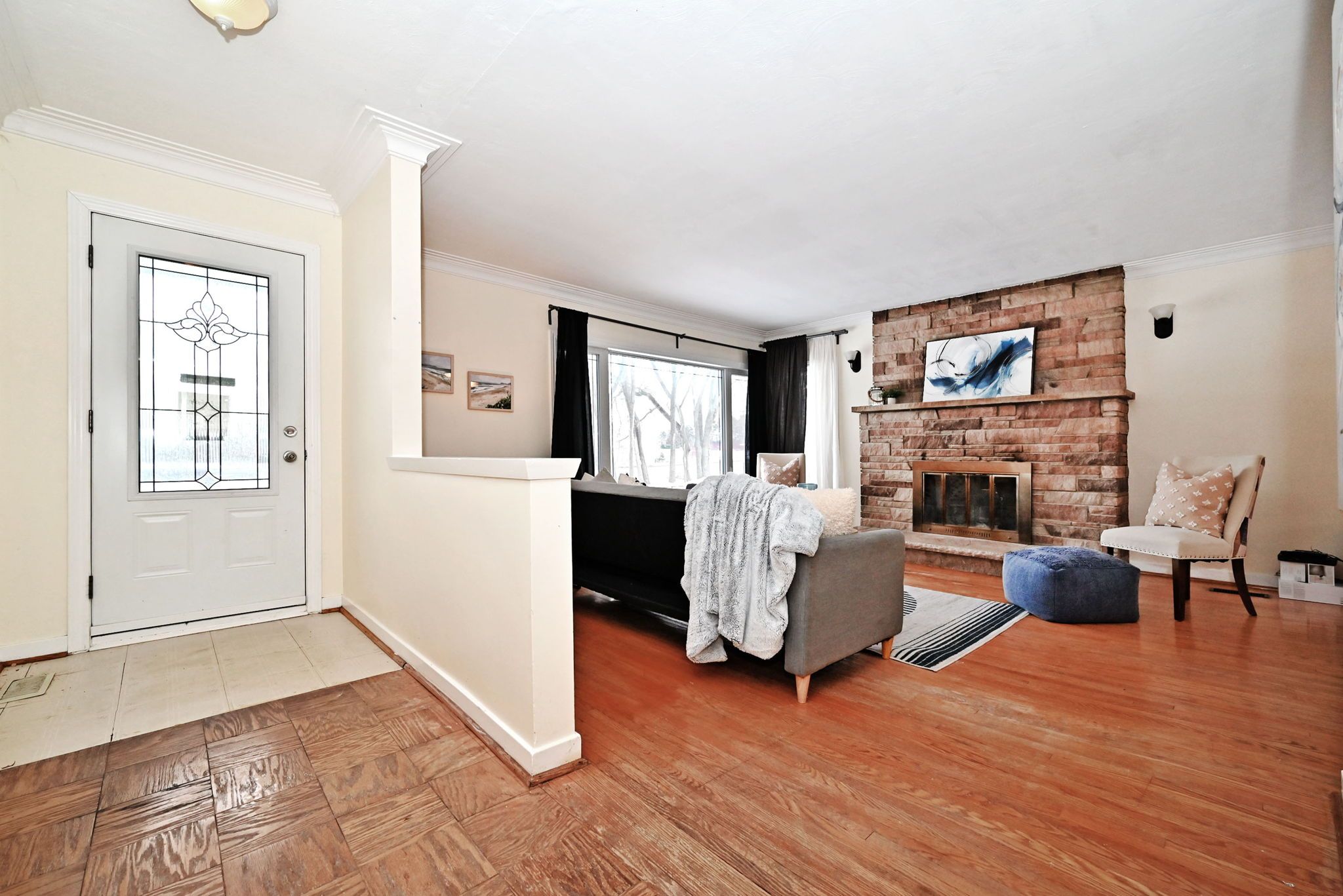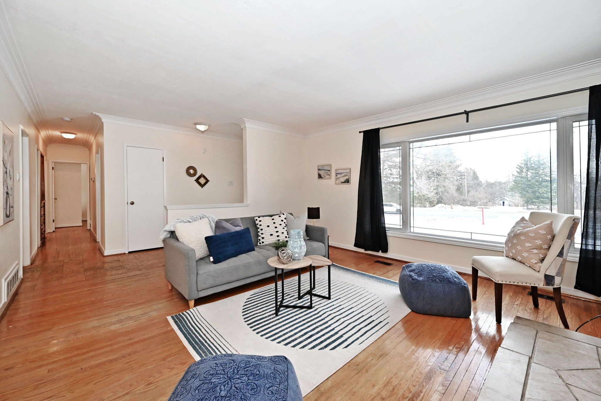• Strip hardwood flooring throughout adds a classic touch.