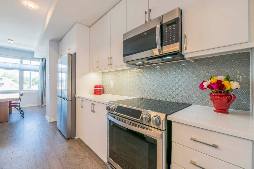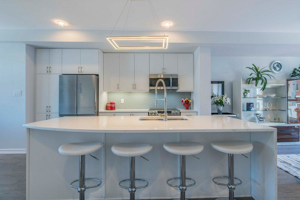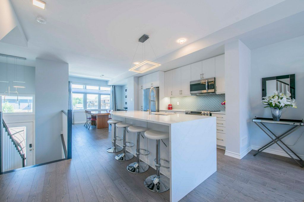 • Main floor kitchen features a quartz waterfall island and stainless steel appliances.