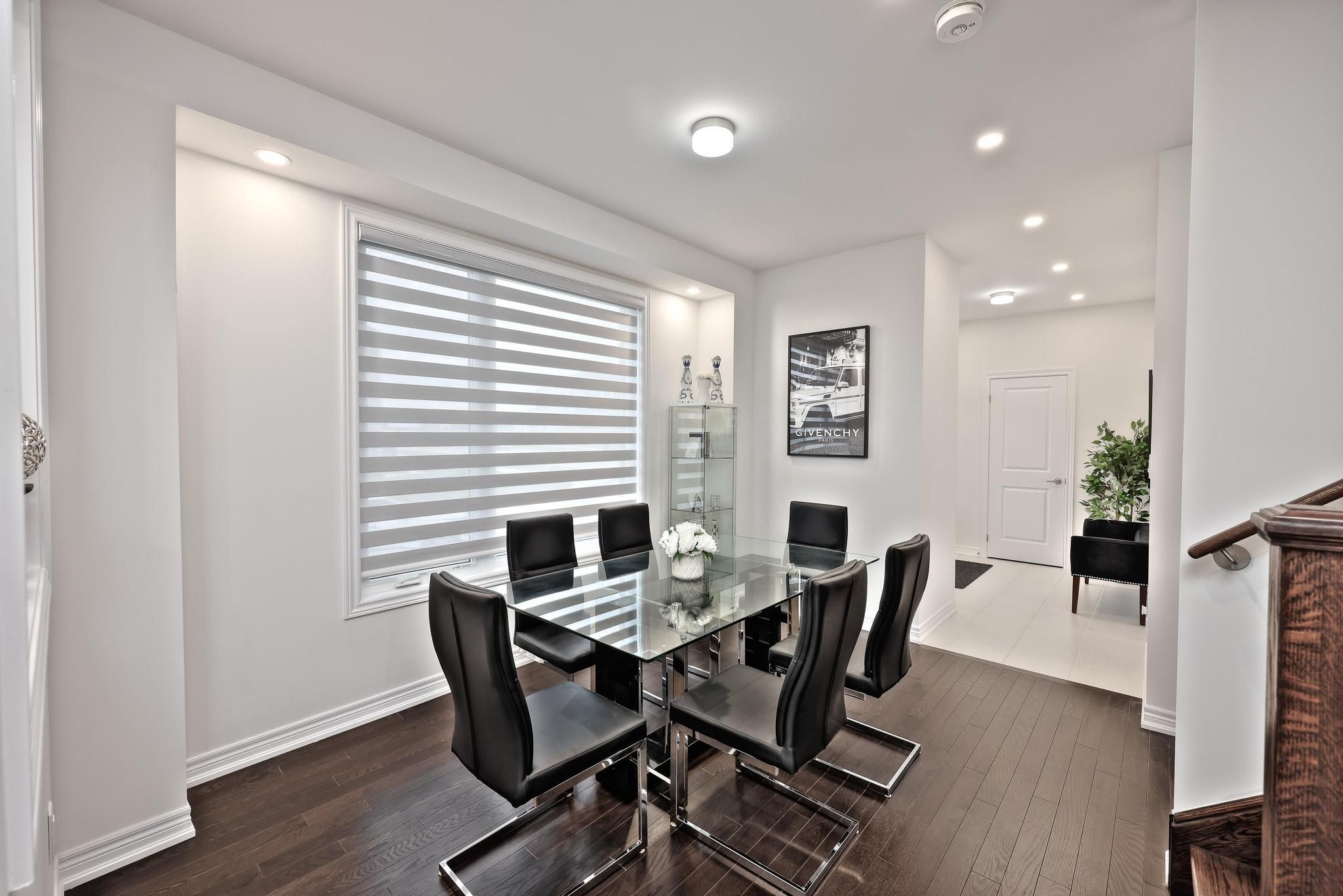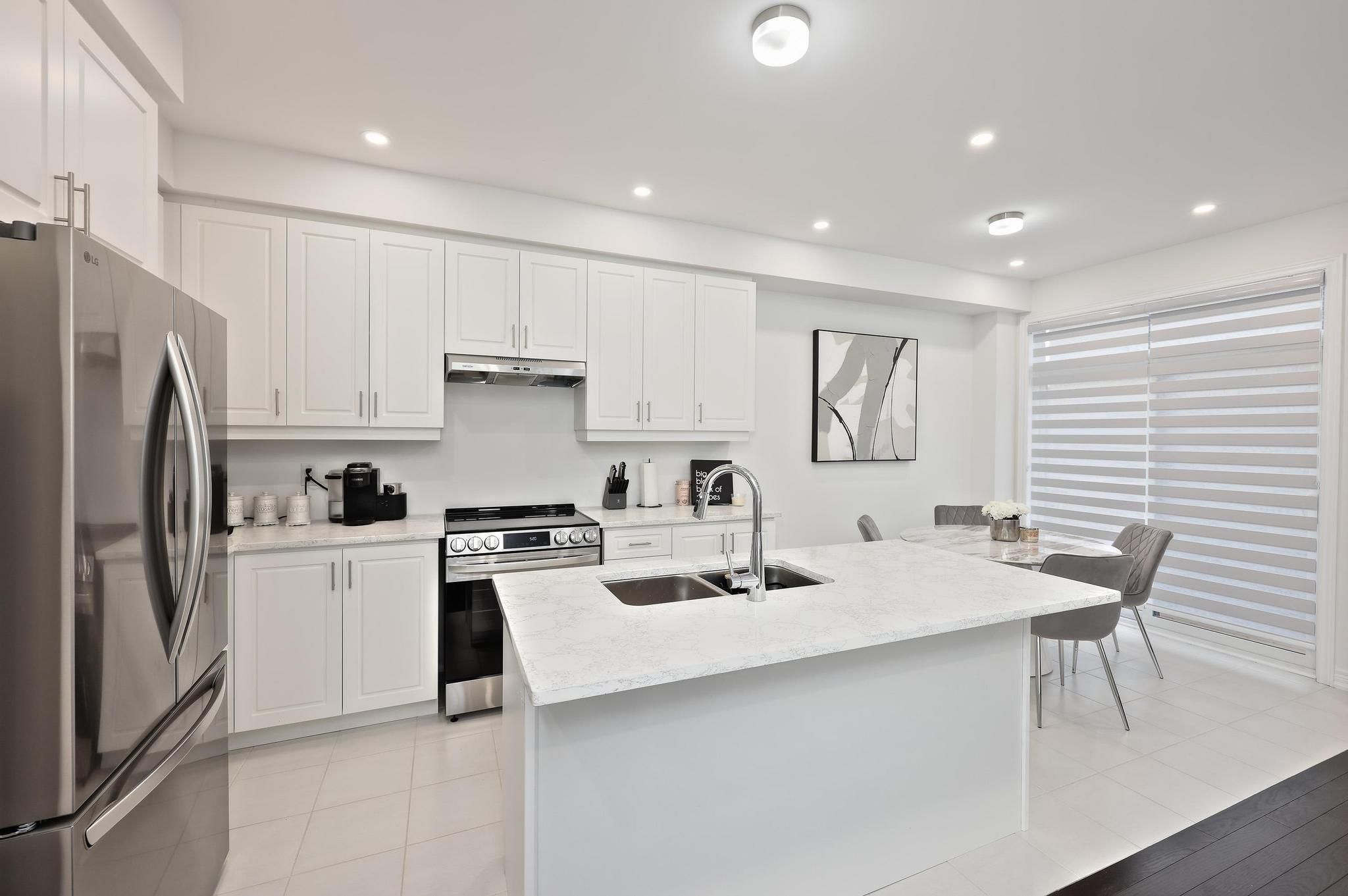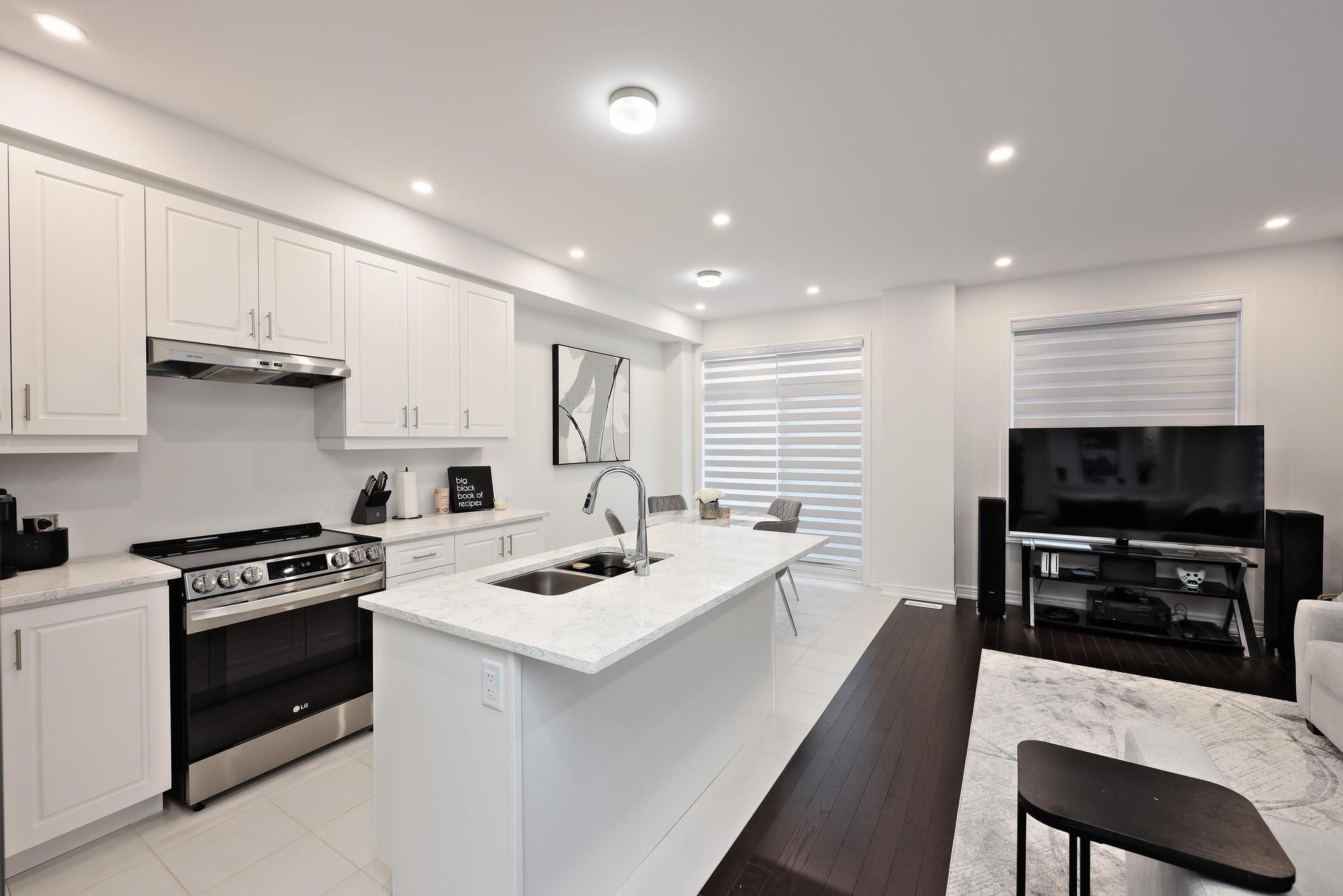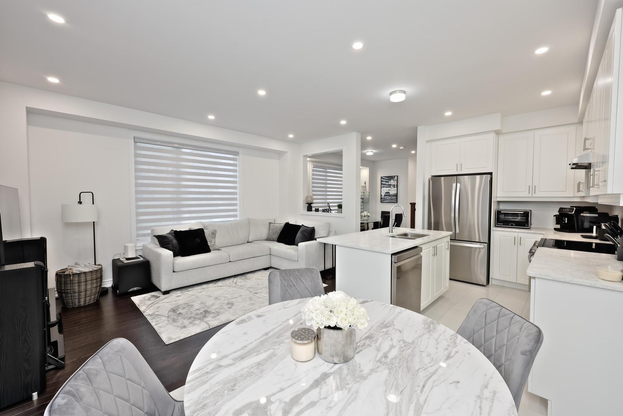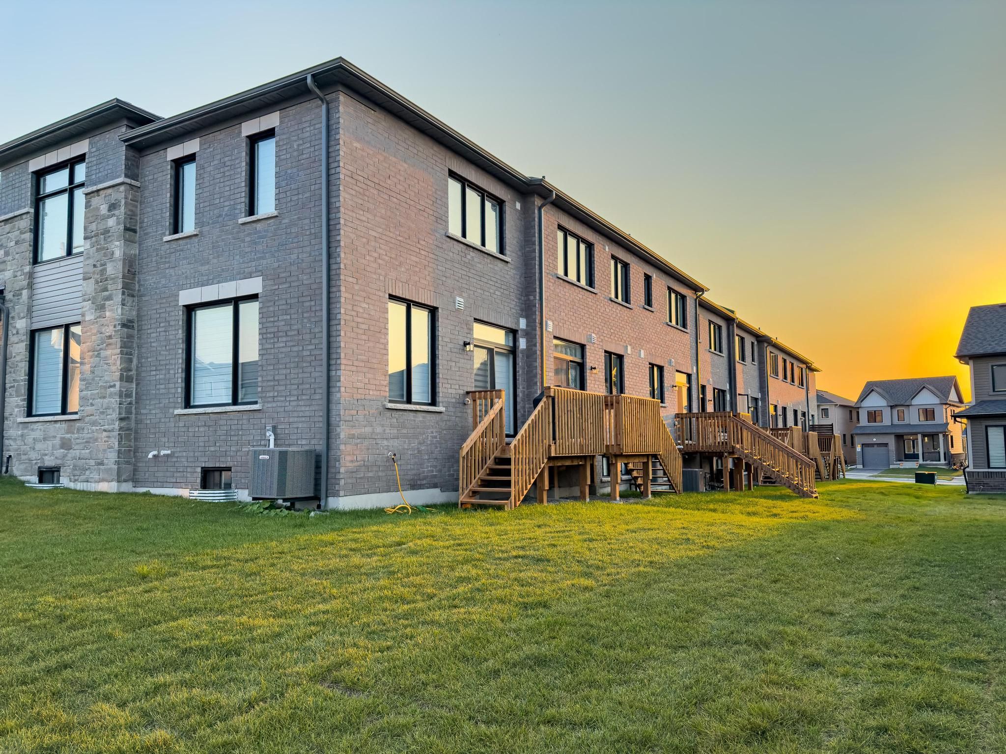 Welcome to 145 fenchurch manor, an exquisite end-unit townhouse nestled on a prime corner lot in barrie. This beautifully upgraded home features stunning stone detailing and modern grey brick, enhancing its curb appeal. With an abundance of oversized windows, the interior is flooded with natural light, highlighting the elegant dark hardwood floors throughout. Step inside to discover a thoughtfully designed open-concept floor plan that seamlessly integrates the kitchen, breakfast area, living room, and dining room perfect for both relaxation and entertaining. The main floor boasts 9-foot smooth ceilings and stylish pot lights, creating a contemporary ambiance. The upgraded kitchen is a chef's dream, featuring a upgraded quartz countertop and island with an extended breakfast bar, complemented by brand new lg stainless steel appliances & under mount lighting. The inviting eating area flows seamlessly to a spacious backyard, perfect for outdoor gatherings. Upstairs, youll find three generously sized bedrooms, along with convenient second-floor laundry. The primary suite is a luxurious retreat, featuring a 3-piece ensuite bath with an upgraded raised-height quartz countertop, a sleek tiled glass shower, and a walk-in closet with picturesque windows that offer lovely views. The second bedroom is versatile, easily serving as a guest room or home office, while the third bedroom comfortably accommodates a queen-size bed and includes a walk-in closet. The modern 4-piece second-floor bathroom boasts stylish black tiles and a soothing waterfall shower head, adding a touch of sophistication. Location couldn't be better just minutes from downtown barrie's waterfront, you'll have access to a wealth of dining, shopping, and other amenities. Families will appreciate the proximity to several schools, friday harbour, and easy access to highway 400. Dont miss this opportunity to own a stunning townhouse in one of barries most desirable areas! Fence being installed soon!