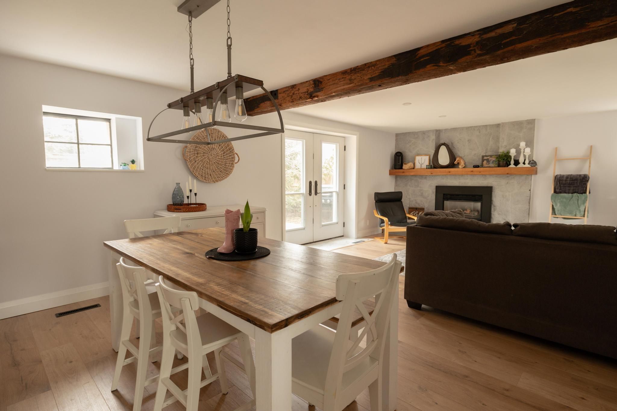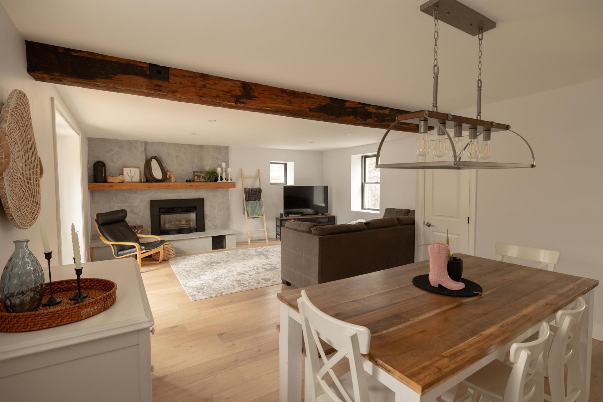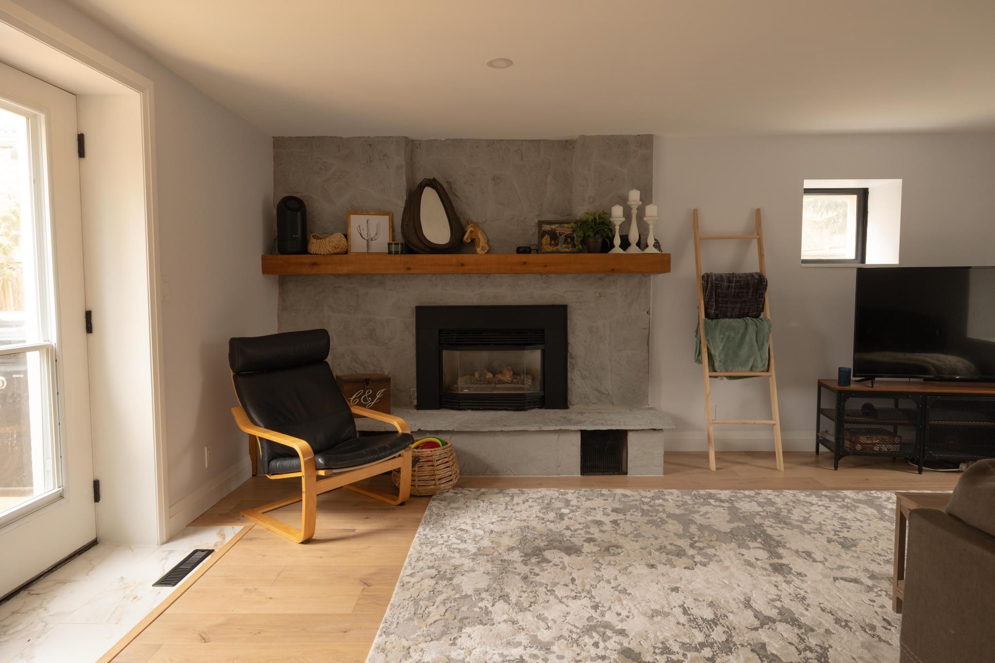 • Cozy living area featuring a stone gas fireplace for warmth and character.