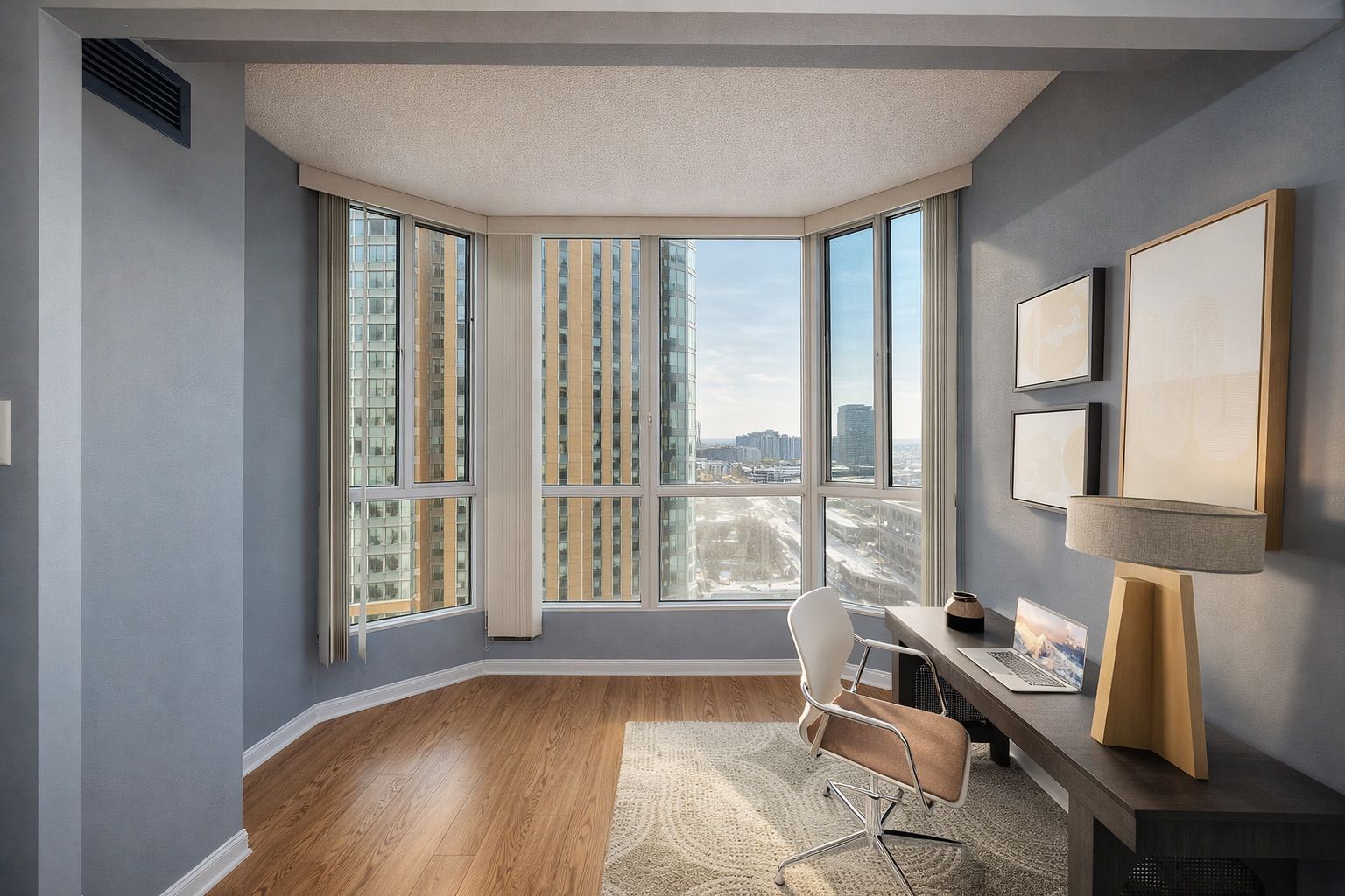 Lovely and bright unit in a quiet, mature building - just a 5 minute walk from the cooksville go station. Fantastic layout that can be configured various ways. This well maintained unit features laminate flooring throughout and spacious rooms with excellent light. Large combined open concept living/dining area flows into the sunny solarium, a perfect office space (as shown) or reading nook. Modern eat-in kitchen with good storage and counter space. Primary bedroom features a walk-in closet and a nicely renovated bathroom next door. The large den has its own window - can be enclosed for a bedroom/office or used open as a formal dining room (as shown). Ensuite locker for convenient and ample storage. Underground parking spot. Friendly and well-maintained complex with a true community-feel - and excellent amenities including concierge, sauna, gym, party room and visitor parking. Close to shopping, recreation, schools and highways.