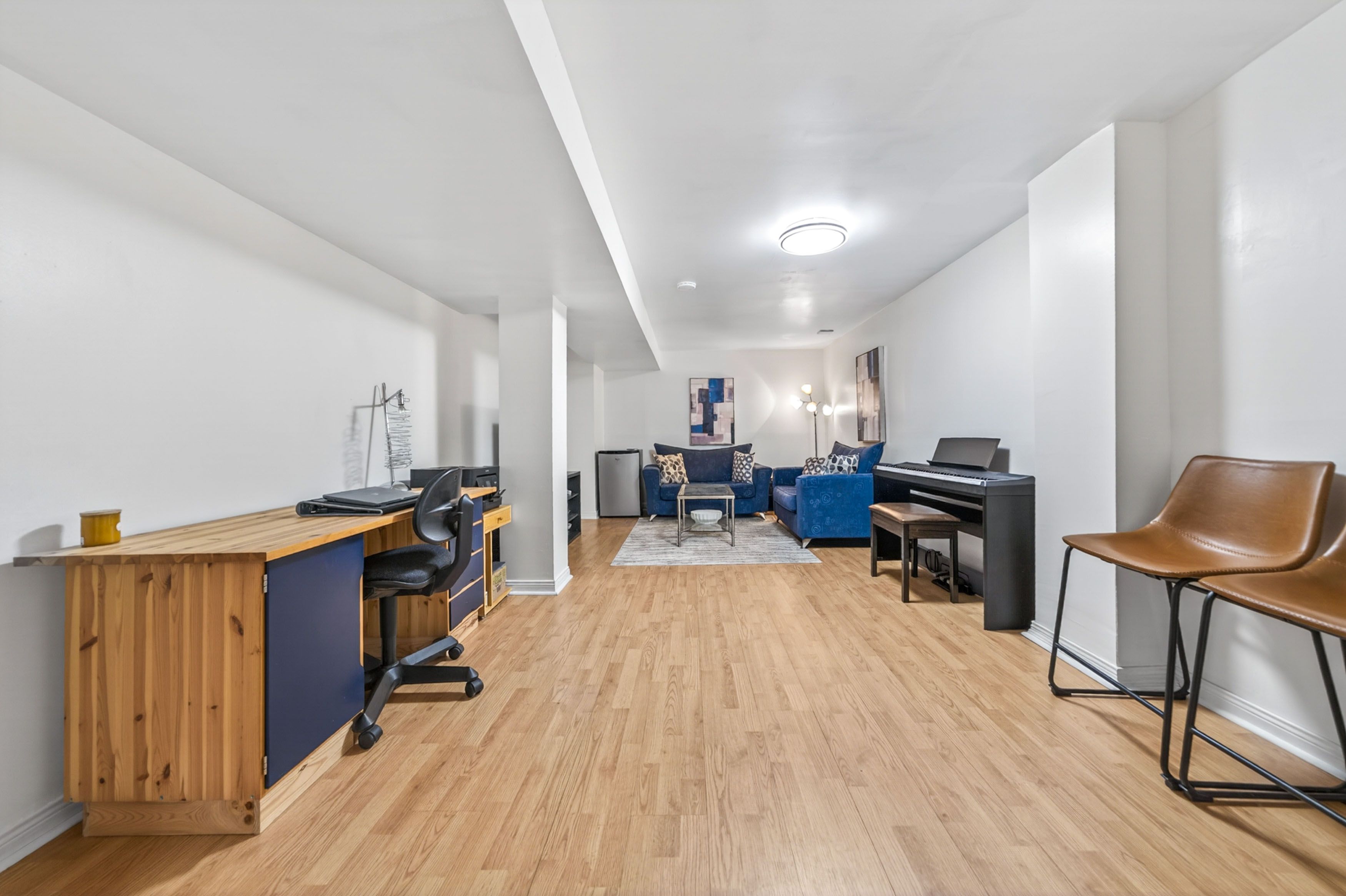 • Spacious upper living room with a tray ceiling and private balcony.