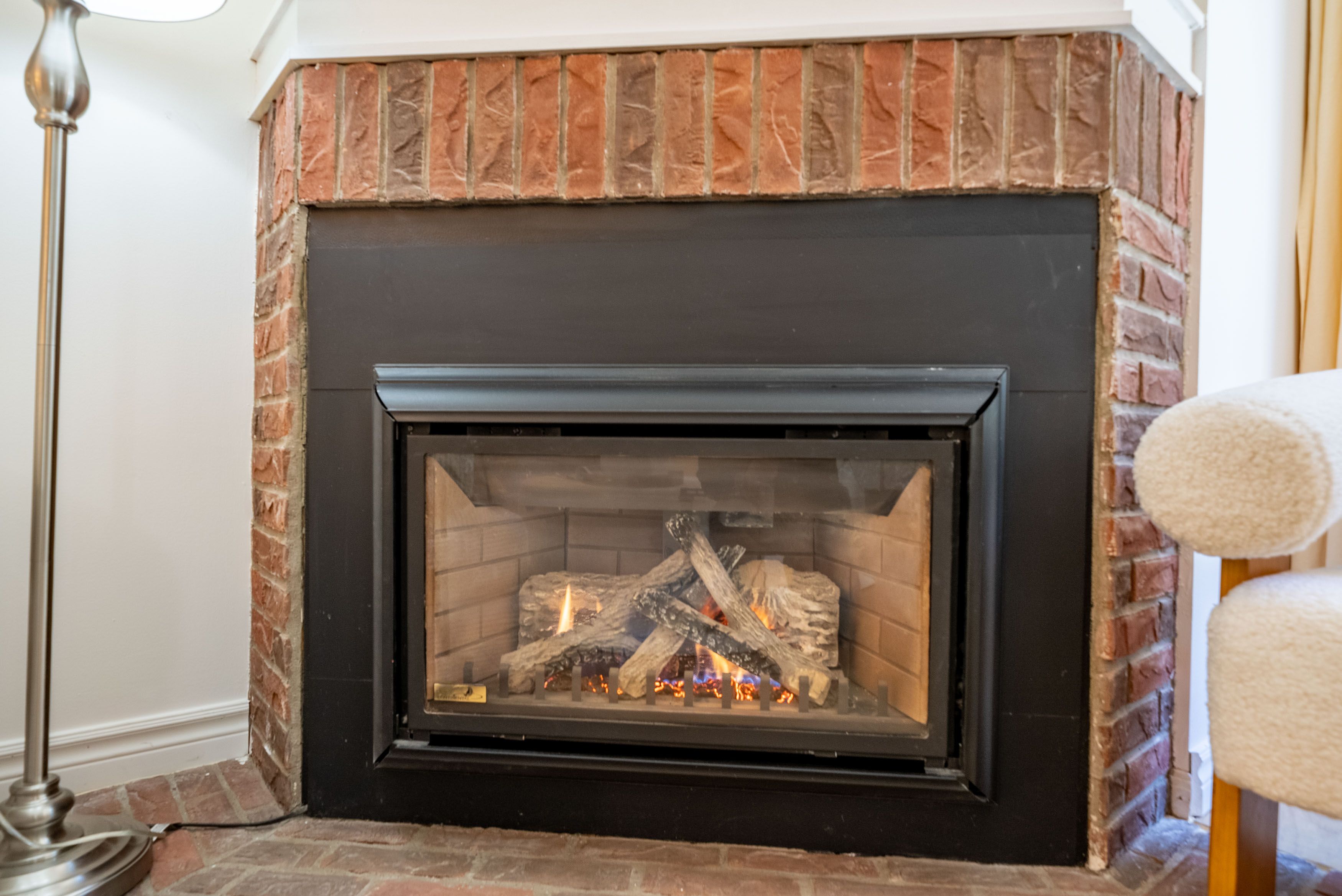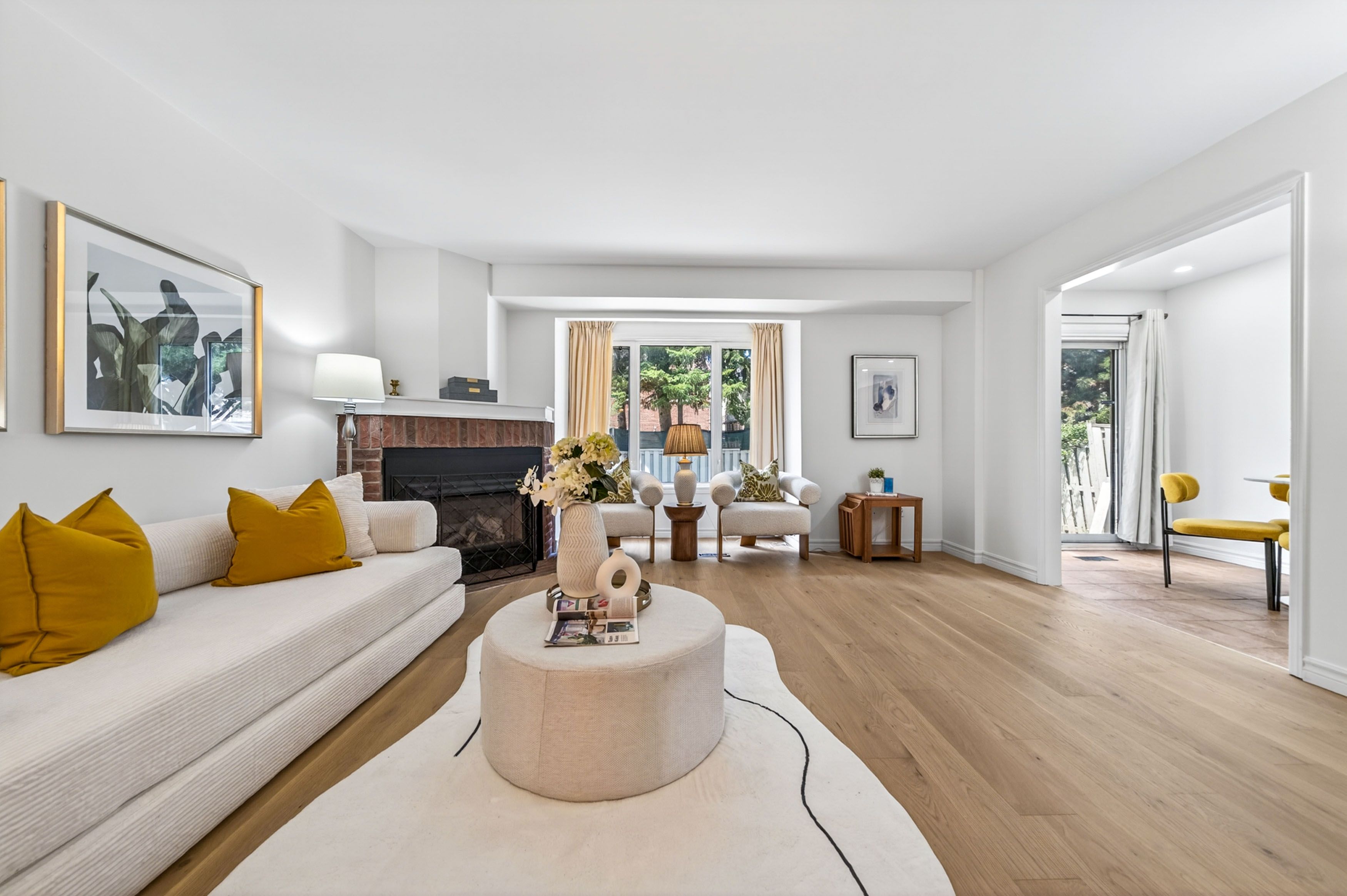 • Cozy main floor family room with gas fireplace and bay windows.