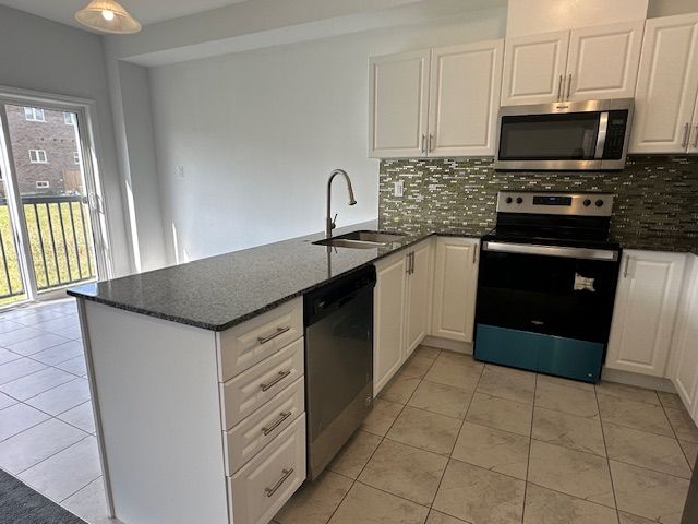 • Open-concept kitchen with elegant quartz countertops and breakfast bar.