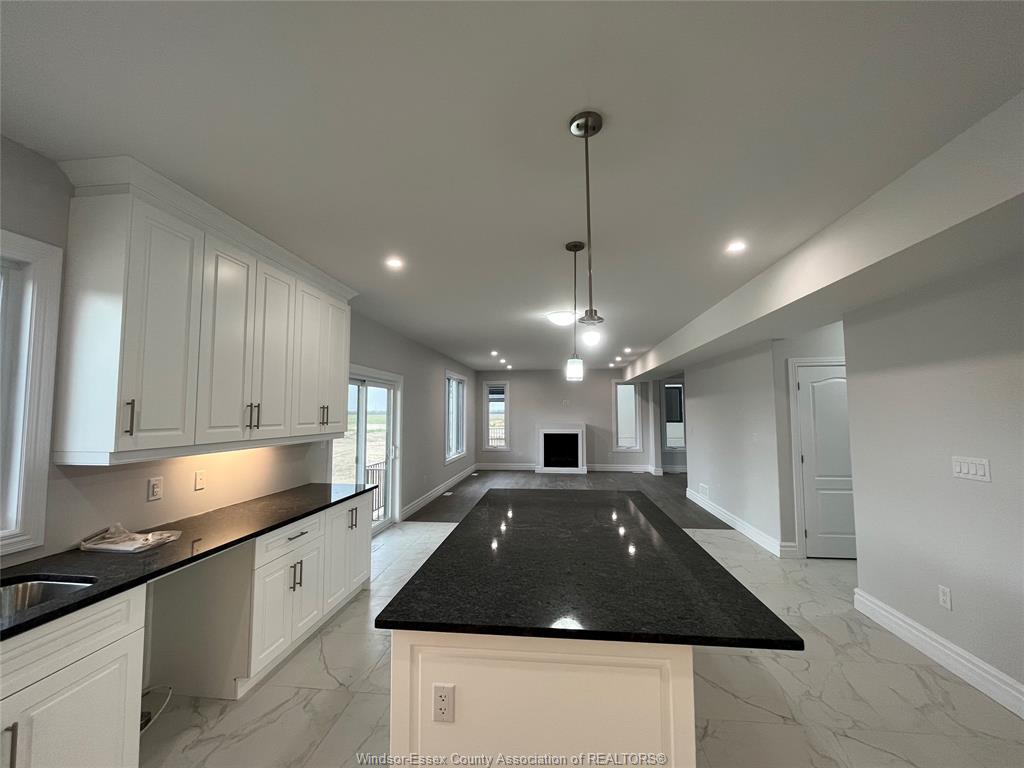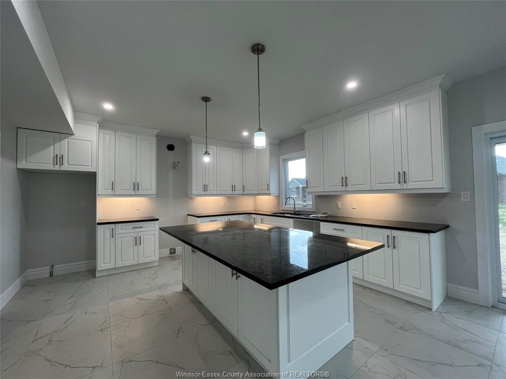 • Large kitchen features an island and stainless steel appliances.