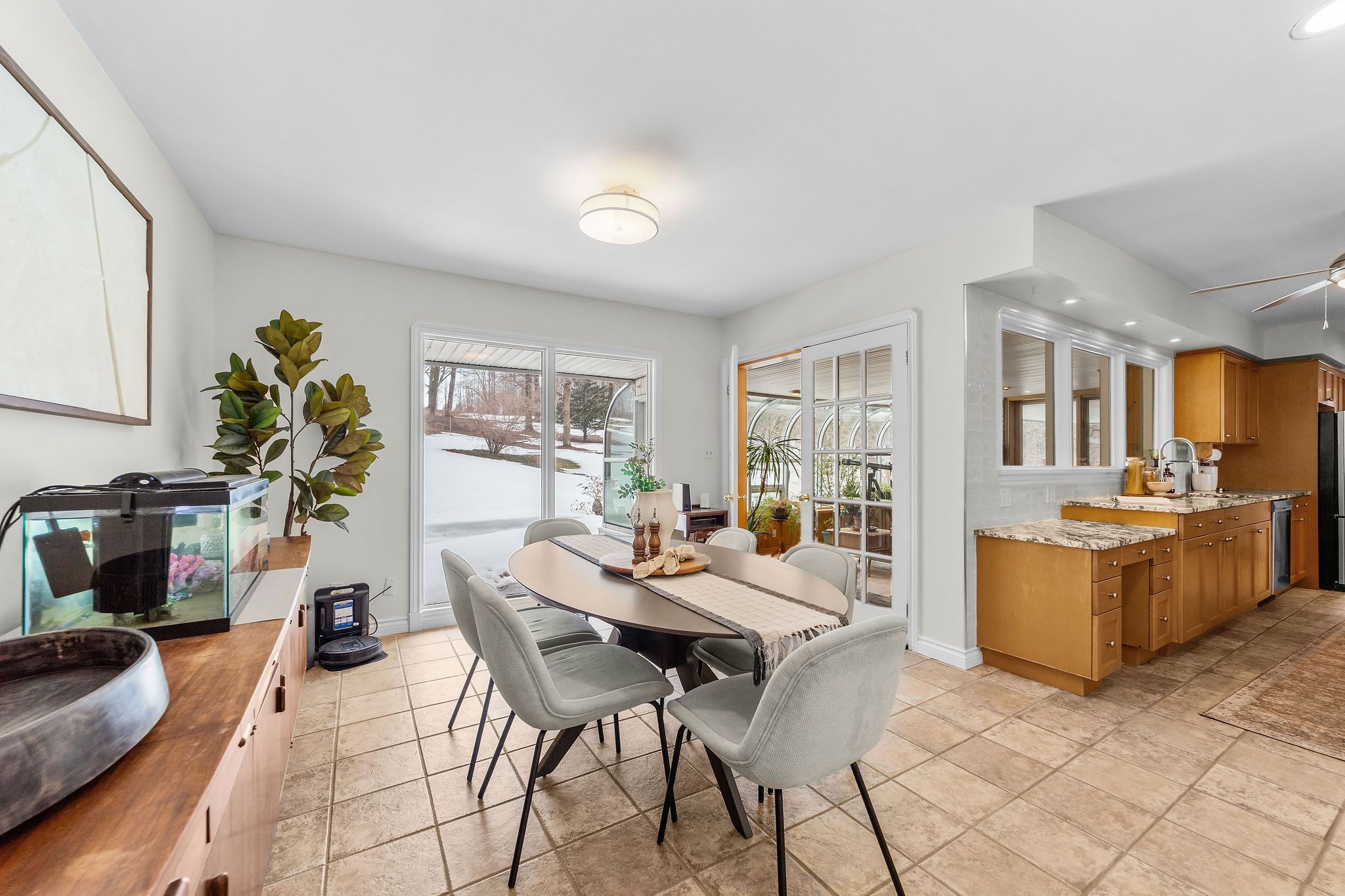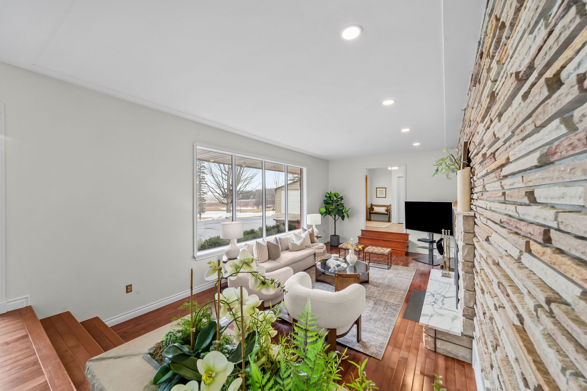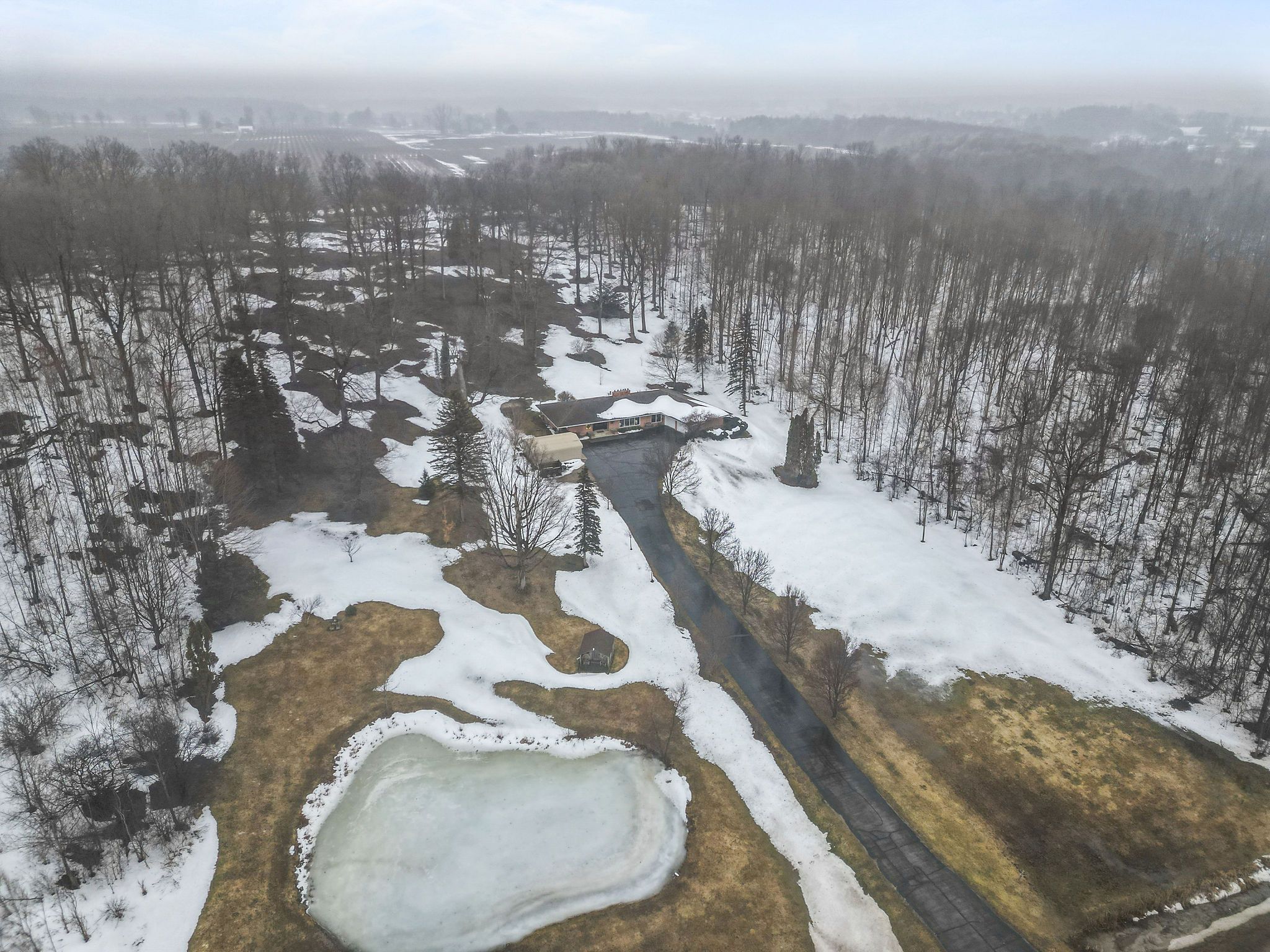 A rare opportunity to own a picturesque 5. 7 acre country estate. This classic mid-century modern home offers exceptional privacy, natural beauty, and timeless architectural style. Large windows throughout the home invite abundant natural light while capturing peaceful views of the surrounding countryside. The main level showcases a traditional mid-century modern layout with distinct , well-designed living spaces. A spacious timeless kitchen provides ample room for cooking and gathering , while the large sunken living room with an attached dining area creates an inviting setting for both everyday living and entertaining. The home features 3 spacious main floor bedrooms, 2. 5 bathrooms, and the convenience of main floor laundry. A bright 4-season sunroom offers the perfect place to relax and enjoy the changing seasons year round. The fully finished basement expands the living space, making this home an entertainer's dream with plenty of room for recreation, hosting guests, or additional living areas. The property also includes an attached double car garage and a large detached workshop, offering storage and functionality for tools, equipment or hobbies. Surrounded by 5. 7 acres of scenic countryside, this exceptional property offers the perfect balance of privacy, outdoor enjoyment, and peaceful rural living, all while showcasing the enduring character of mid-century modern design.
