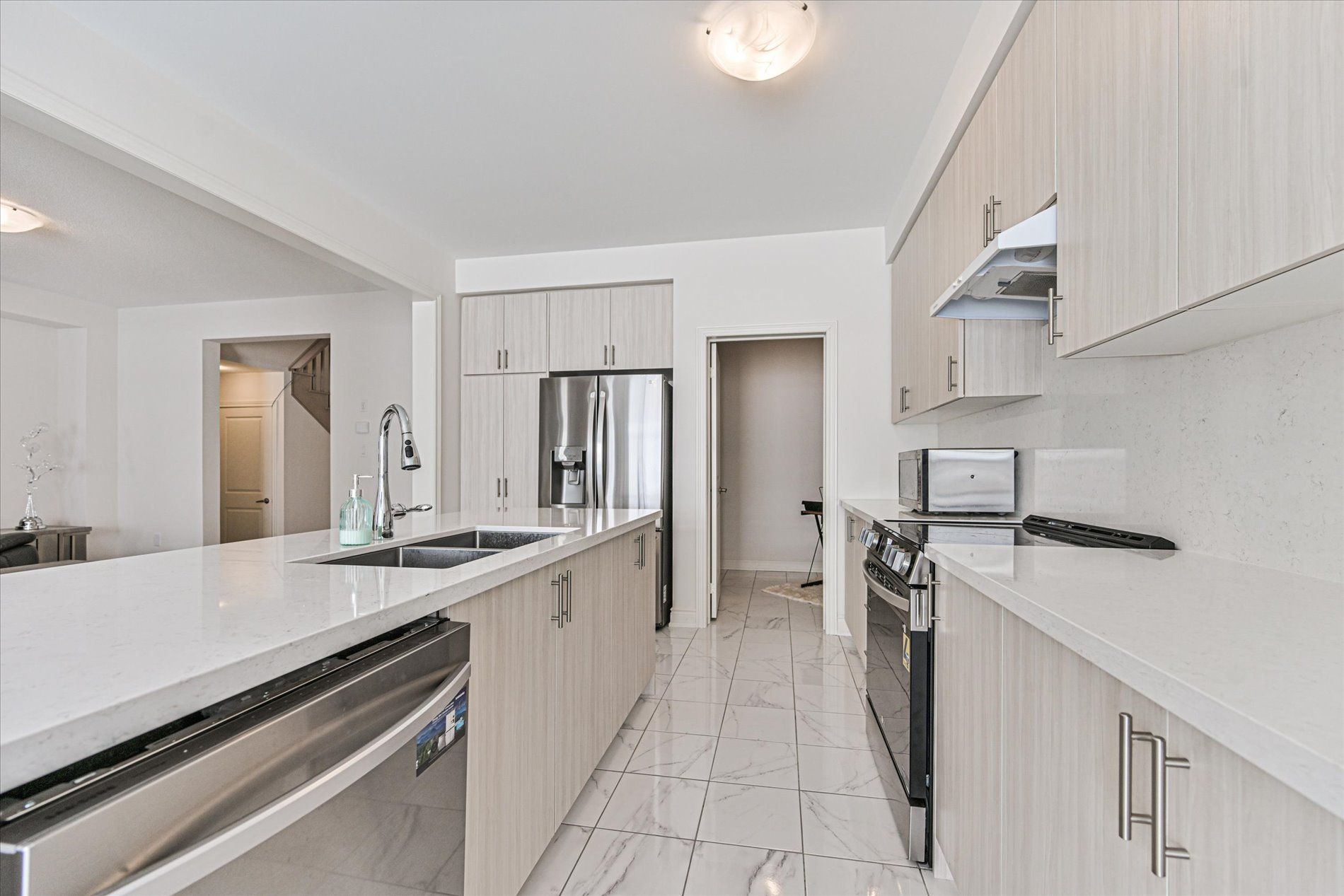 • Modern kitchen with stainless steel appliances and quartz countertops.