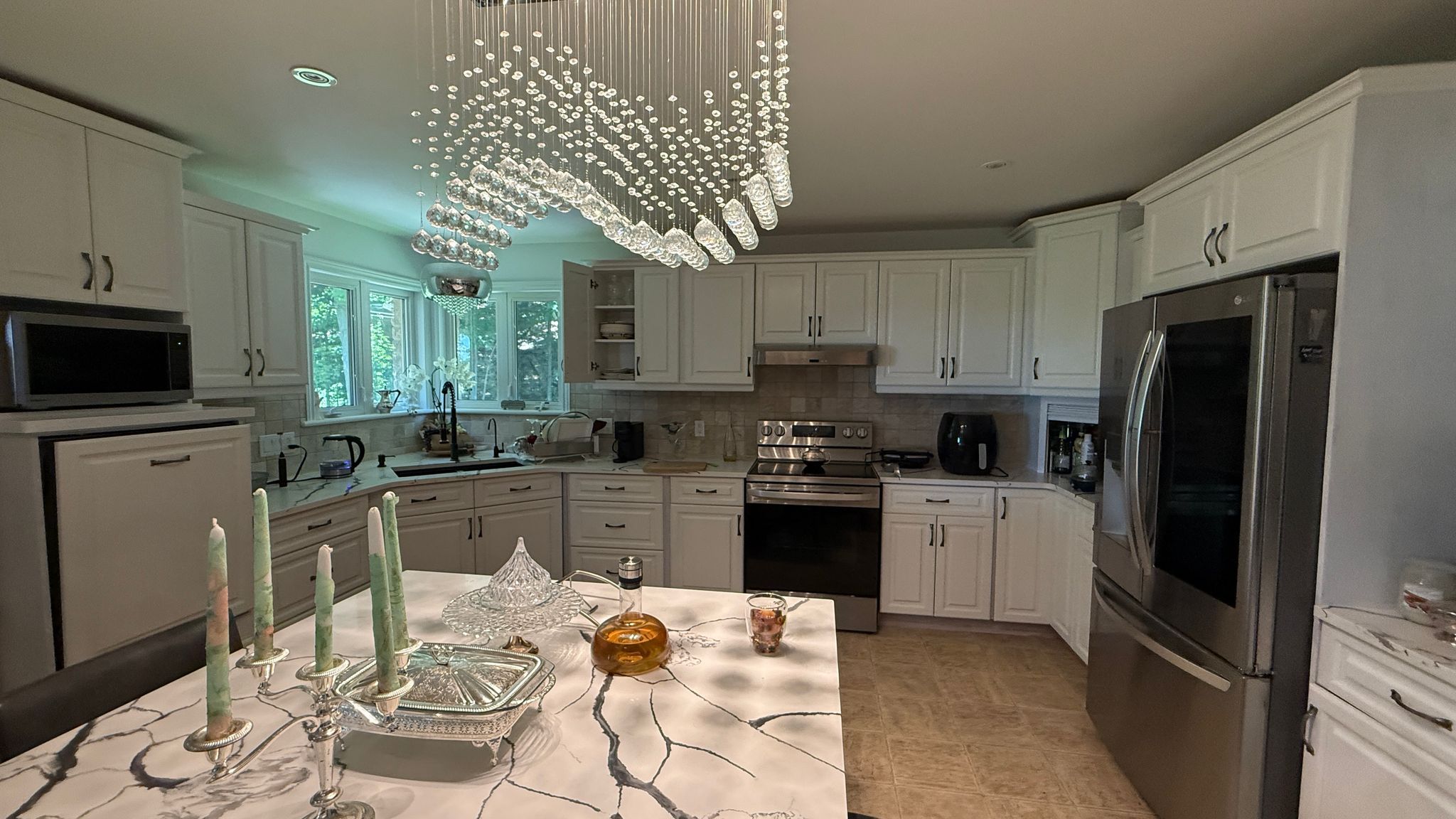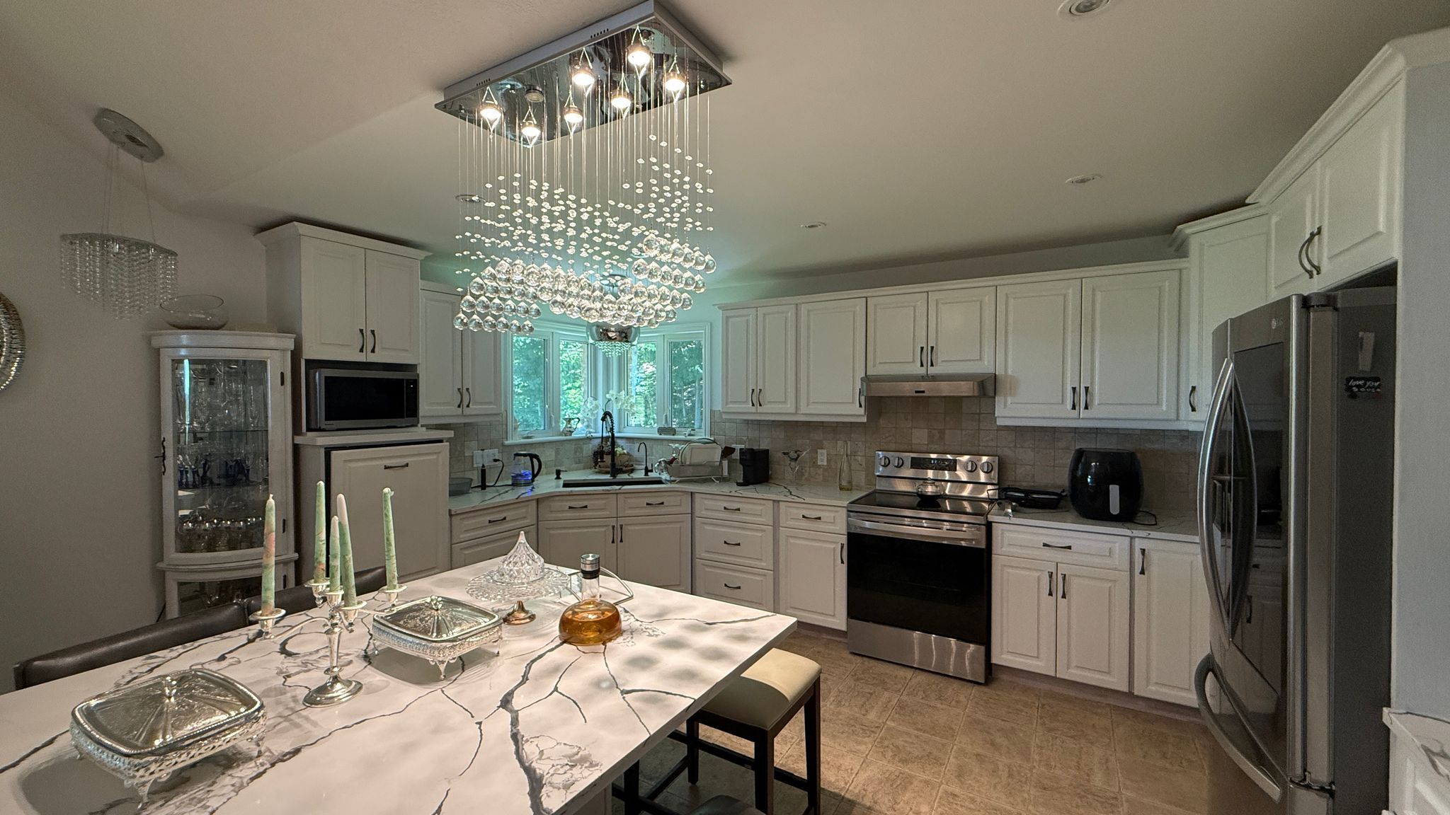 • Chef's kitchen with quartz counters and built-in appliances.