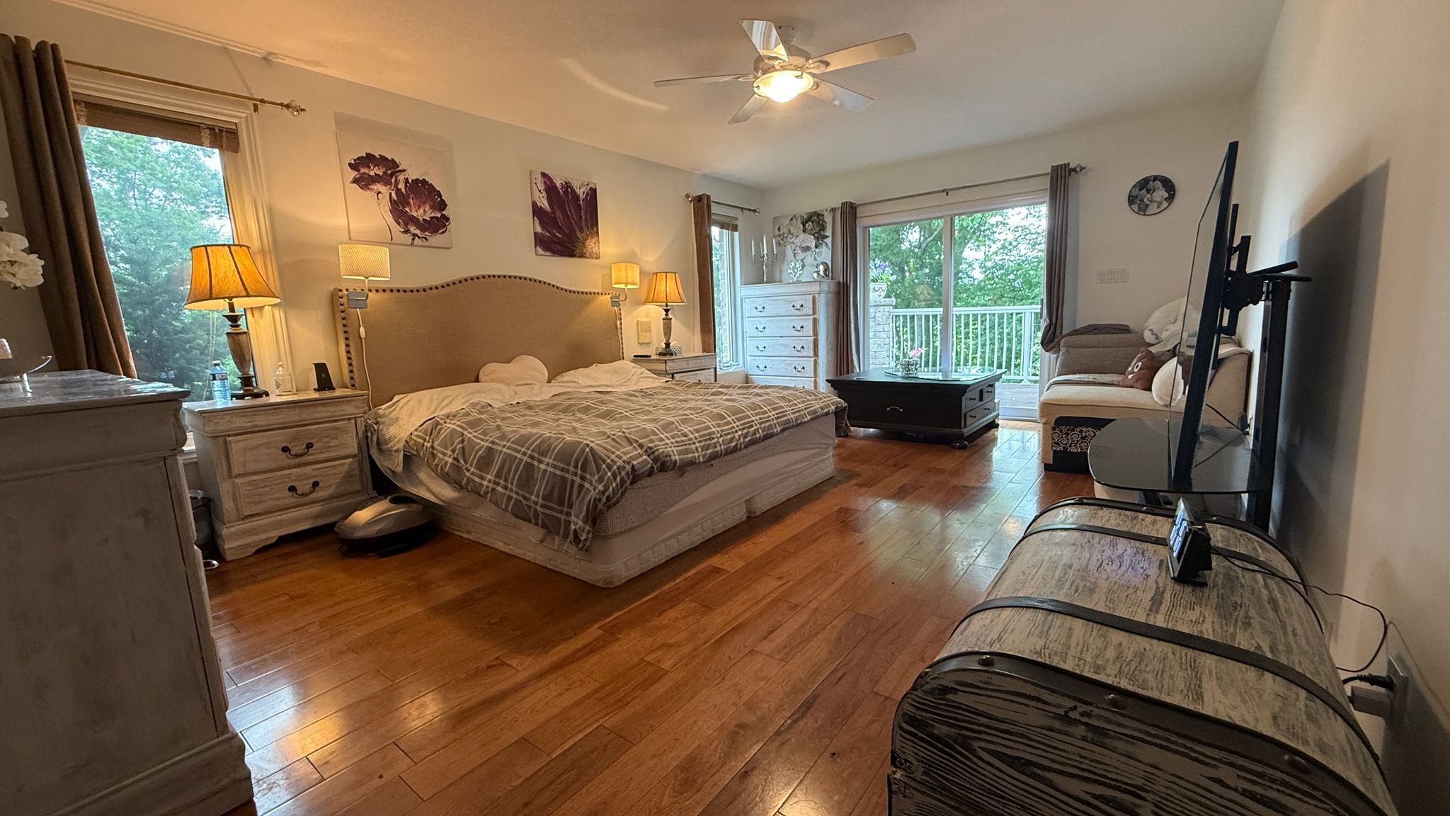• Main level has a primary retreat with ensuite and deck access.