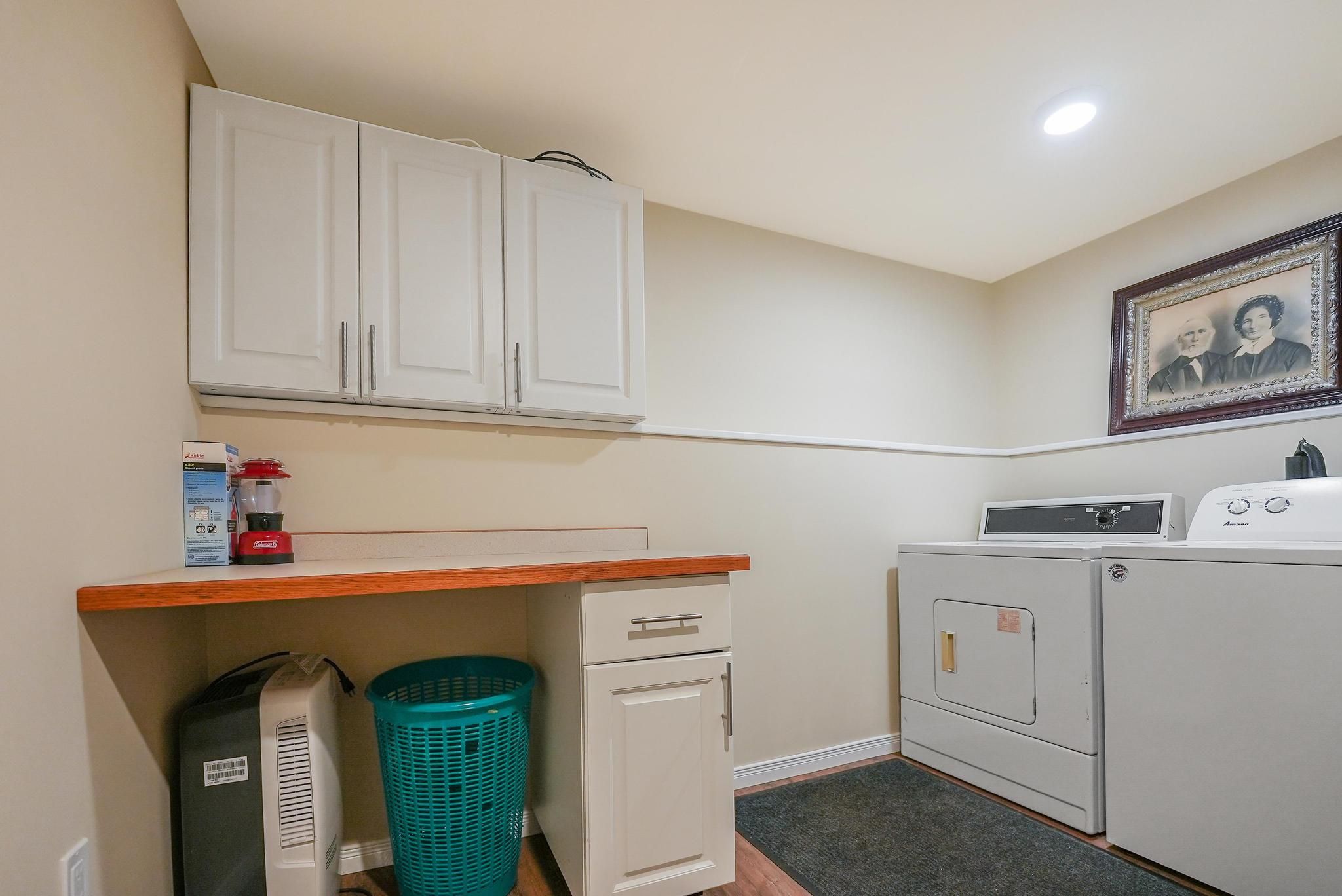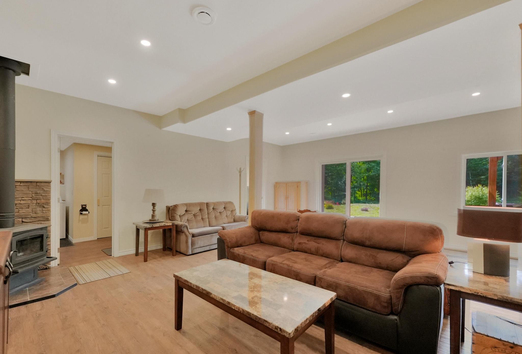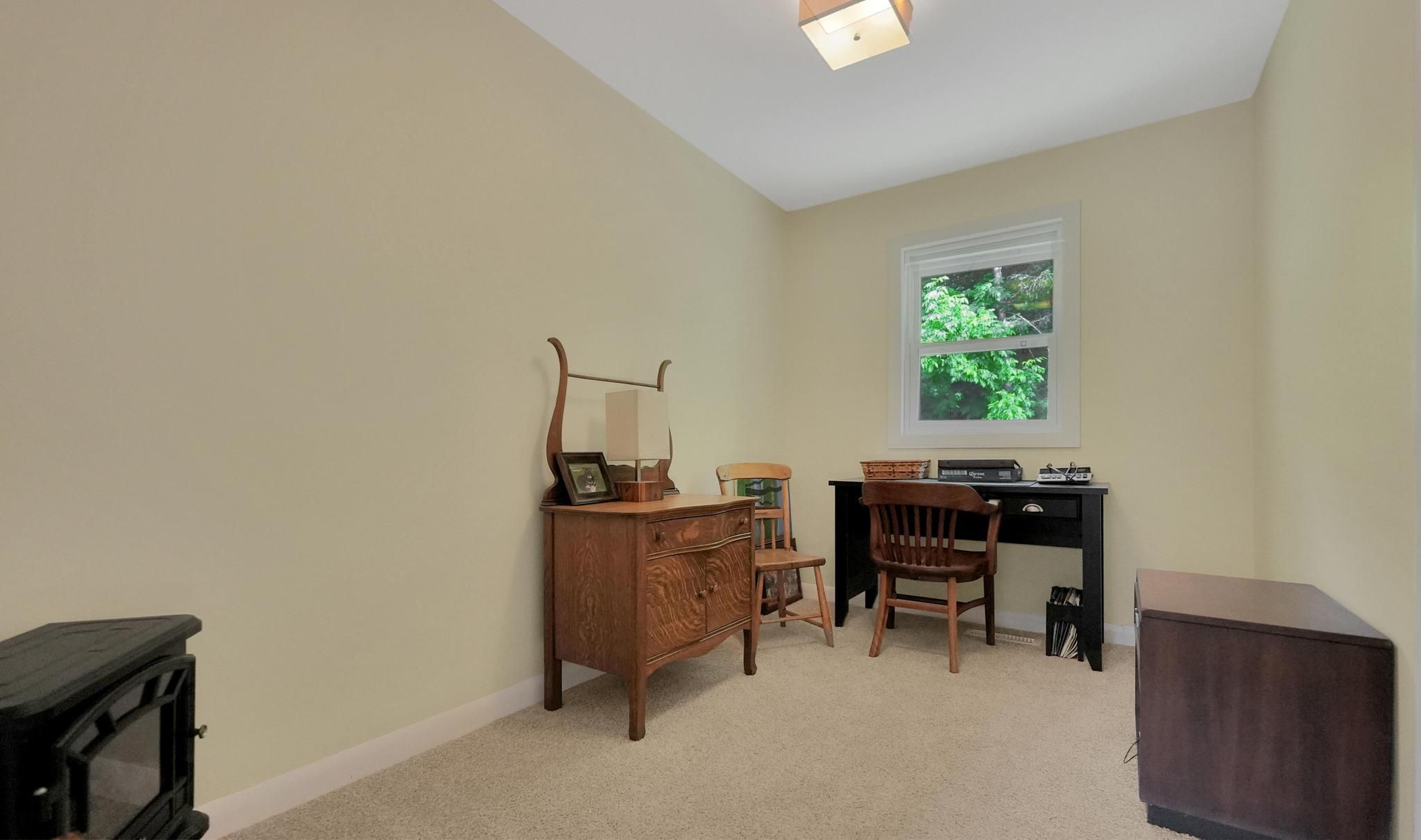 • Ground level rec room featuring high ceilings and a cozy woodstove.