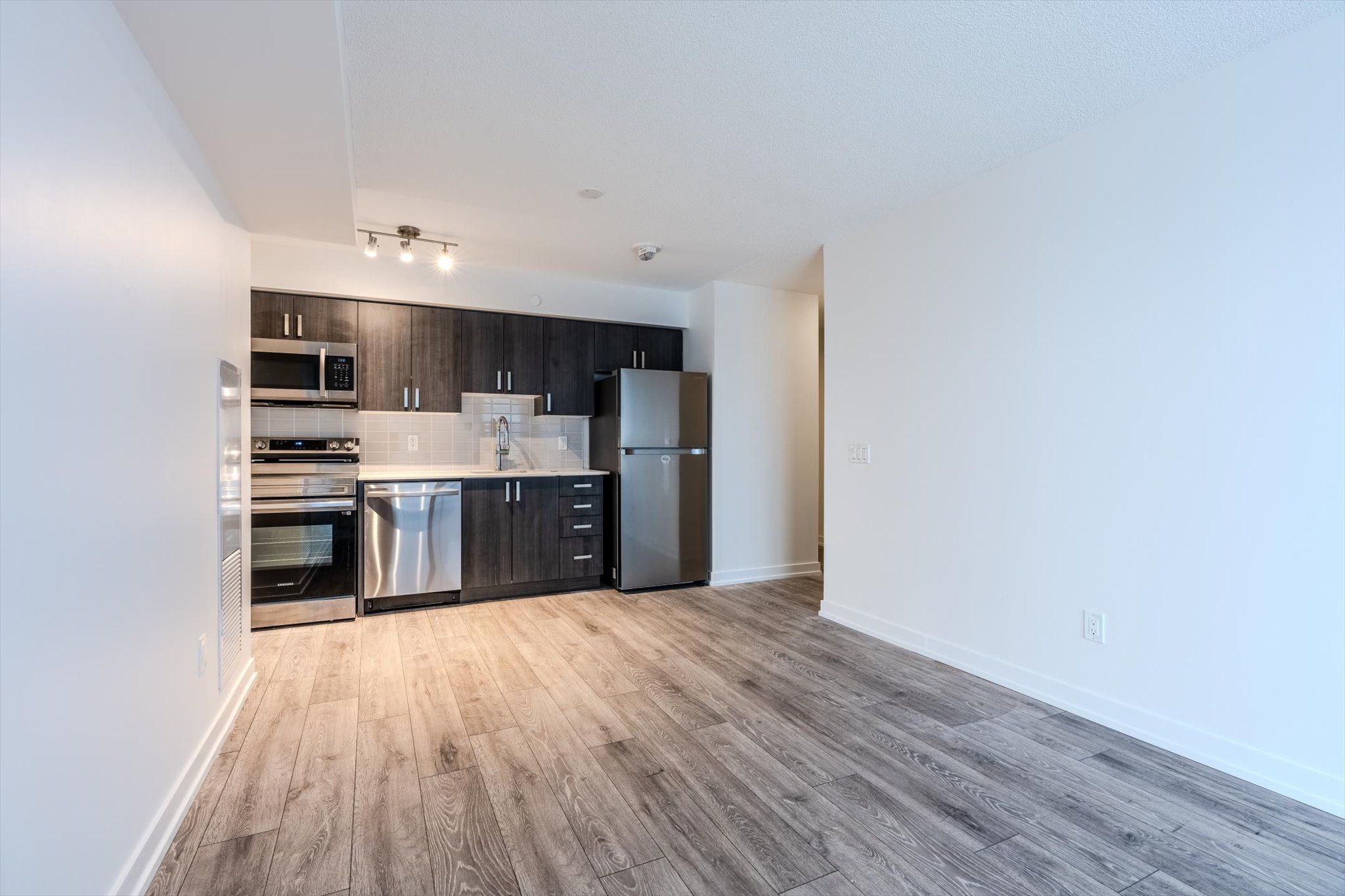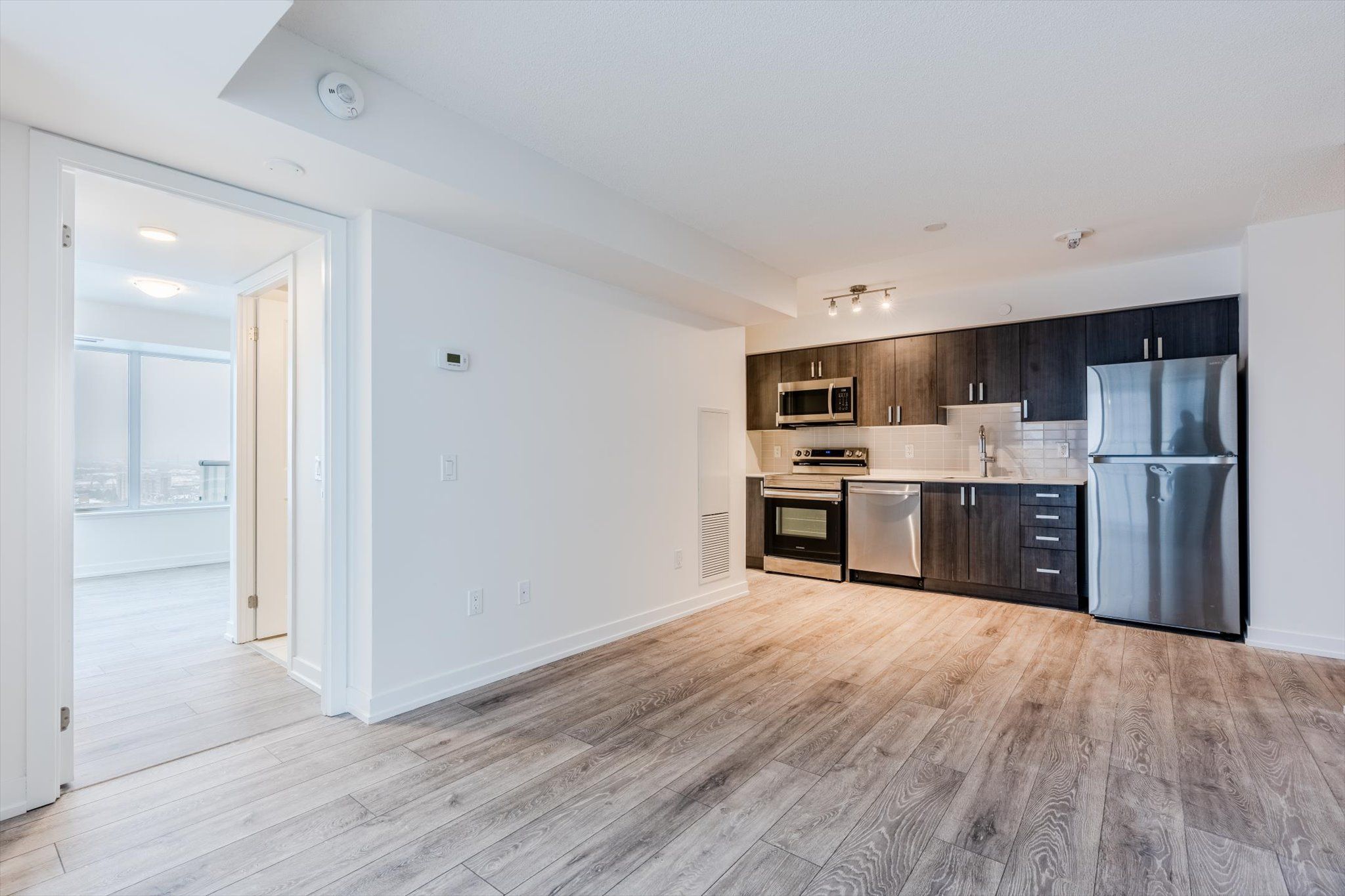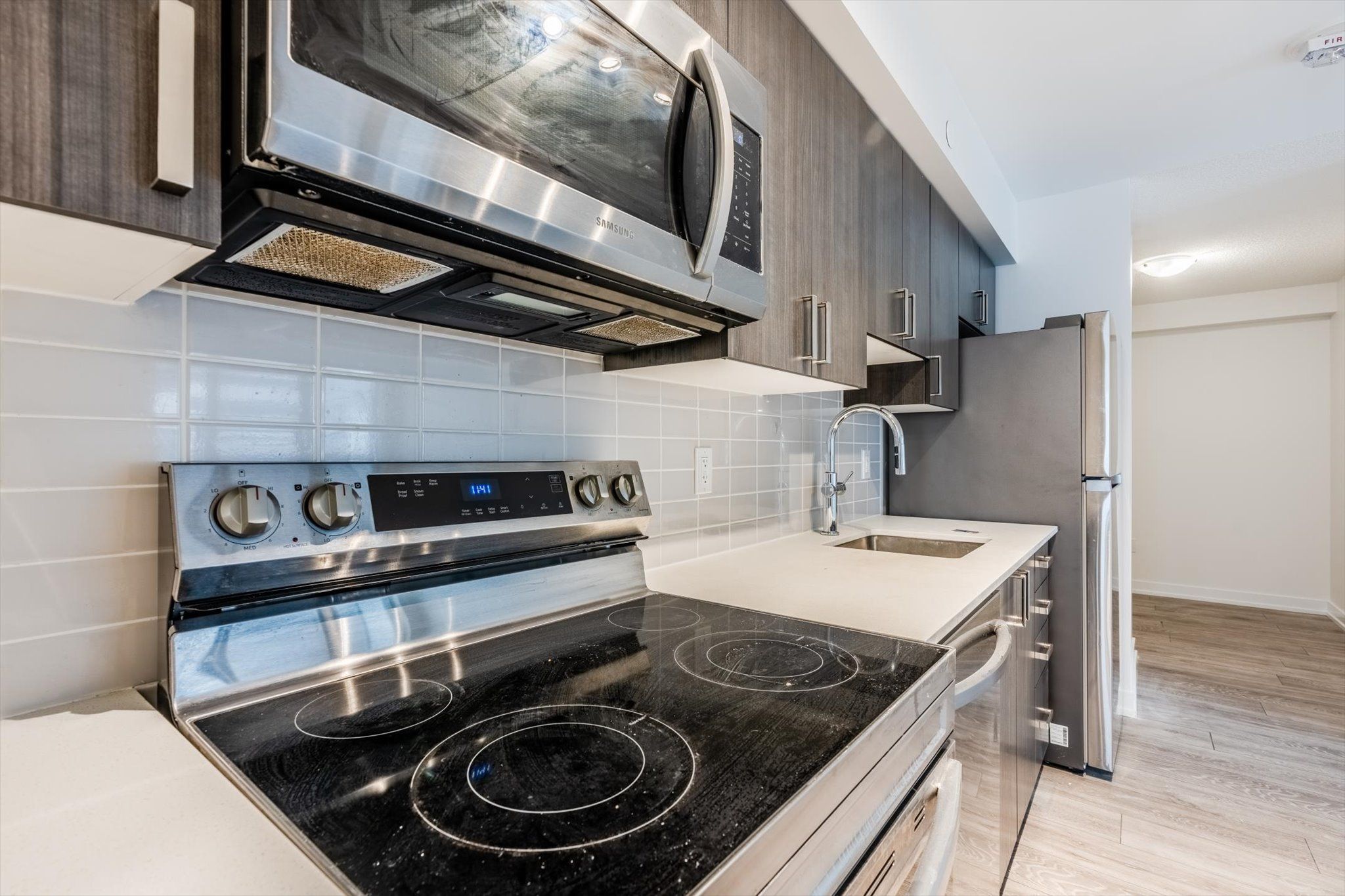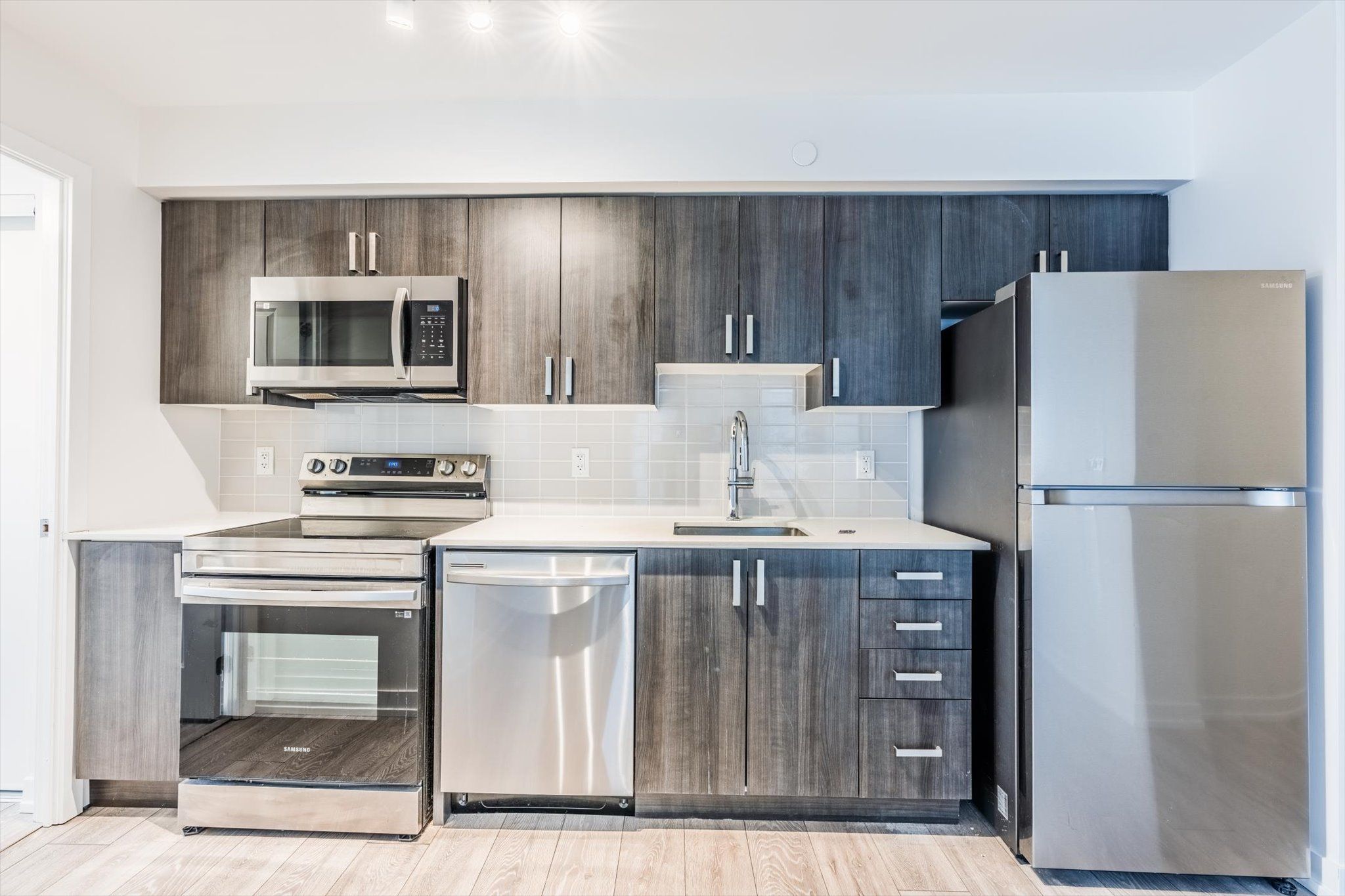 • Modern design featuring quartz countertops and laminate flooring.