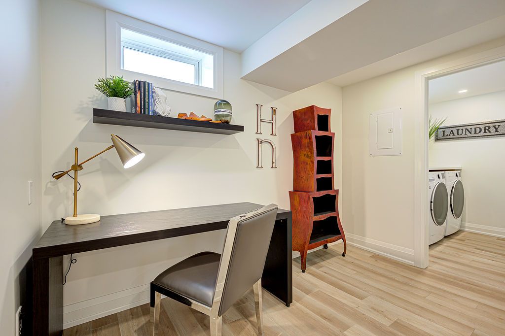 • Open concept design with a comfortable living area and office nook.