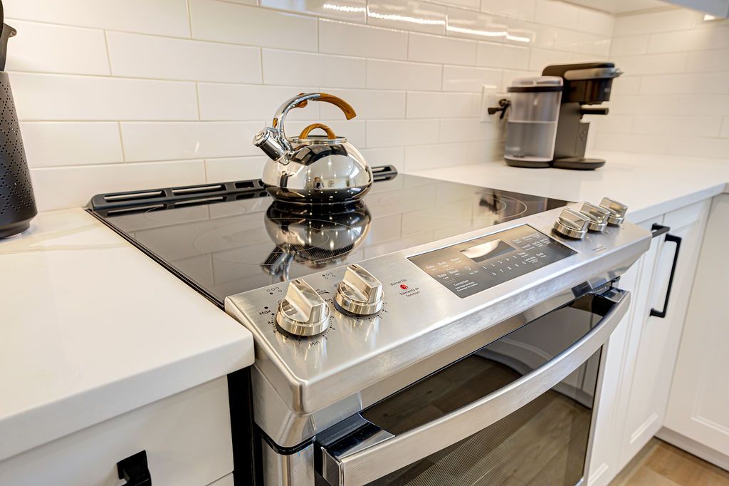 • Chef-style kitchen with premium quartz countertops and stainless-steel appliances.