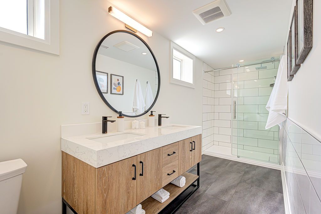 • Spa-inspired bathroom featuring a glass walk-in shower and double vanity.