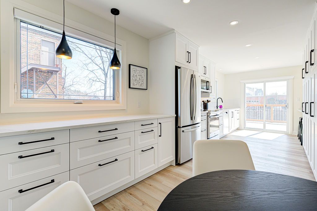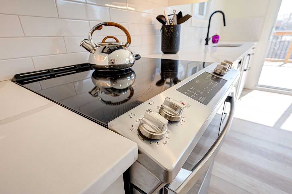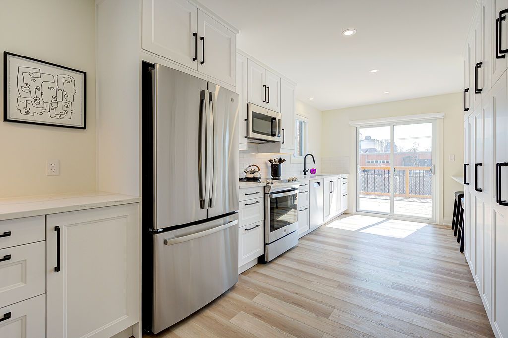 • Chef-style kitchen equipped with premium stainless-steel appliances and quartz countertops.