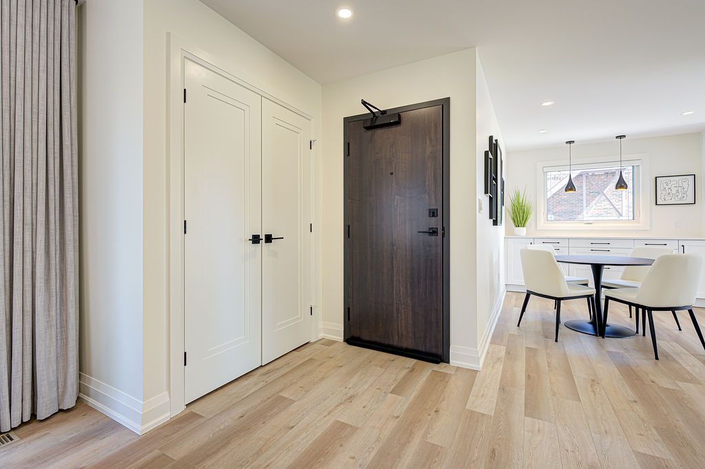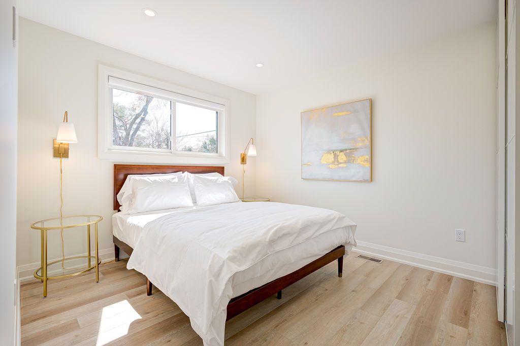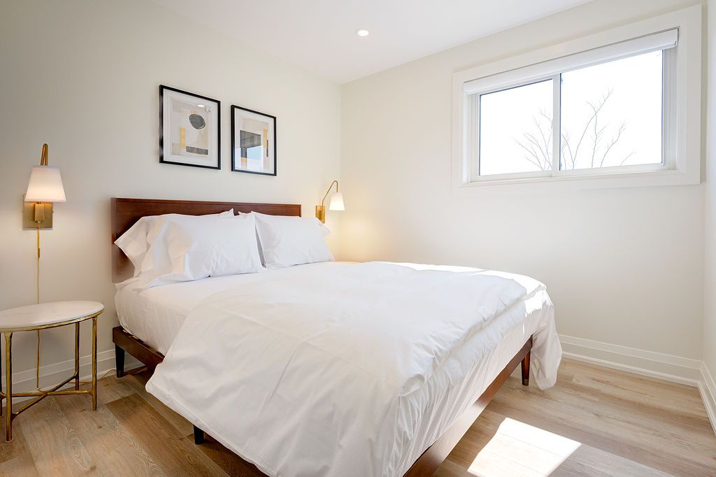 Fully furnished all inclusive short or long term rental stunning luxury 2-bedroom, 1-bathroom, main floor suite located in boutique building. Elegantly appointed and beautifully upgraded suite features a purposeful layout with wide plank luxury vinyl hardwood throughout the open concept kitchen, dining and living rooms. This bright and spacious fully furnished suite features a comfortable living space with plush sofa and chairs, glass office desk with display shelving flanking and smart tv. Enjoy the chef-style kitchen, complete with floor to ceiling white shaker cabinetry, premium quartz countertop, full-sized stainless-steel appliances, including dishwasher and built-in microwave, tile backsplash, under cabinet lighting, breakfast bar and sliding glass patio door leading to the large private deck. Bedrooms are serene with neutral colour palettes, nightstands, quality linens, and wardrobe with plenty of storage. Spa-inspired bathroom with glass walk-in shower featuring rain head, adjustable handheld shower arm, modern pedestal sink, and full-sized stackable washer and dryer. Suite includes 2 car parking. Located steps to the exquisite downtown burlington waterfront, spencer smith park, boutique shops, restaurants, qew, 403, 407 and go. No smokers, all residents must qualify to lease suite.