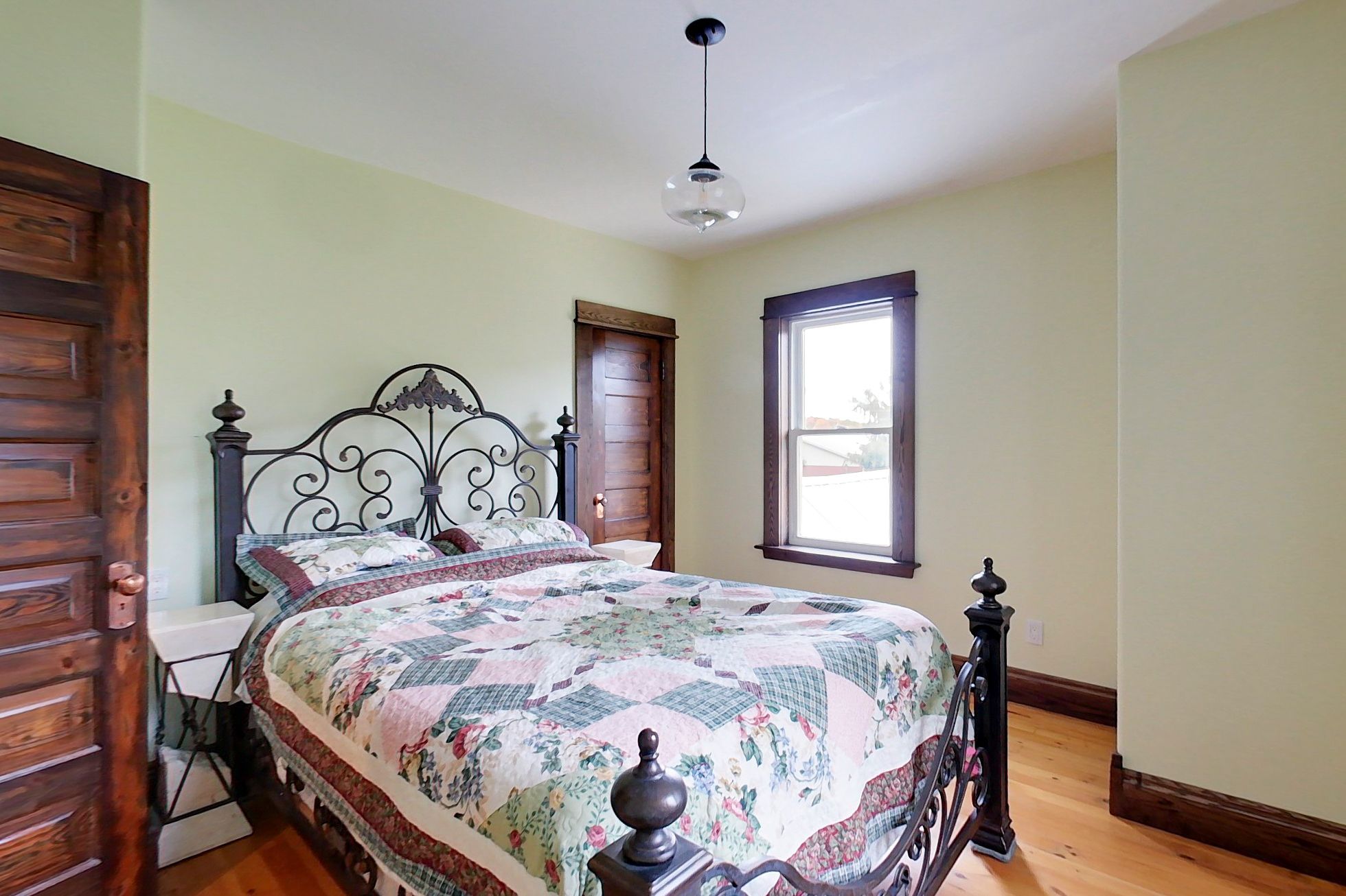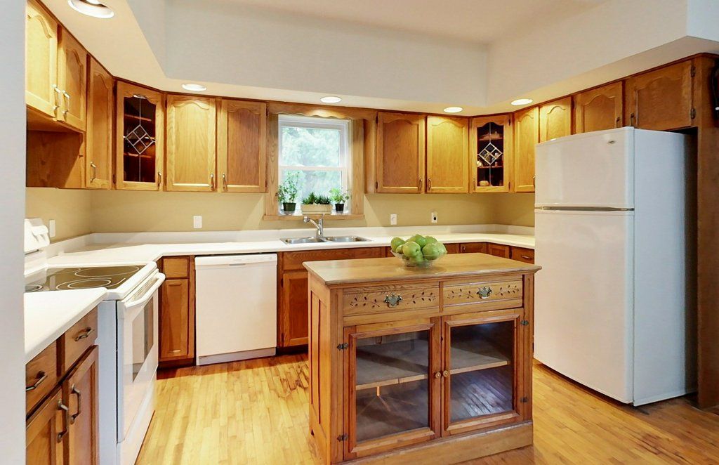 • Well-equipped eat-in kitchen featuring ample counter space and a wood stove.